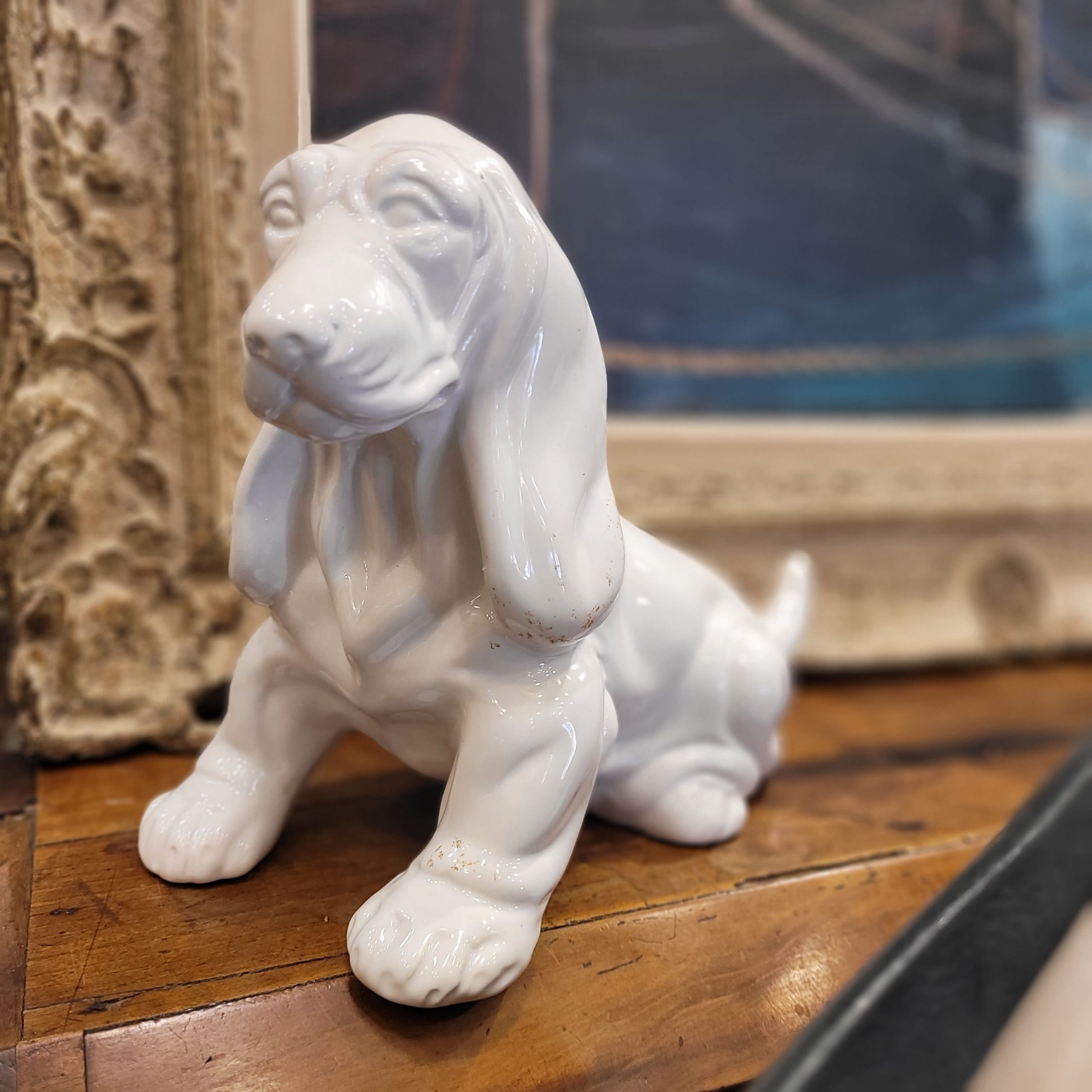 Escultura en cerámica de un cachorro de basset hound o sabueso, probablemente procedente de la Porzellan Manufaktur Allach (1935-1945).