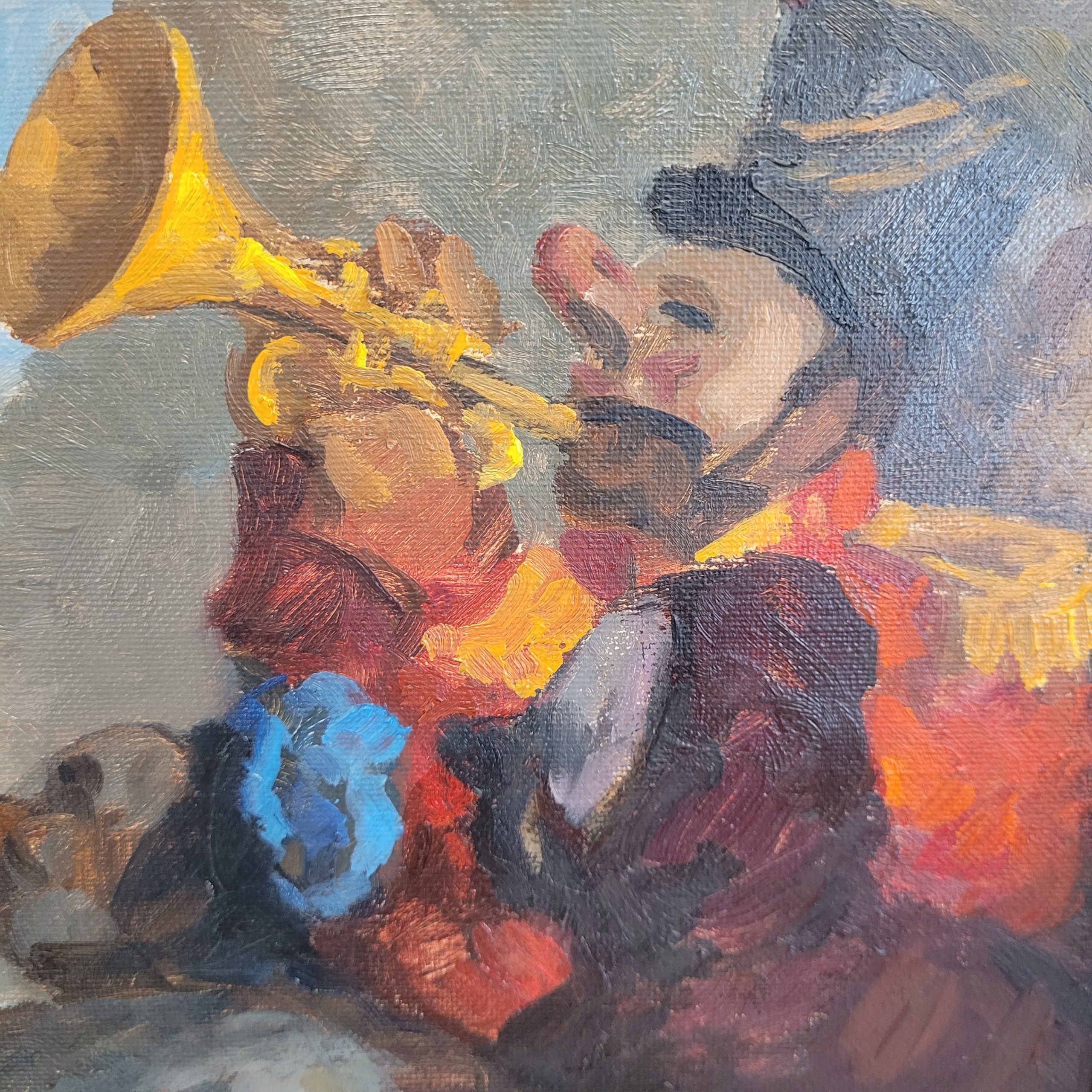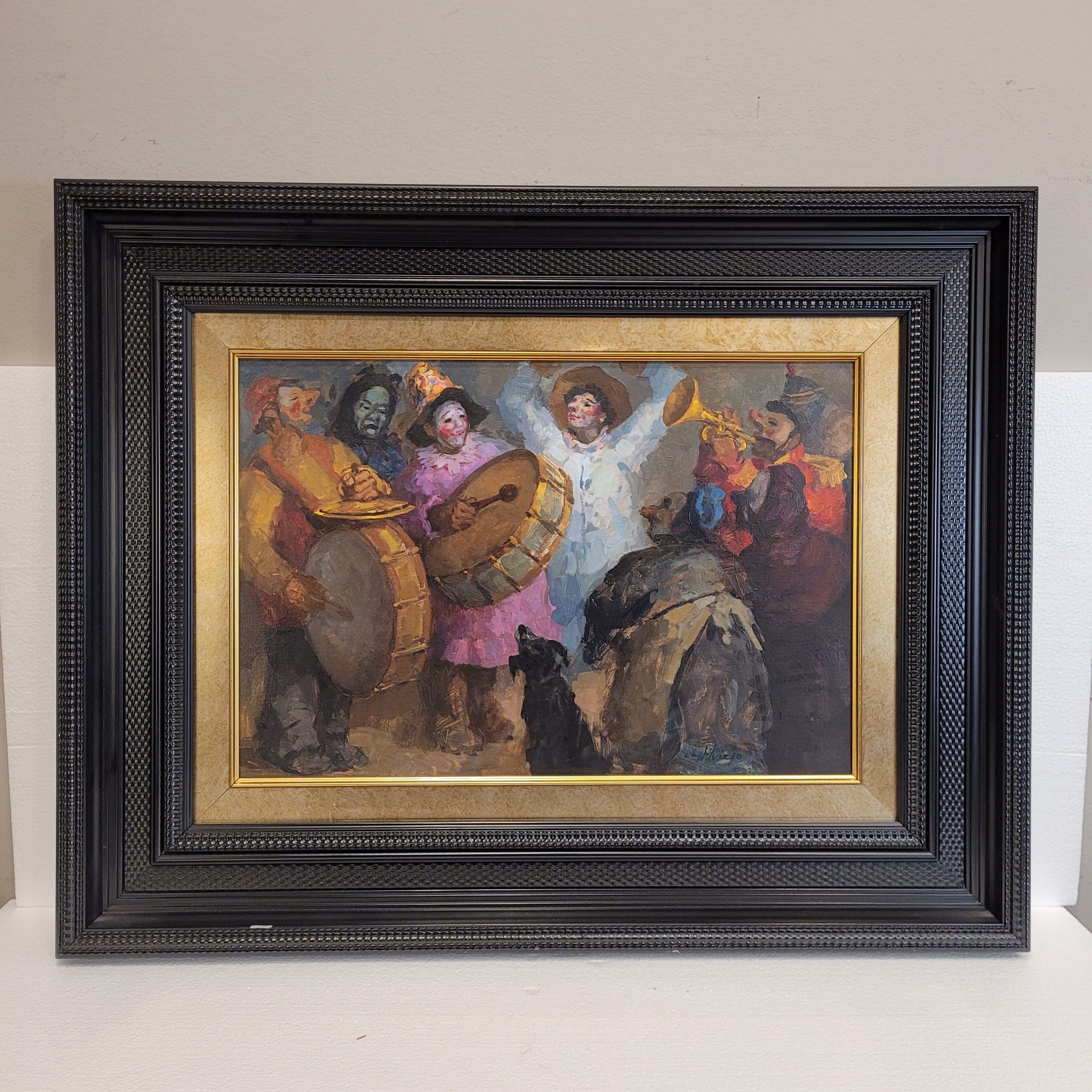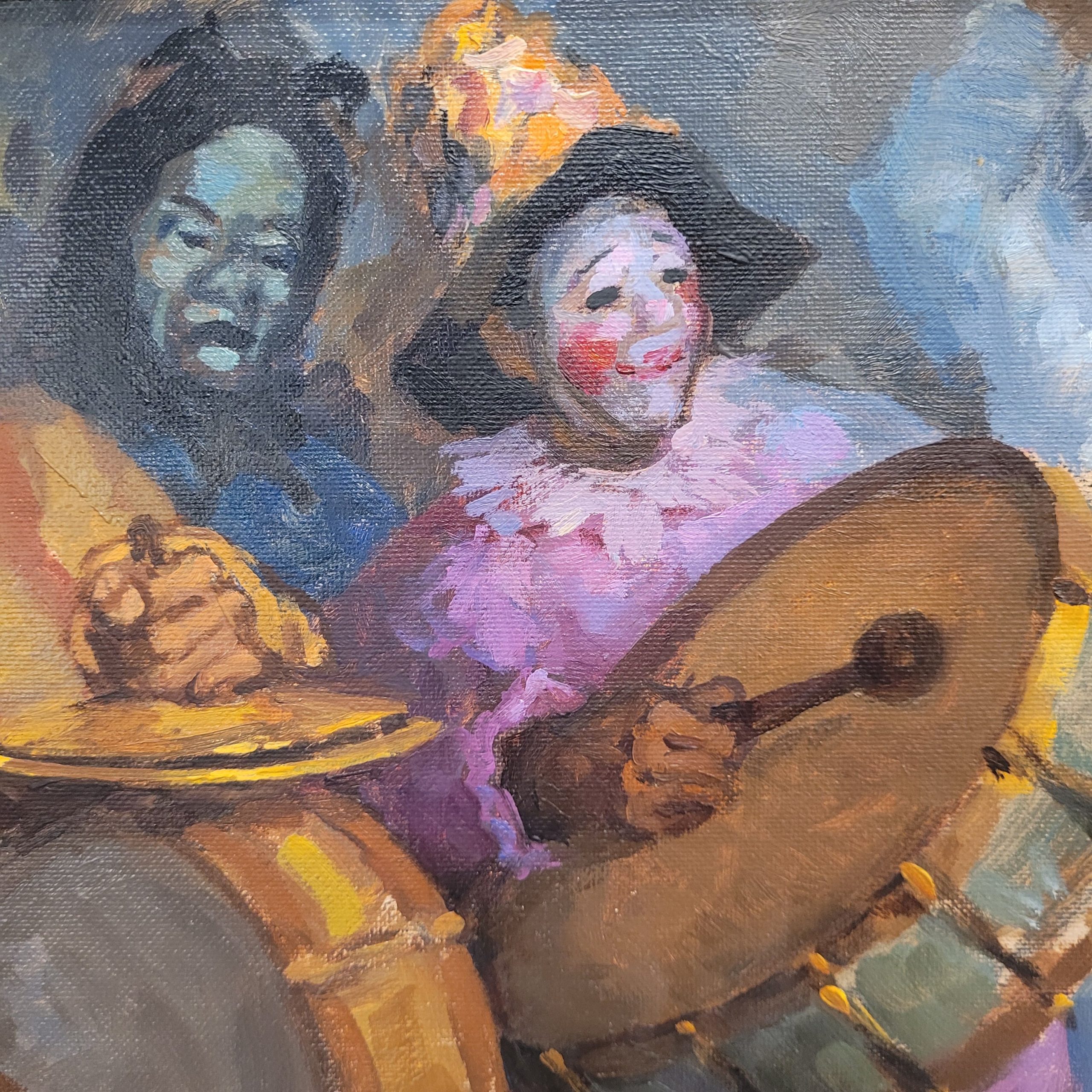 Se muestra a un grupo de músicos o “saltimbanquis” en lo que parece ser una celebración de carnaval o circo, en una atmósfera envolvente, que atrae al espectador a disfrutar del espectáculo. Castilviejo es especialmente reconocido por dedicar su obra a mostrar la realidad de Castilla y sus habitantes, su cultura y tradiciones, utilizando para ello una pincelada suelta pero controlada, y el experto uso de la luz para crear texturas y atmósferas. Emplea una amplia gama de colores en diferentes tonalidades, creando contrastes lumínicos y sombreados para dar forma a las figuras, prescindiendo del dibujo, pero sin dejar que se pierdan las líneas.