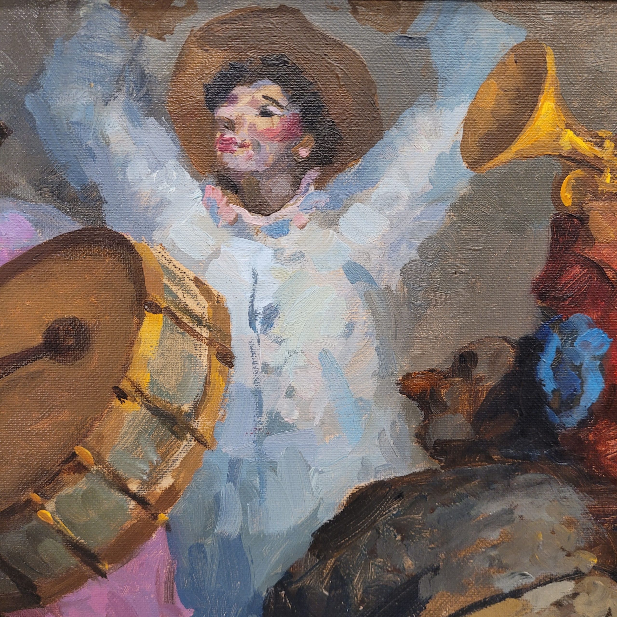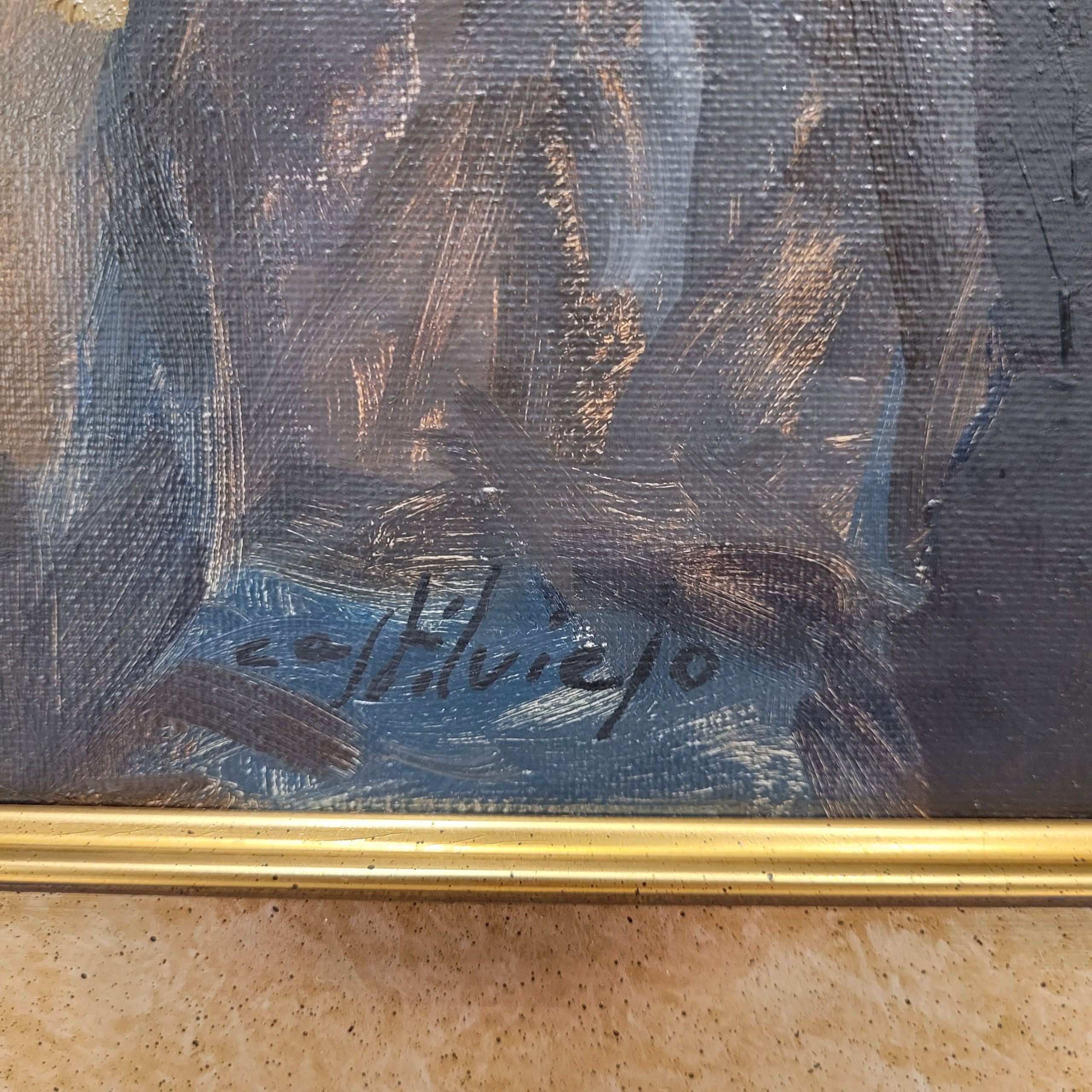 Maravilloso óleo sobre lienzo firmado por el artista José María García Fernández, conocido como “Castilviejo”, a mediados del siglo XX. Representa una escena costumbrista, de temática carnavalesca, a la que dedicó toda una colección hacia la década de 1960.