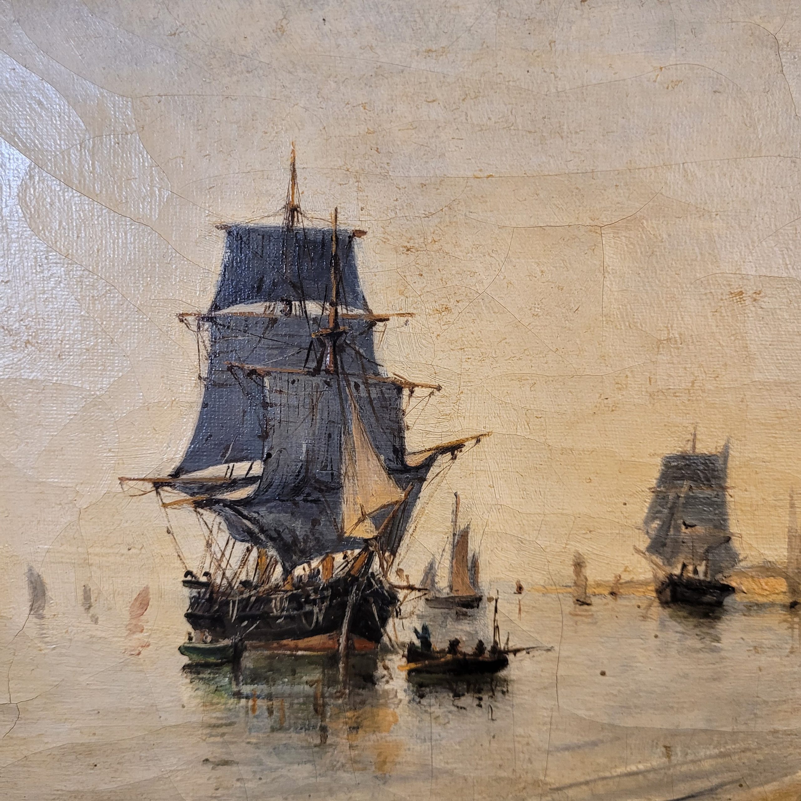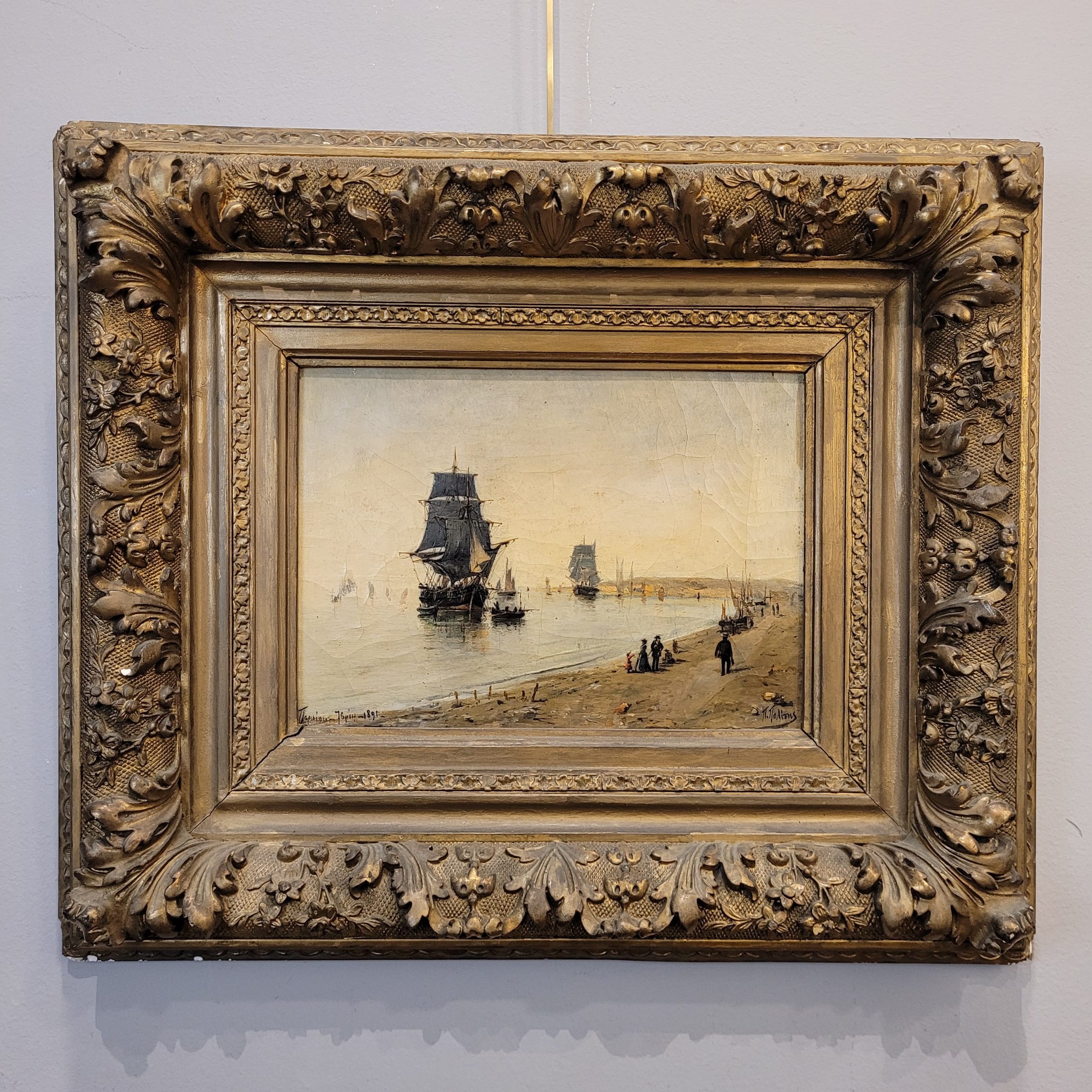 Espectacular óleo sobre lienzo, titulado “El barco Hybris en el Pireo”, escuela o círculo de Konstantinos Volanakis, firmado y fechado en el Pireo en 1891.
