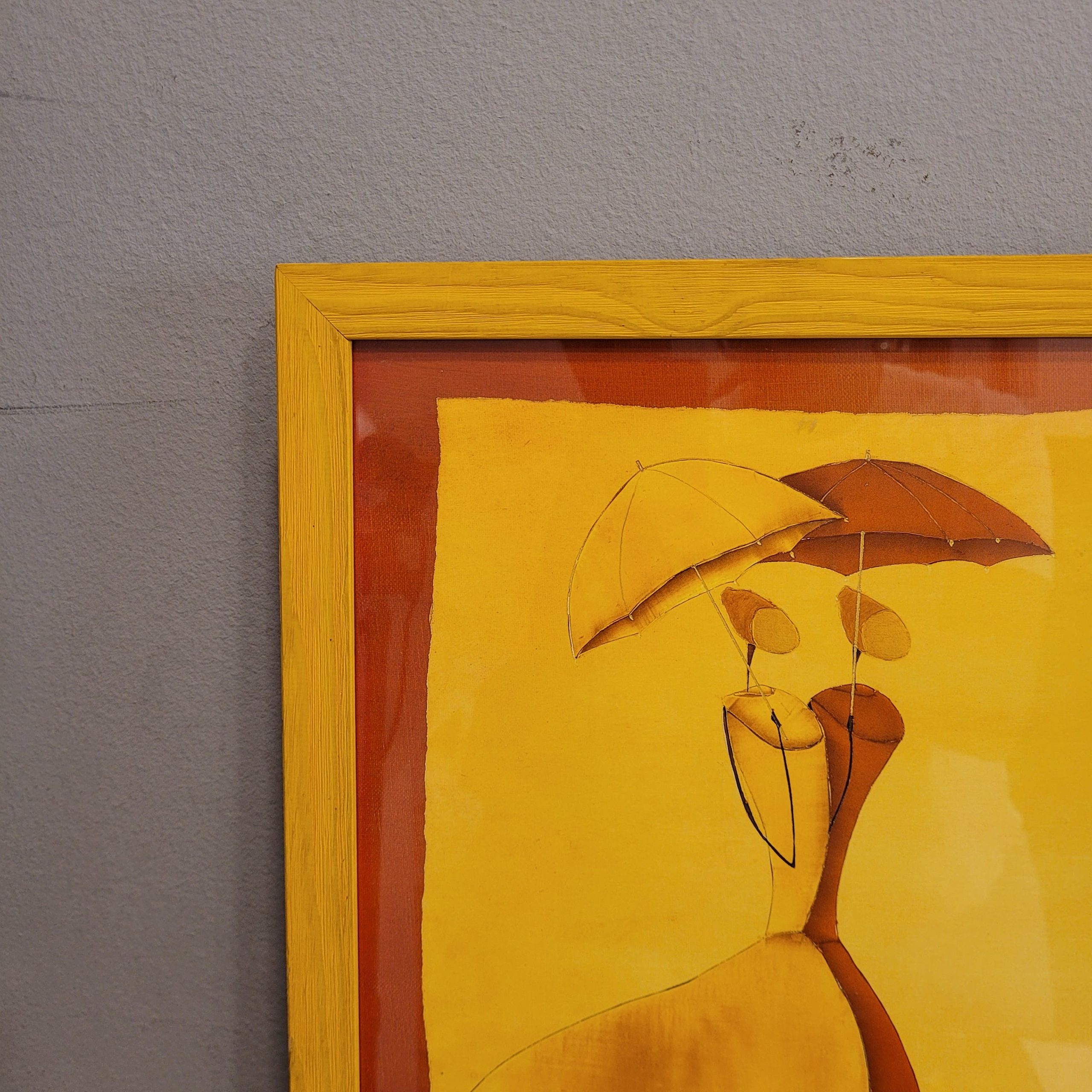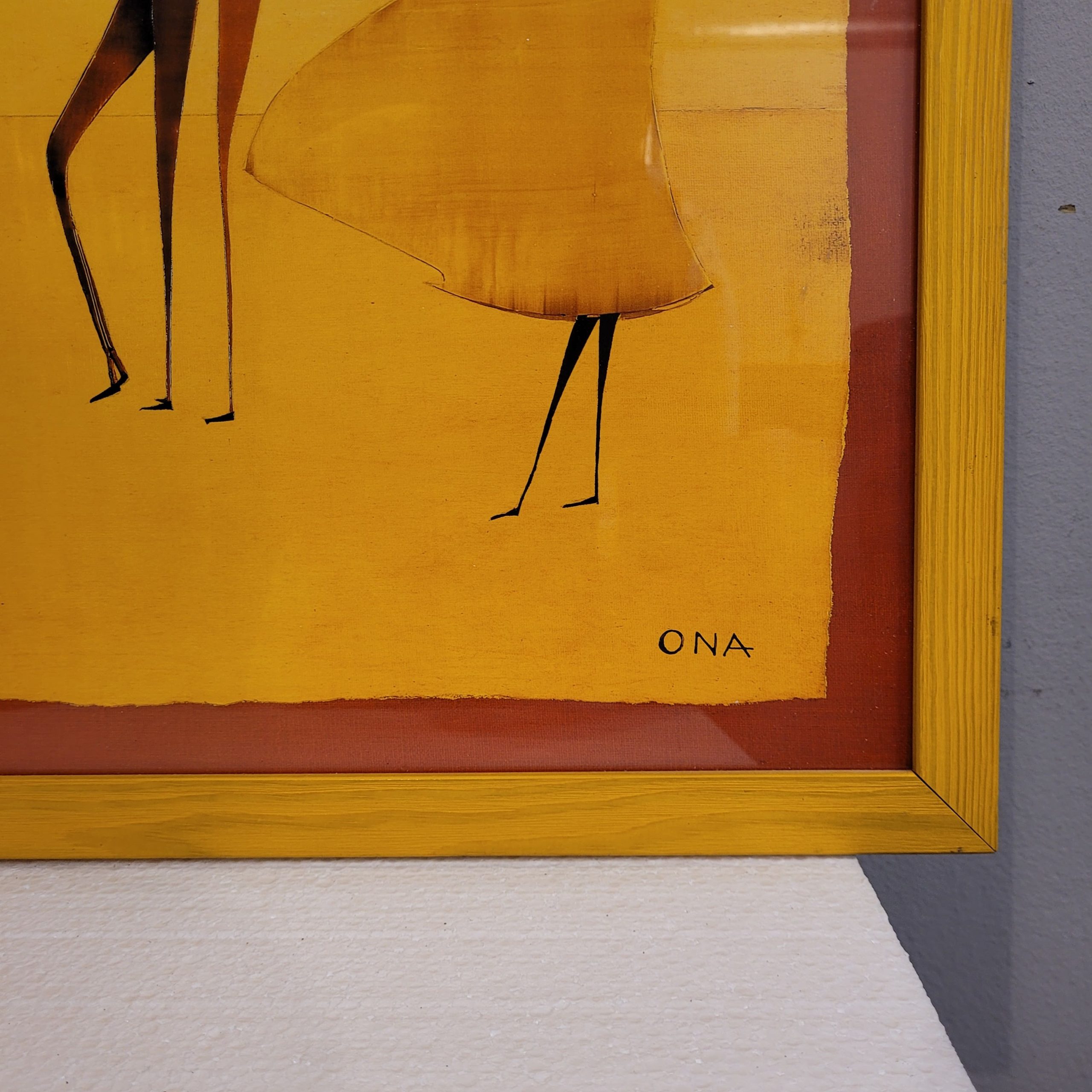 Marco realizado en madera clara de borde sencillo, lo que deja lucir la imagen sin recargarla. Está firmado en el ángulo inferior derecho con la firma “ONA”. La obra se inscribe plenamente en la característica estética de Thierry Ona: predominio del color cálido, economía de detalles, figuras alargadas y una pesada atmósfera emocional. Pintor francés nacido en Burdeos en 1960. Su trayectoria artística, iniciada tras su formación como arquitecto paisajista, se define por una paleta de colores cálidos y brillantes, una factura depurada y figuras estilizadas que evocan movimiento, elegancia y un mensaje profundo.