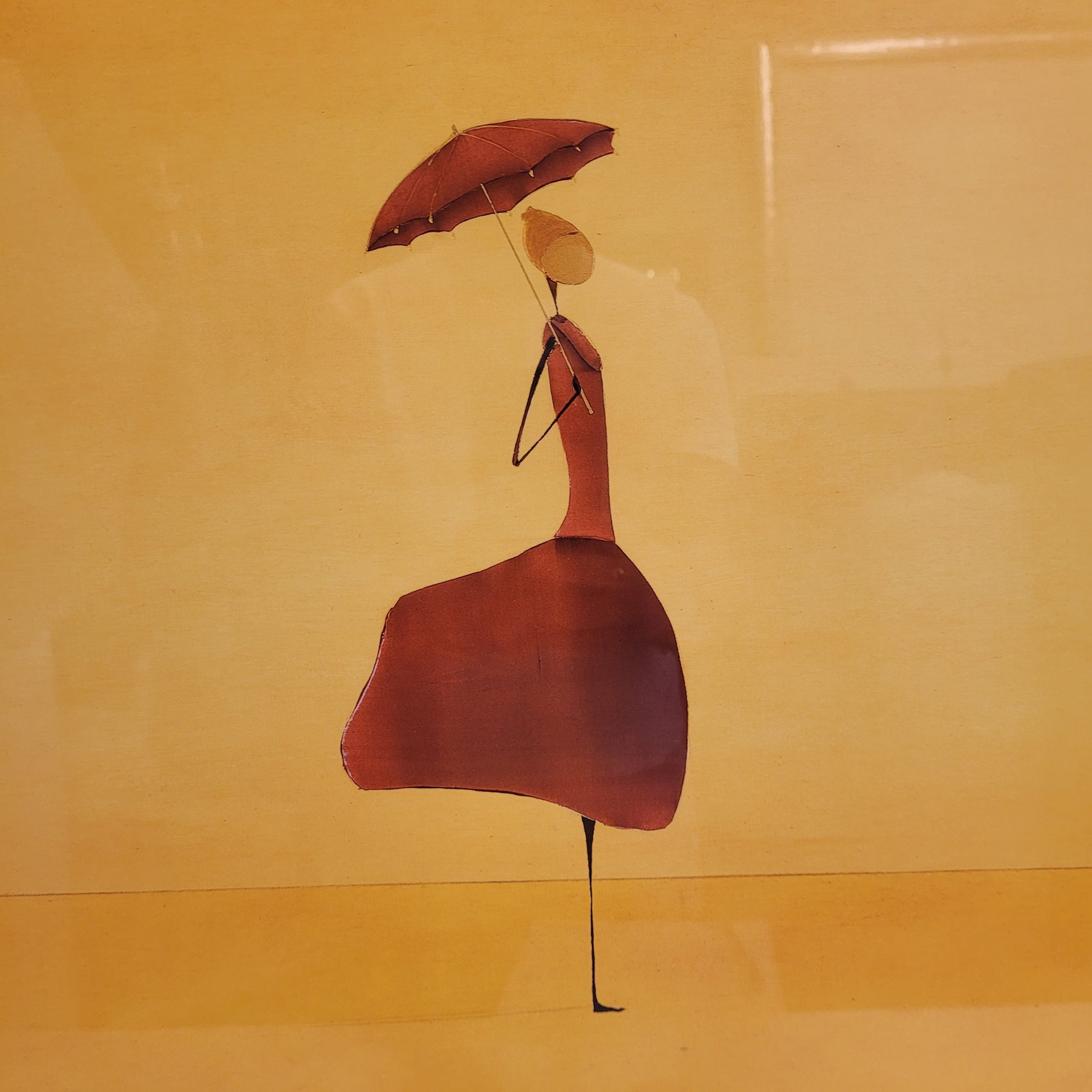 Elegante litografía que representa “Flanerie III” del artista francés Thierry Ona. Esta obra presenta un fondo dorado tendido que invita al silencio, sobre el cual se despliegan siete figuras esbeltas vestidas de tonos tierra que sostienen paraguas: una pareja a la izquierda, una figura solitaria en el centro en segundo plano, tres figuras masculinas y a la derecha una última mujer solitaria. La escena, de composición equilibrada y ritmo pausado, transmite una ambiente de paseo o momento contemplativo. Los esbeltos contornos y el tratamiento dibujístico de las siluetas, y la sutileza del color, crean una escena elegante y calmada.
