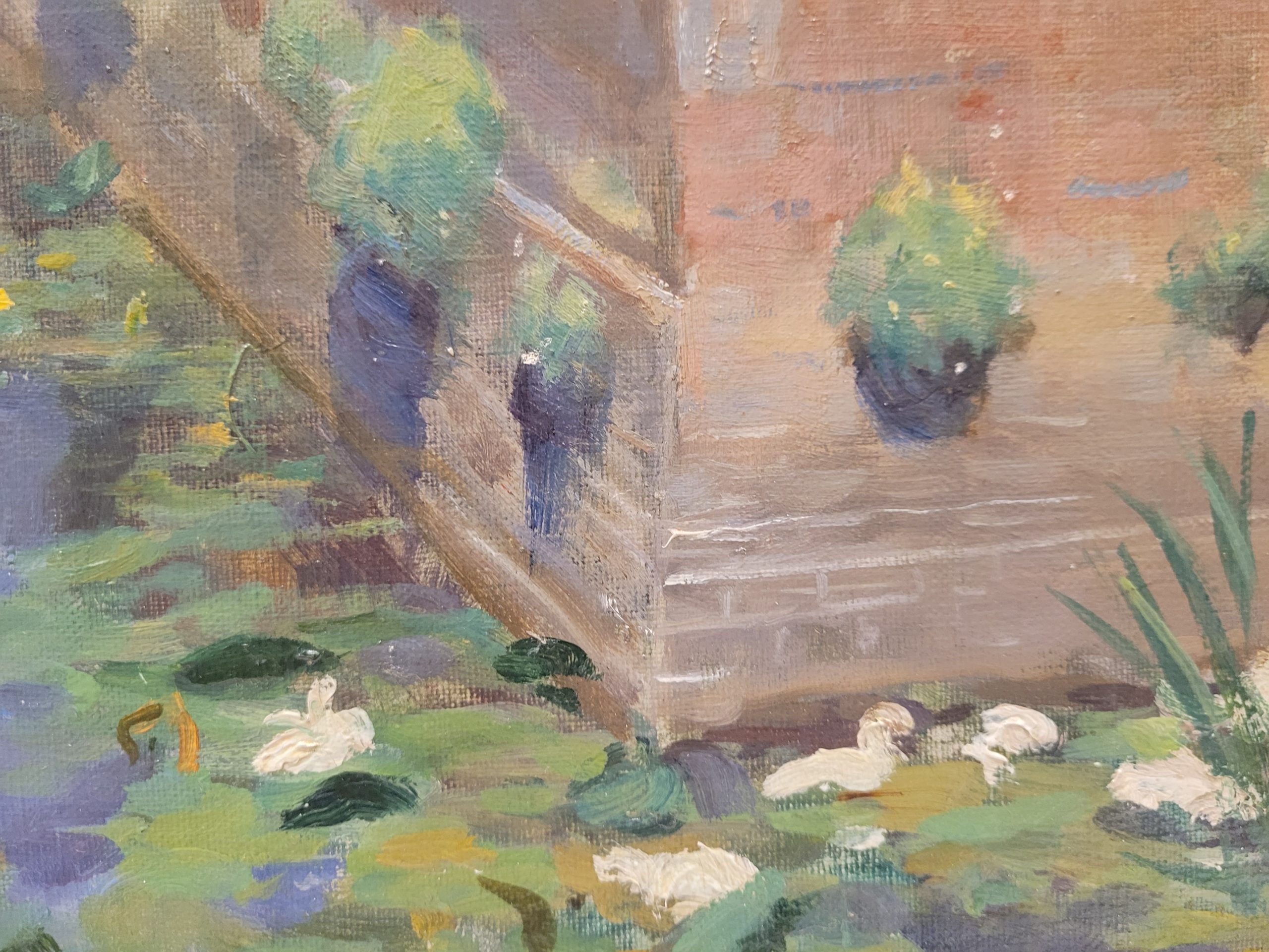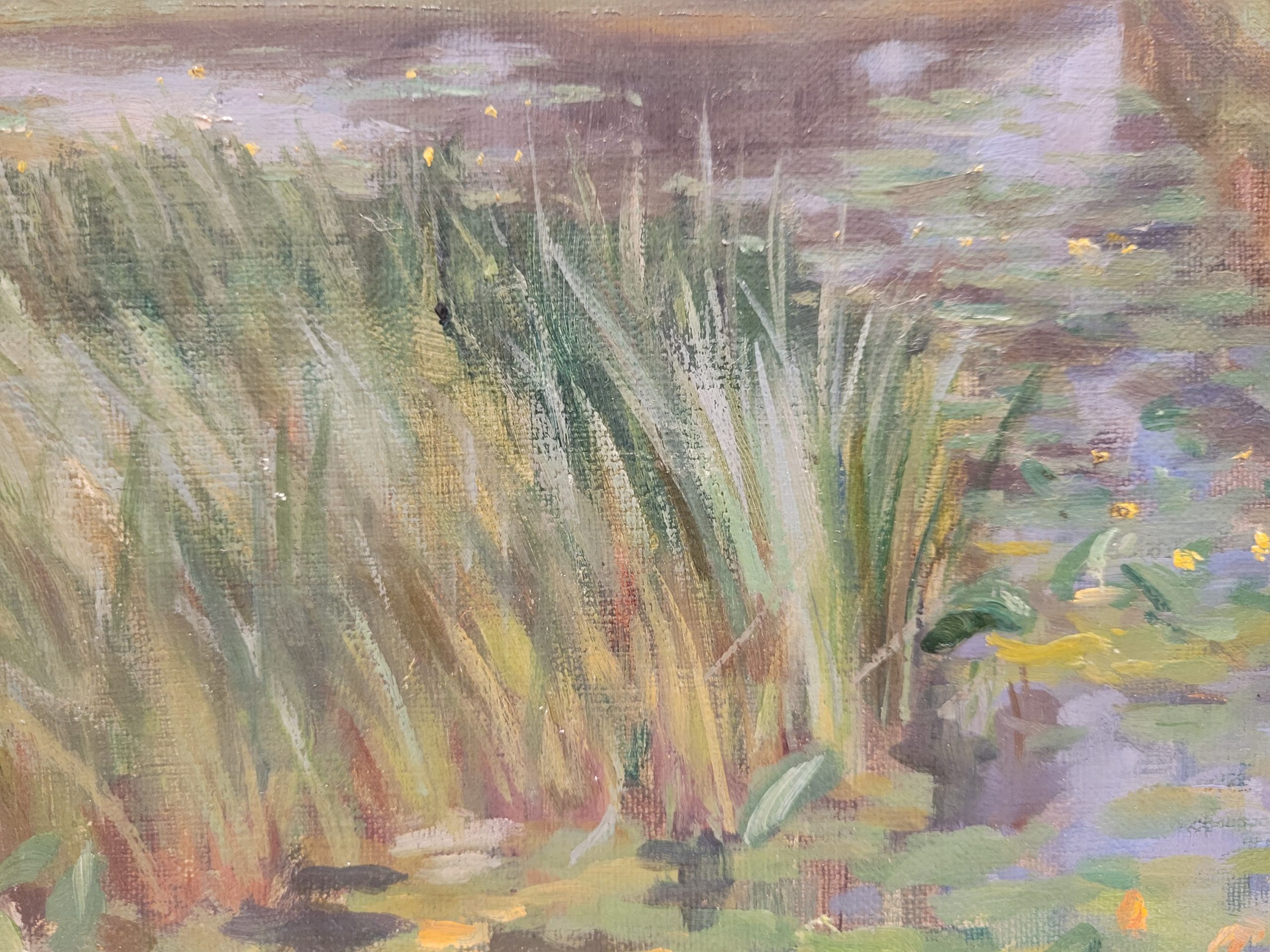 Delicado óleo sobre lienzo, adherido a tabla, de factura impresionista que representa a un pescador sobre el borde de un río, a las afueras de un pueblo rodeado de vegetación, que se extiende incluso sobre la superficie del agua. El artista, valiéndose de una pincelada rápida y suelta logra captar la luz cambiante del paisaje, y la perspectiva en ángulo aporta dinamismo y a la composición.