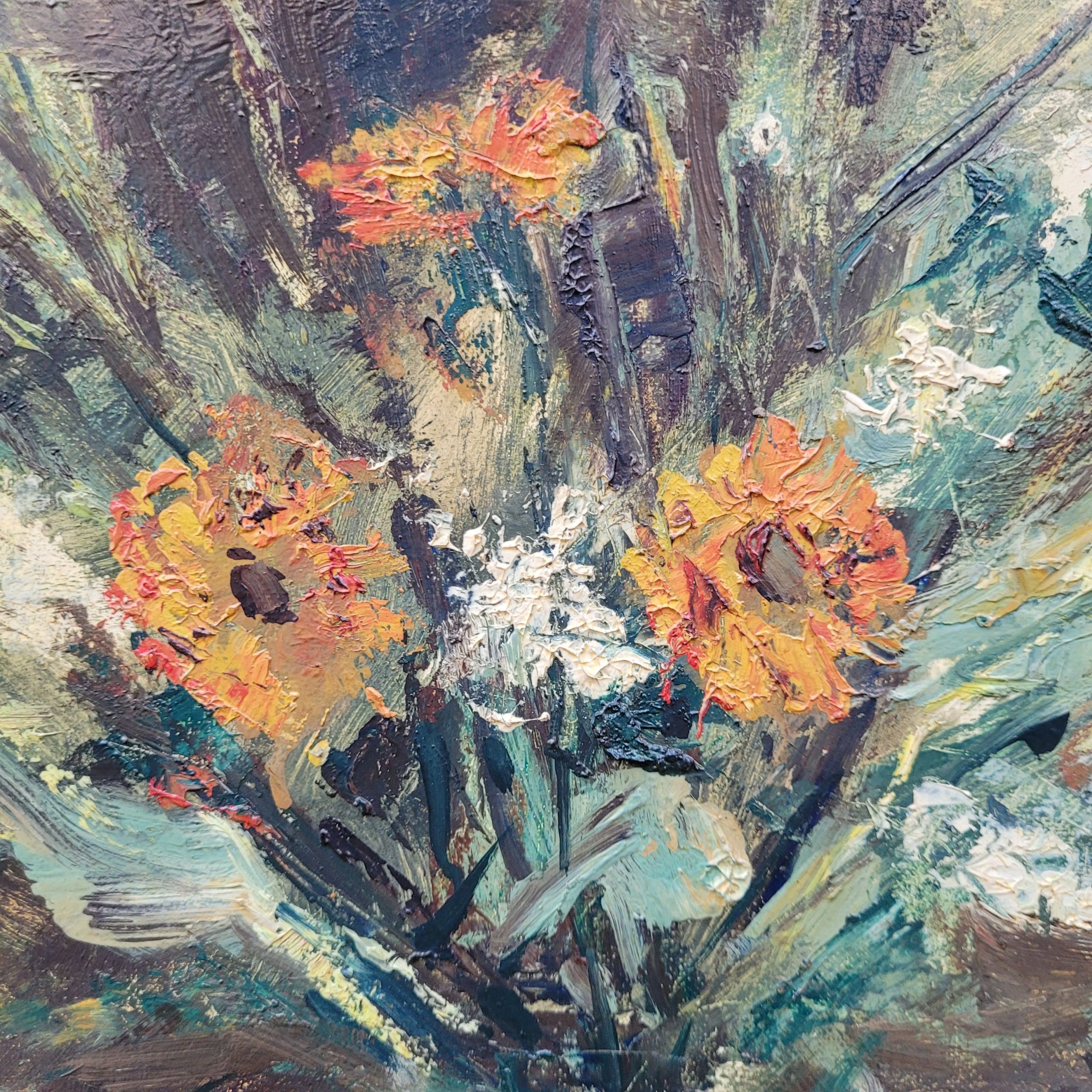 La obra, como es común en su género, destaca por la sobriedad de su composición. El fondo es neutro, oscuro, y los distintos elementos se disponen sobre una superficie entelada. En la parte superior, sobre un pequeño pedestal, un jarrón con un exuberante ramo floral. En primer plano, una venera y una pequeña talla de la Virgen con el niño.