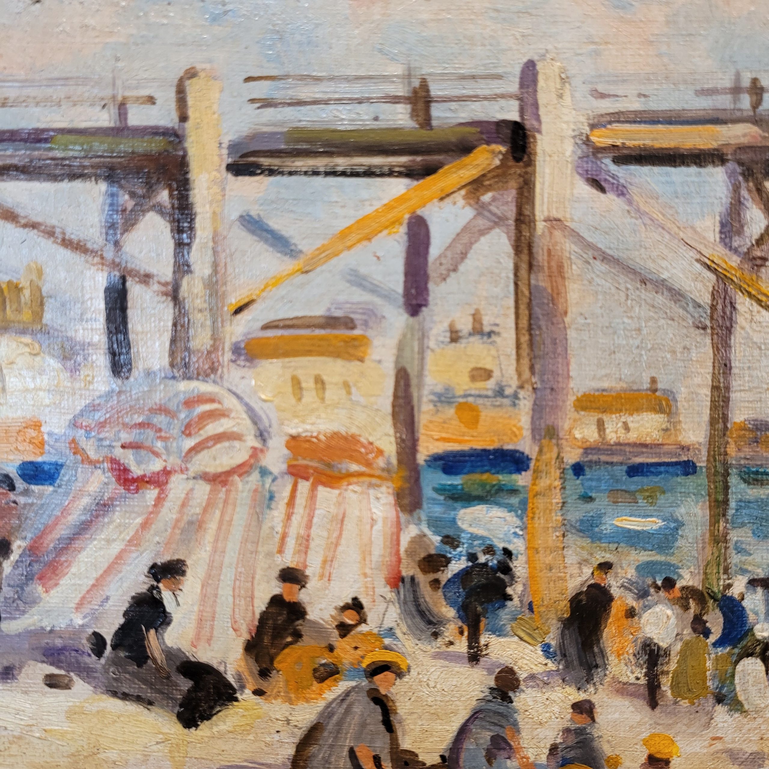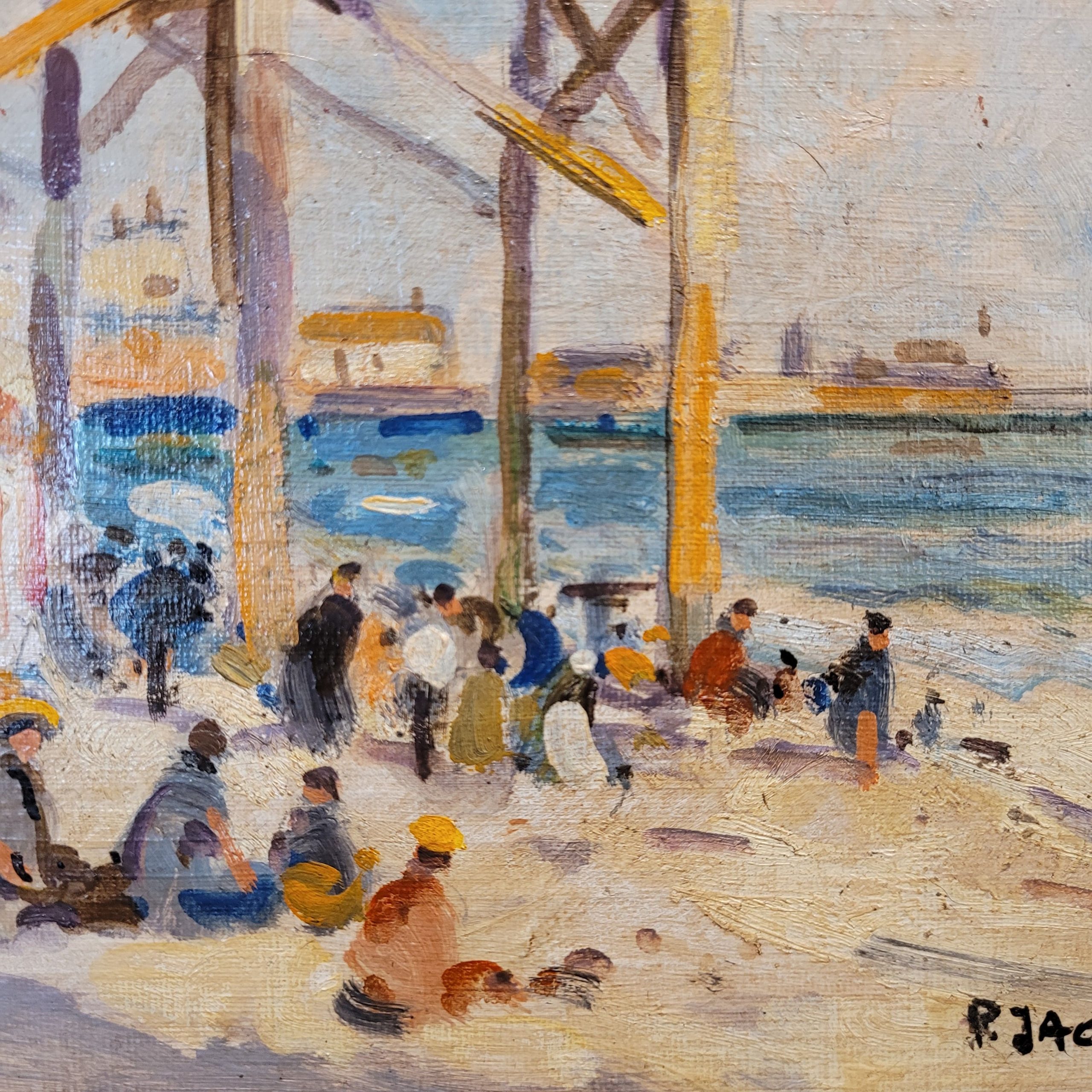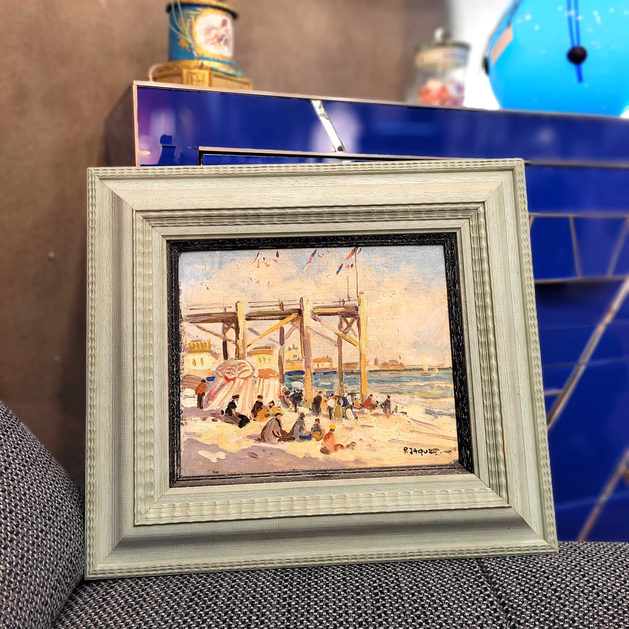 Maravilloso óleo sobre tabla representando una versión de la obra “Estacade Beach in Trouville” del pintor Raoul Dufy, realizada por el artista R. Jaquet a mediados del siglo XX. Se trata de una escena de ocio en la playa, en la que varios grupos de personas se disponen a lo largo de la playa. El ambiente soleado y el mar azul brillante aportan una sensación de alegría y bienestar. No presenta un dibujo muy definido ya que sigue los rasgos del modelo original, dentro del movimiento fauvista, donde el color (de tonalidades pastel pero brillantes) prima sobre el dibujo y se emplea para transmitir emociones, estados de ánimo, sentimientos… es su forma de expresión. También podemos observar varios planos y profundidad, desde la playa con personas disfrutando del buen tiempo hasta el mar que se extiende a lo lejos, invitando al espectador a unirse a la escena. Es un ejemplo que capta el espíritu de la Belle Époque, representando un paisaje cargado de optimismo y alegría visual de la vida en Troville, lugar de vacaciones y turismo.
