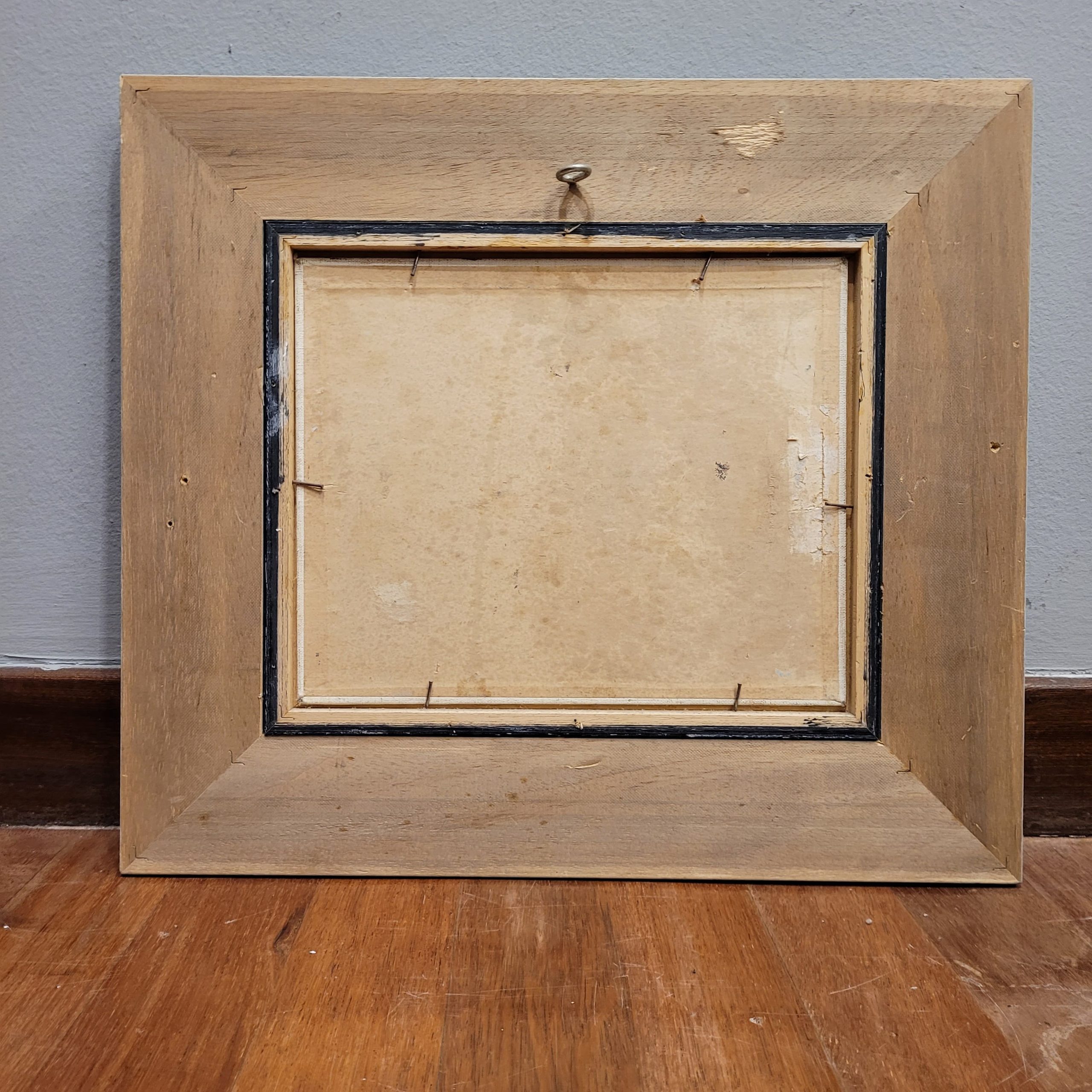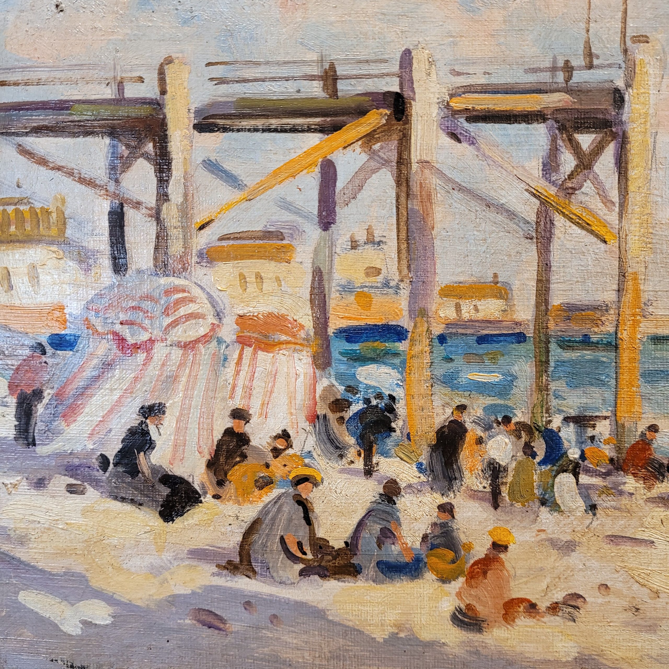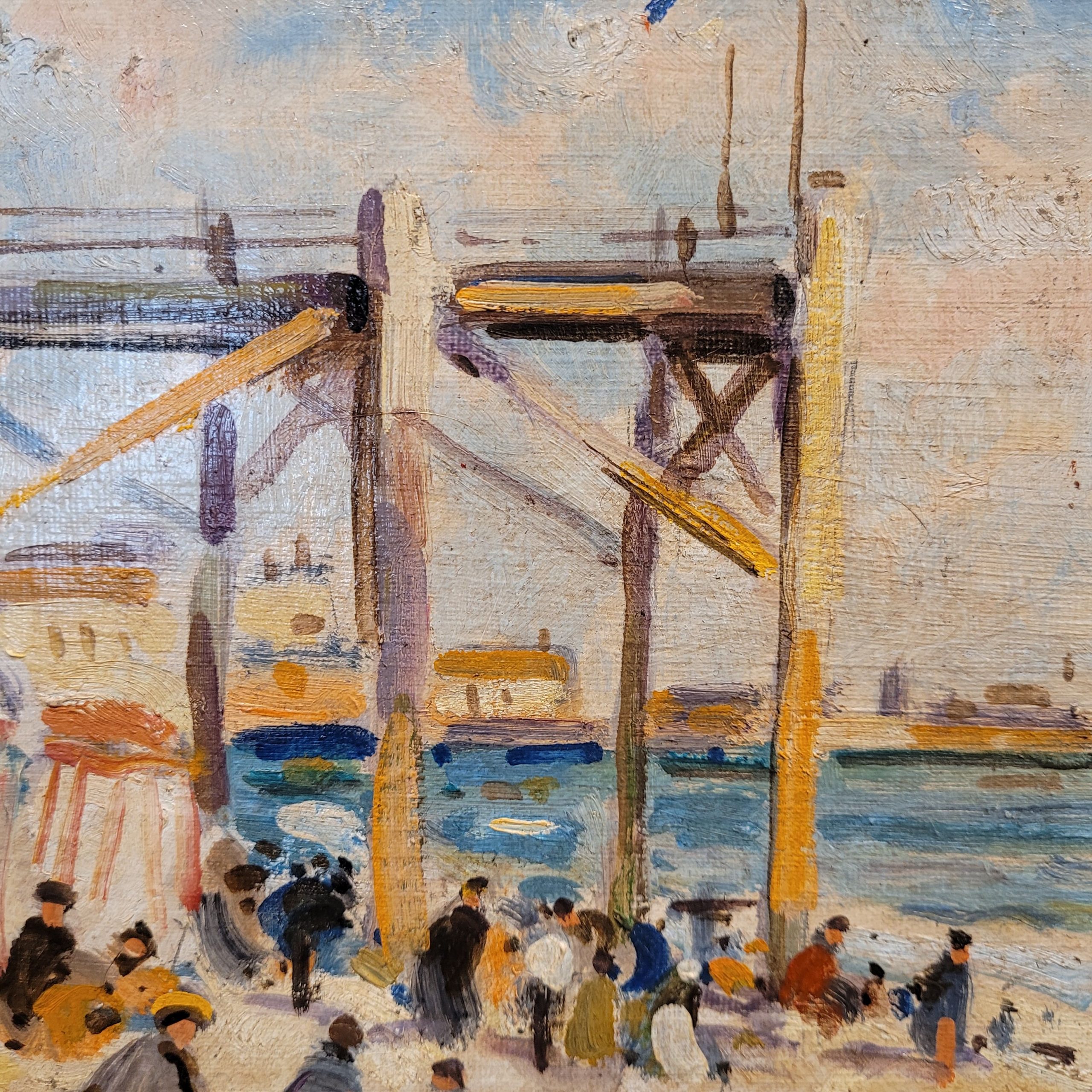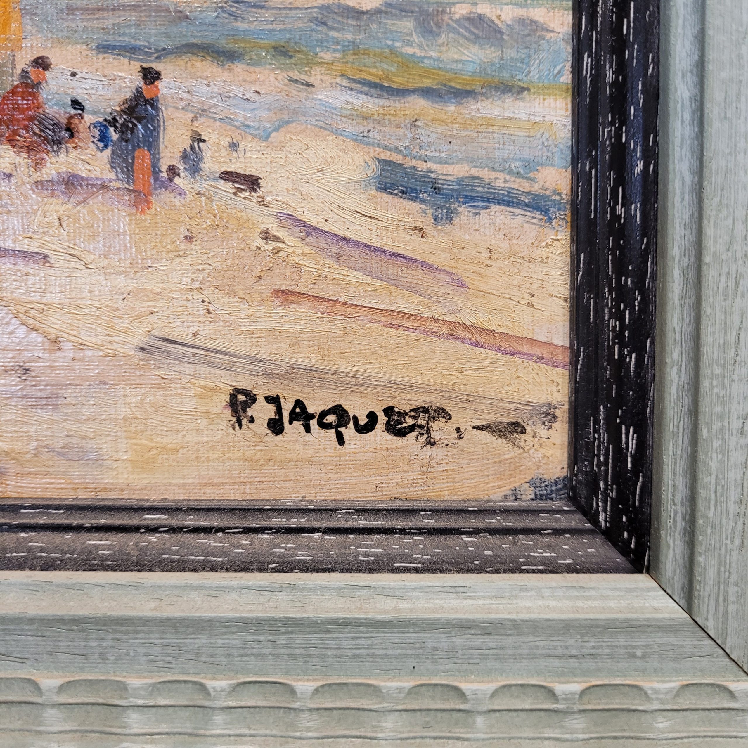 Maravilloso óleo sobre tabla representando una versión de la obra “Estacade Beach in Trouville” del pintor Raoul Dufy, realizada por el artista R. Jaquet a mediados del siglo XX. Se trata de una escena de ocio en la playa, en la que varios grupos de personas se disponen a lo largo de la playa. El ambiente soleado y el mar azul brillante aportan una sensación de alegría y bienestar. No presenta un dibujo muy definido ya que sigue los rasgos del modelo original, dentro del movimiento fauvista, donde el color (de tonalidades pastel pero brillantes) prima sobre el dibujo y se emplea para transmitir emociones, estados de ánimo, sentimientos… es su forma de expresión. También podemos observar varios planos y profundidad, desde la playa con personas disfrutando del buen tiempo hasta el mar que se extiende a lo lejos, invitando al espectador a unirse a la escena. Es un ejemplo que capta el espíritu de la Belle Époque, representando un paisaje cargado de optimismo y alegría visual de la vida en Troville, lugar de vacaciones y turismo.