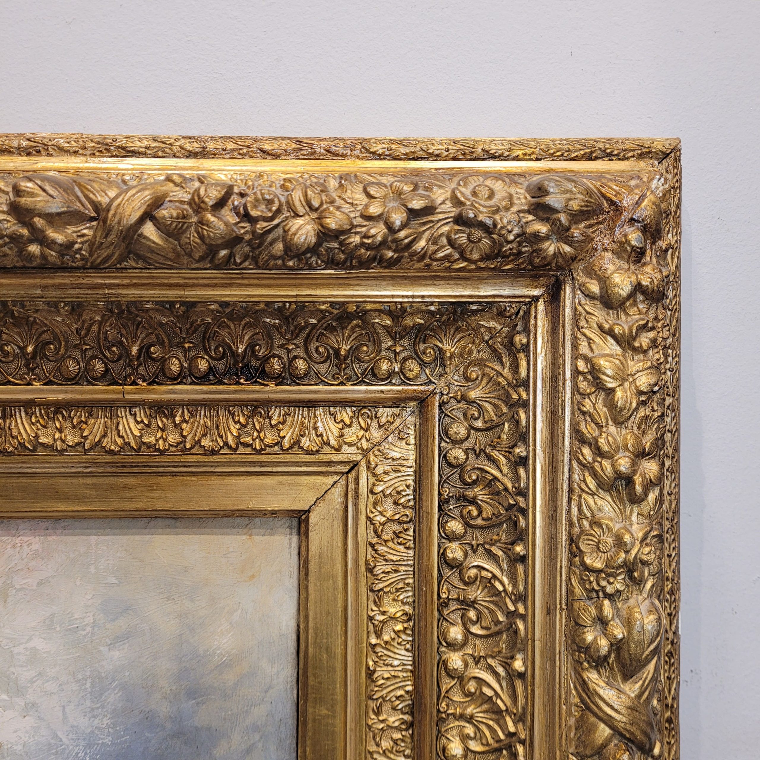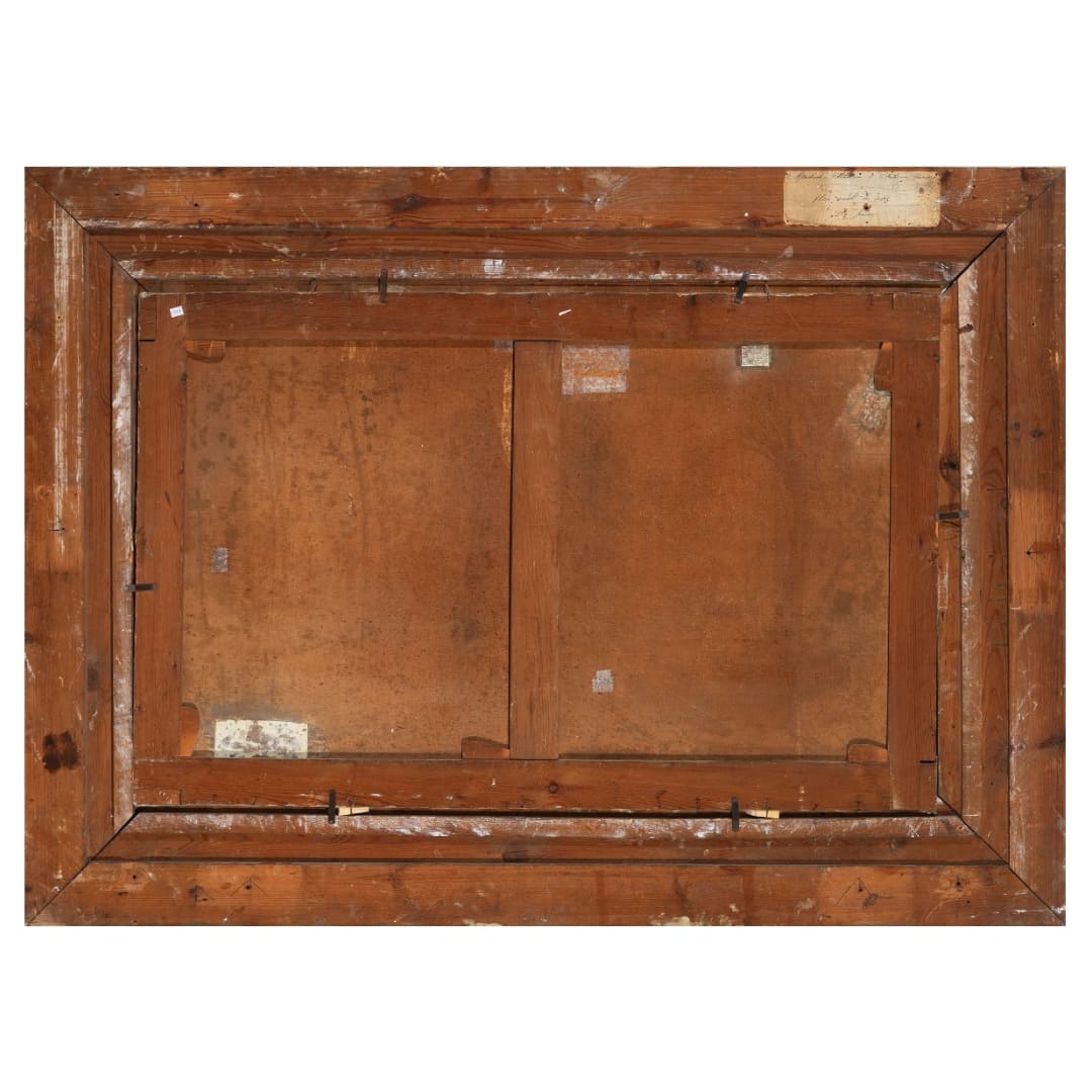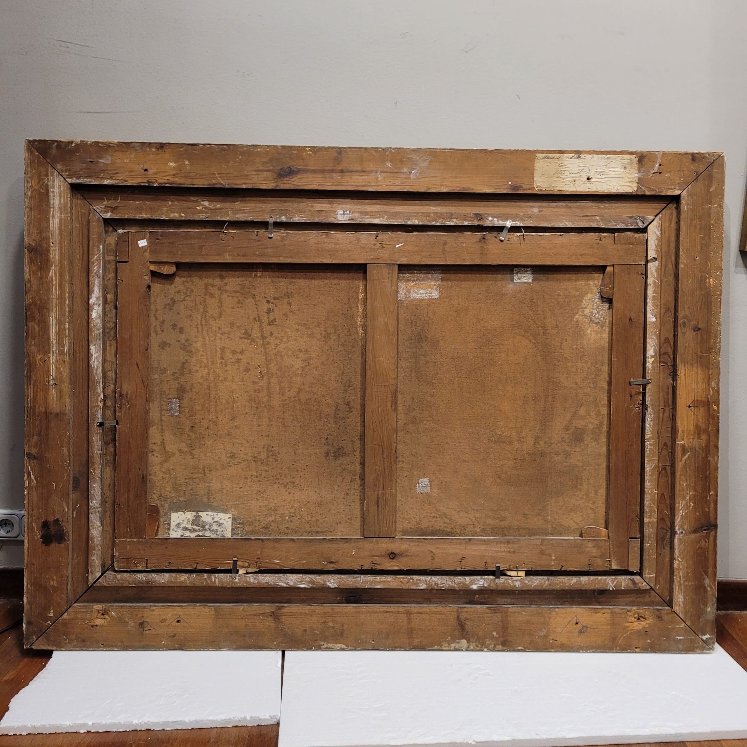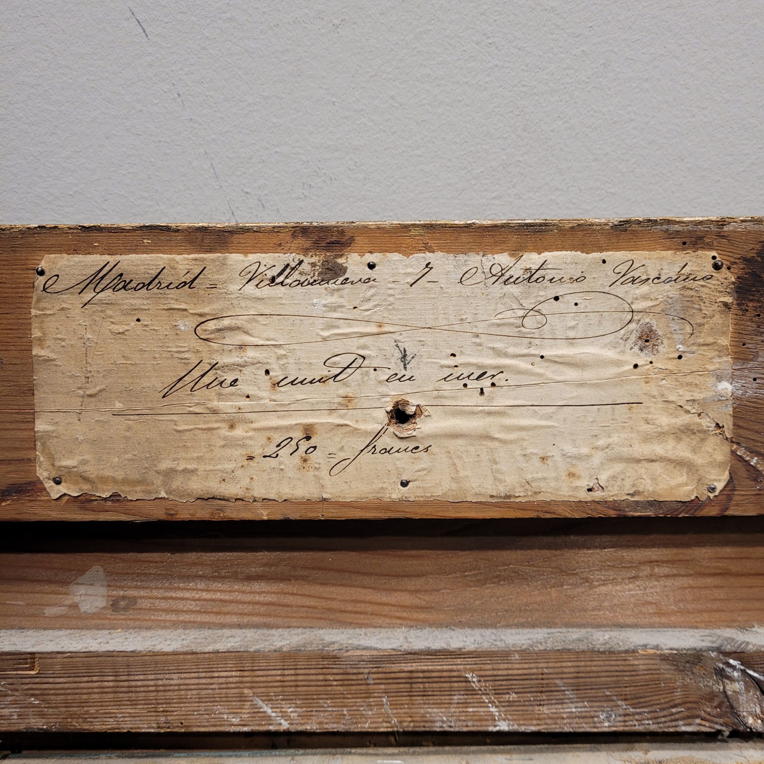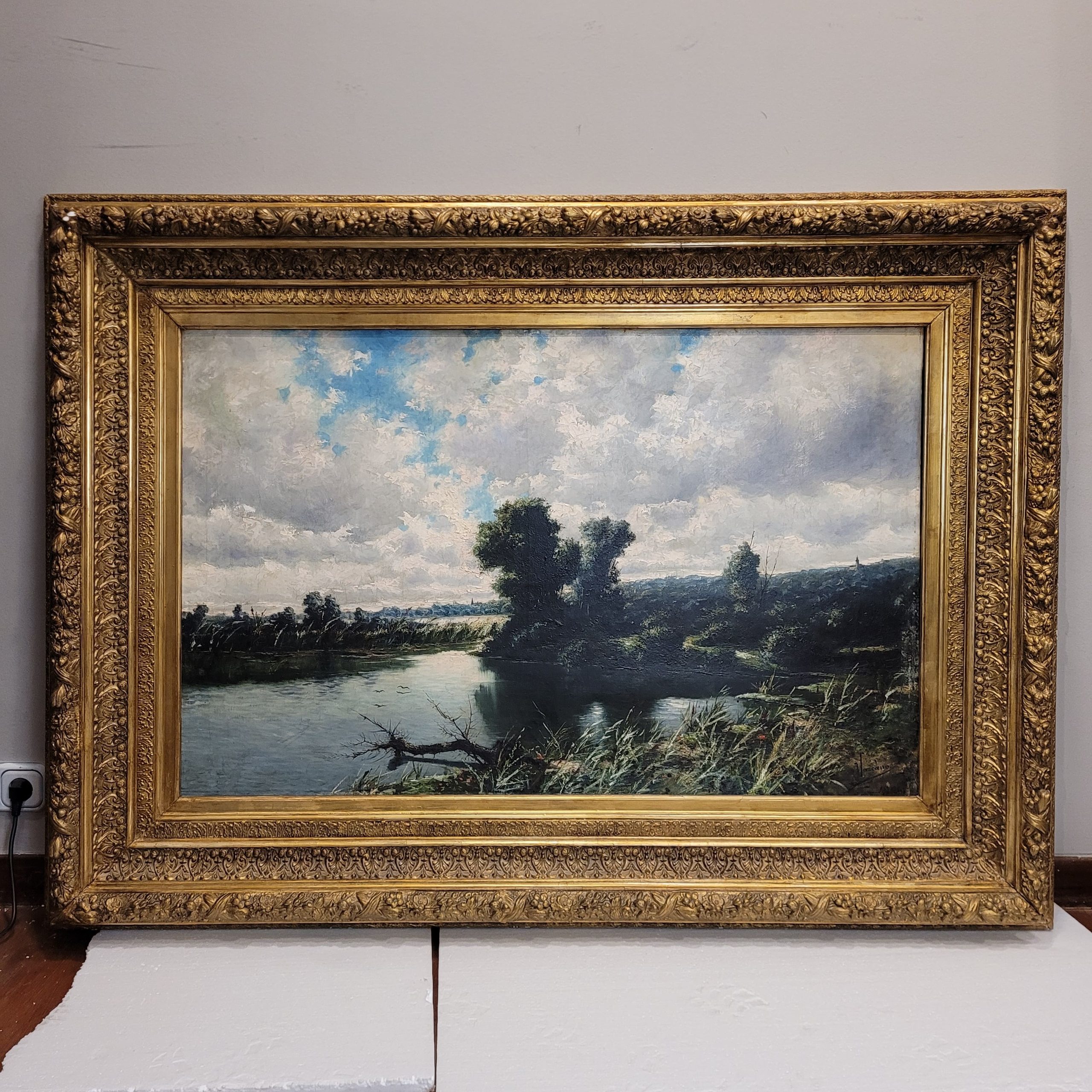 Excelente óleo sobre lienzo en el que se representa un paisaje natural, la ribera de un río y el reflejo sobre este de la vegetación, obra de Antonio Cánovas del Castillo y Vallejo, hombre con una notable formación cultural, en especial en el ámbito de las artes y conocido principalmente por su labor como fotógrafo. Sin embargo, en su faceta como pintor, Cánovas del Castillo adoptó el seudónimo «Vascano» para firmar la mayoría de sus obras. La obra destaca por cómo, a pesar del cielo cubierto, la luz se filtra hacia el paisaje, creando una atmósfera evocadora y de gran realismo. El gran marco ornamentado resalta la importancia de la obra.