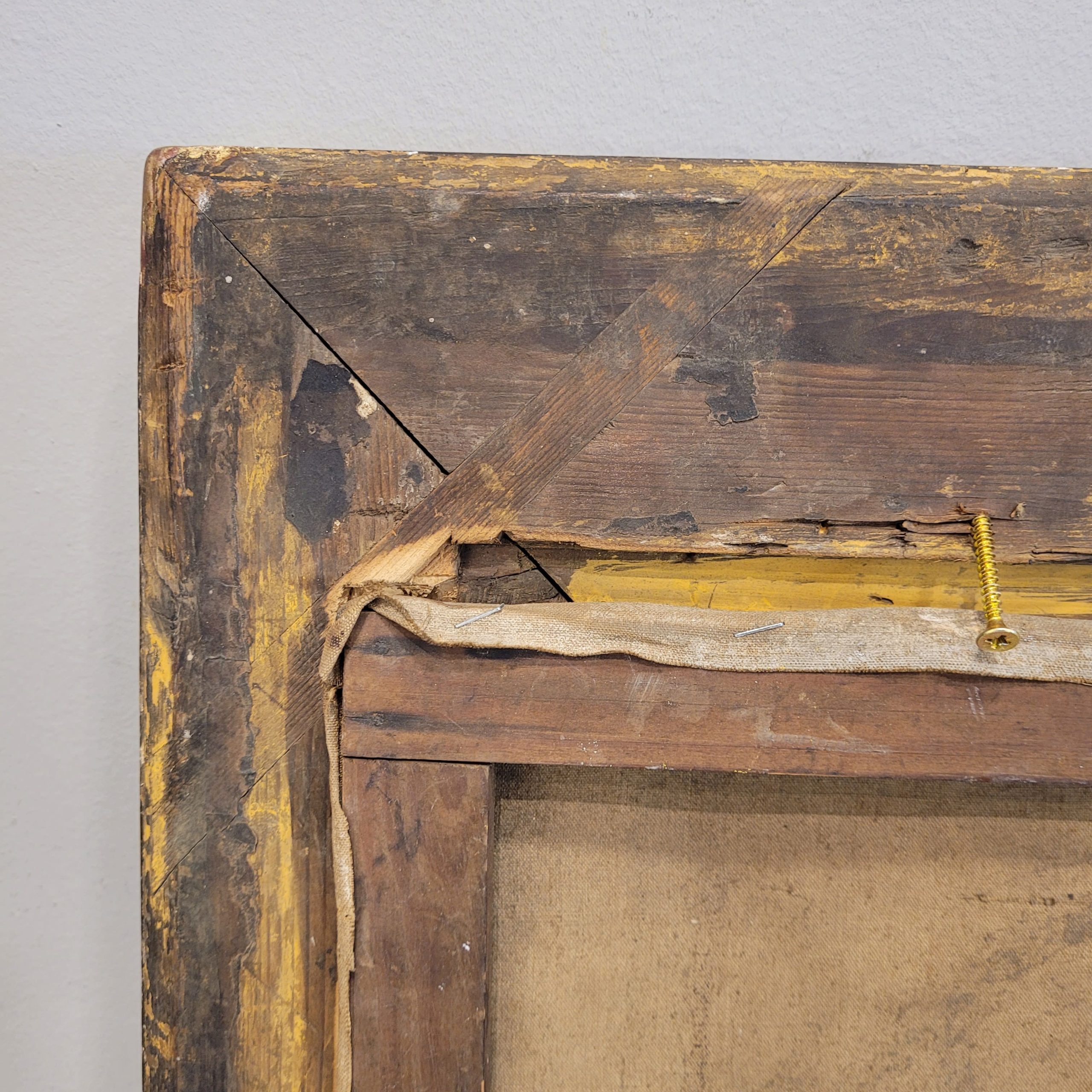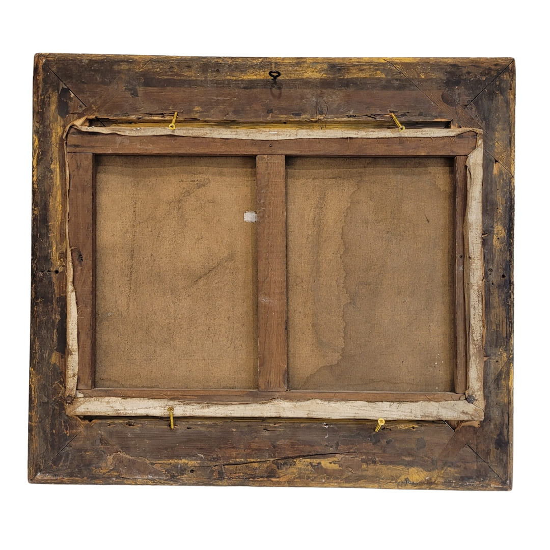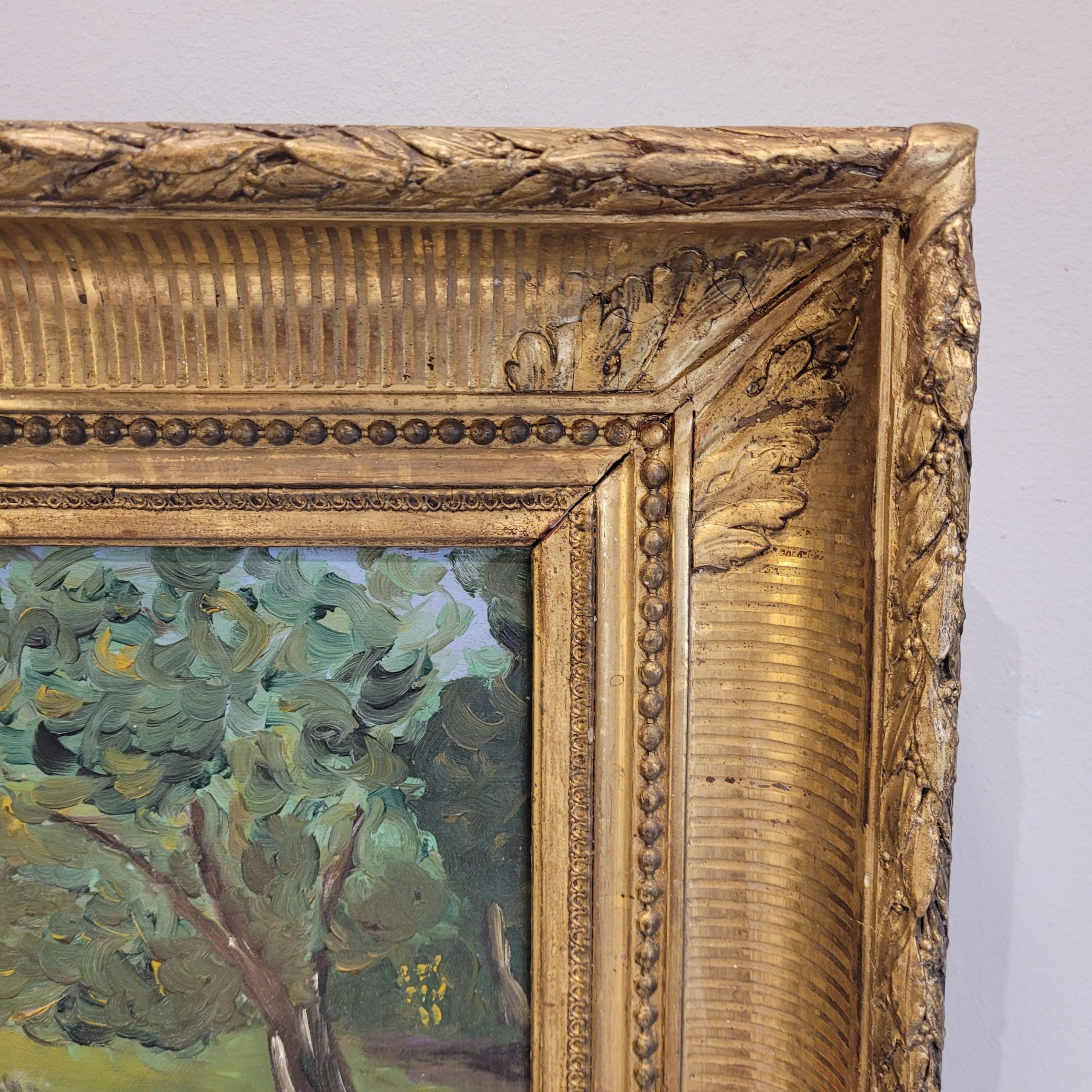 Delicado óleo sobre lienzo, de factura impresionista, que representa un alegre y apacible paisaje natural, cuyo río fluye suavemente desde el primer plano hacia el fondo de la escena. A ambos lados, en las riberas del río, crecen árboles frondosos formados a partir de pinceladas rápidas, visibles y expresivas. Esta misma pincelada es la que se encuentra en la masa de agua, que parece reflejar la luz del cielo y capturar el movimiento de la corriente. El artista, valiéndose de una pincelada rápida y suelta logra captar la luz cambiante del paisaje, y la perspectiva elegida aporta dinamismo a la composición. A destacar el marco, una obra de arte en sí mismo, con un excelente trabajo de talla, con motivos vegetales en las esquinas, y dorado.