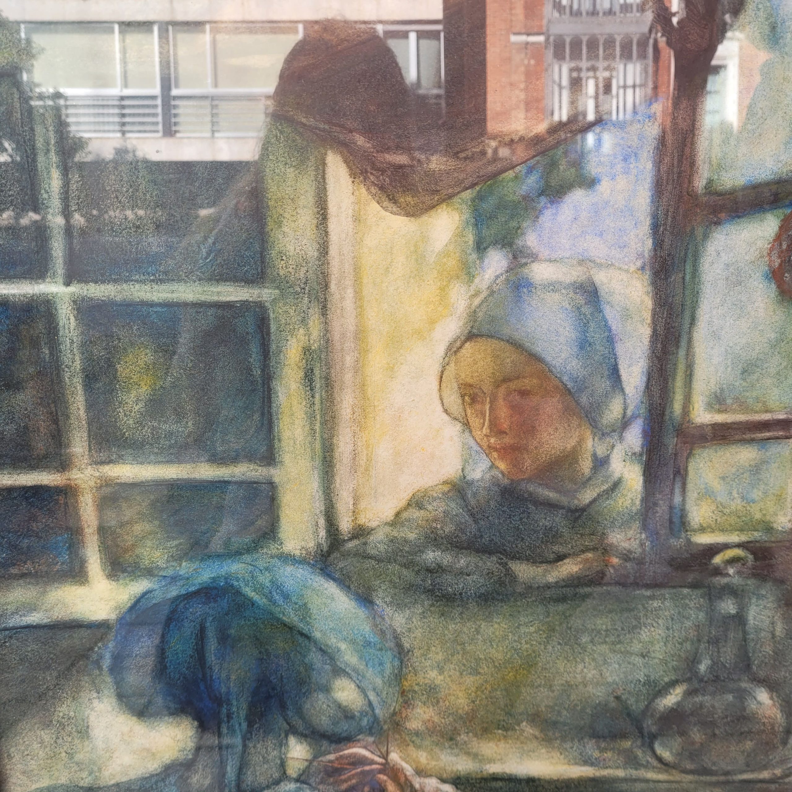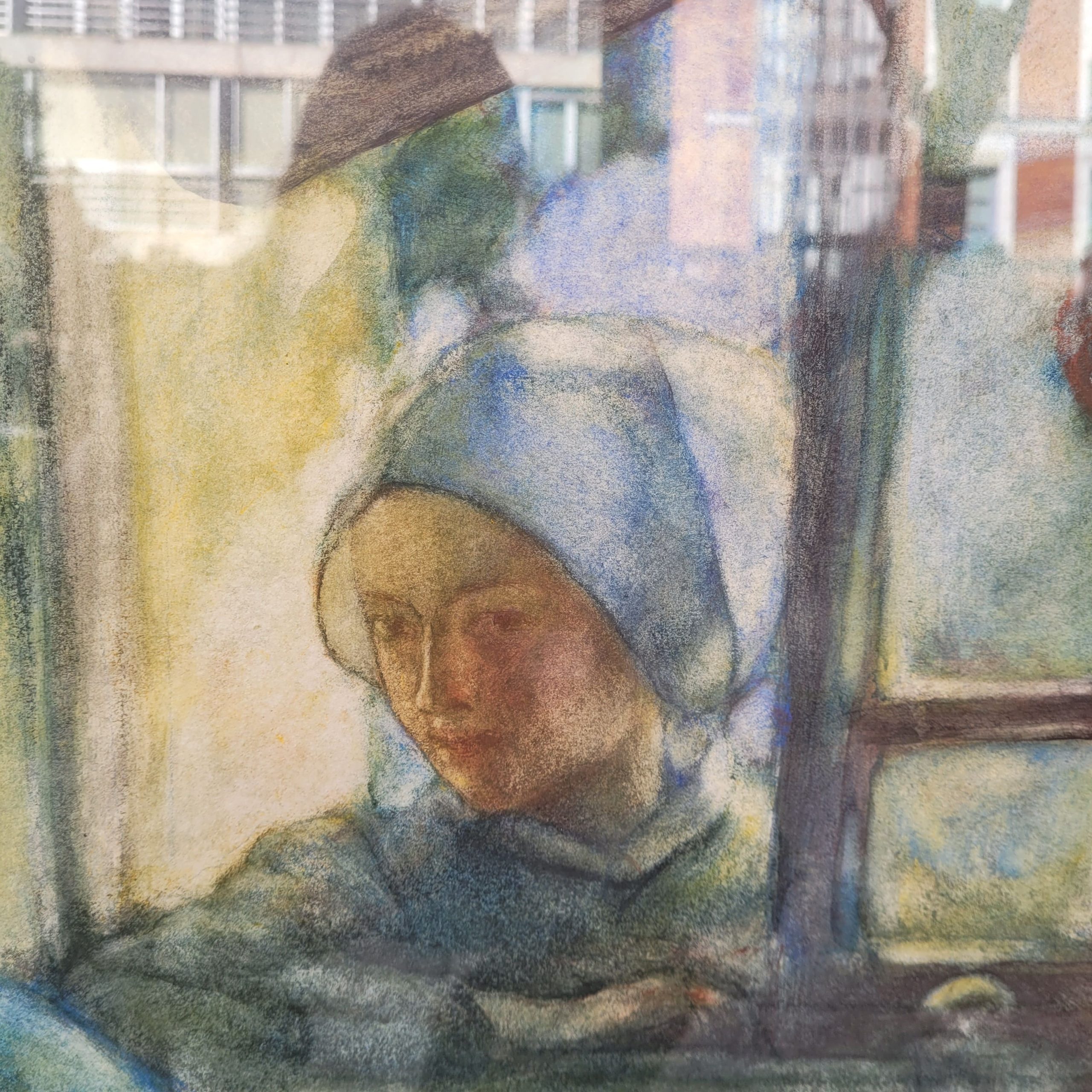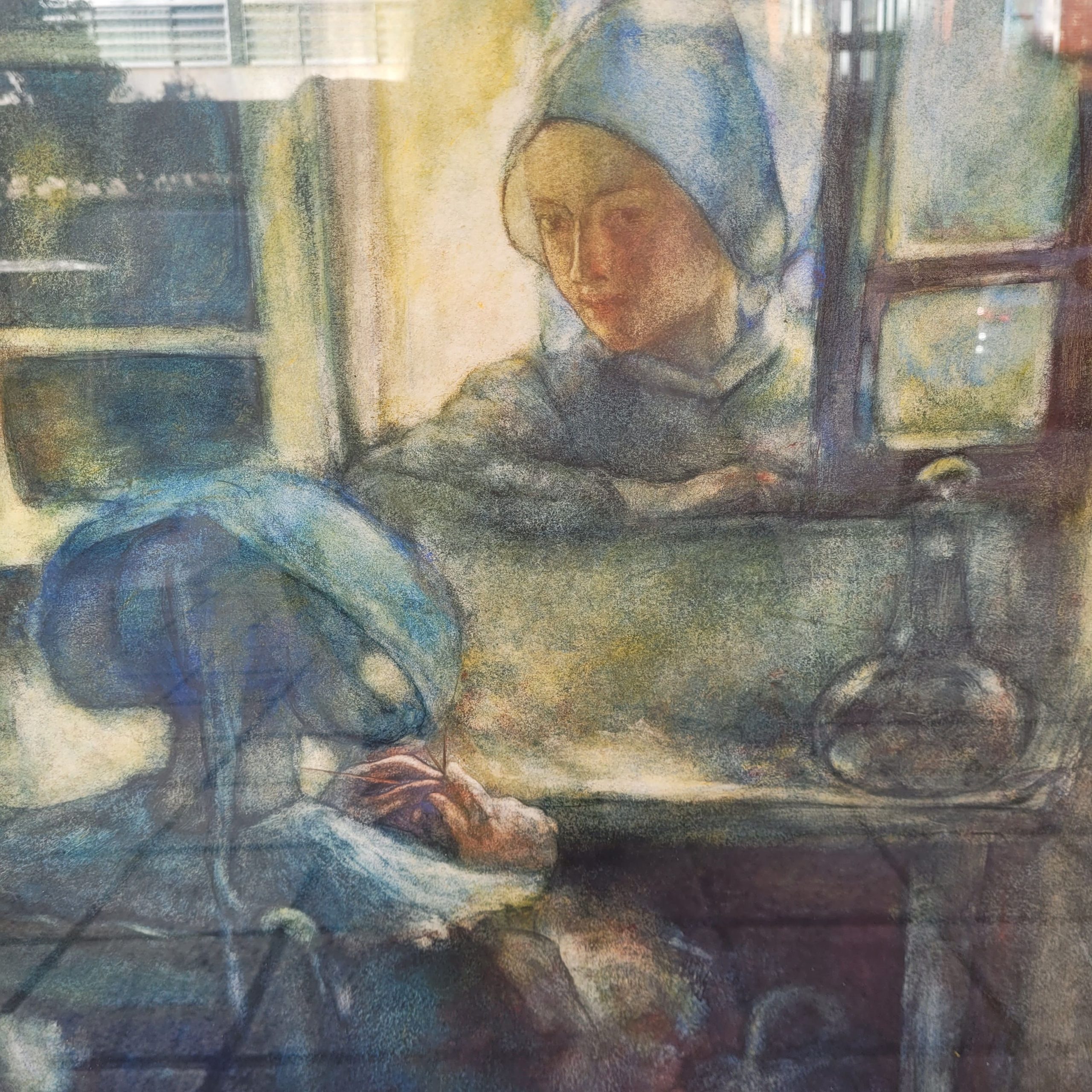 Exquisito pastel sobre papel, obra del francés Gaston La Touche. La obra nos introduce como espectadores en un ambiente privado e íntimo, en el que vemos cómo una mujer se asoma por la ventana hacia el interior de una casa en la que, otra mujer, de espaldas al espectador, está tejiendo. La mujer que se asoma desde el exterior, observa con una expresión serena a la primera. Ambas llevan una cofia azul. Cabe destacar el magistral manejo de la luz, pues toda la estancia se ilumina gracias a la luz que entra desde la ventana por la que se asoma la mujer y baña la escena de una luz dorada y delicada. La composición juega con los contrastes de luz y sombra, evocando un ambiente casi espiritual. Los colores predominantes son azules, ocres y dorados, lo que refuerza la atmósfera íntima y en calma.