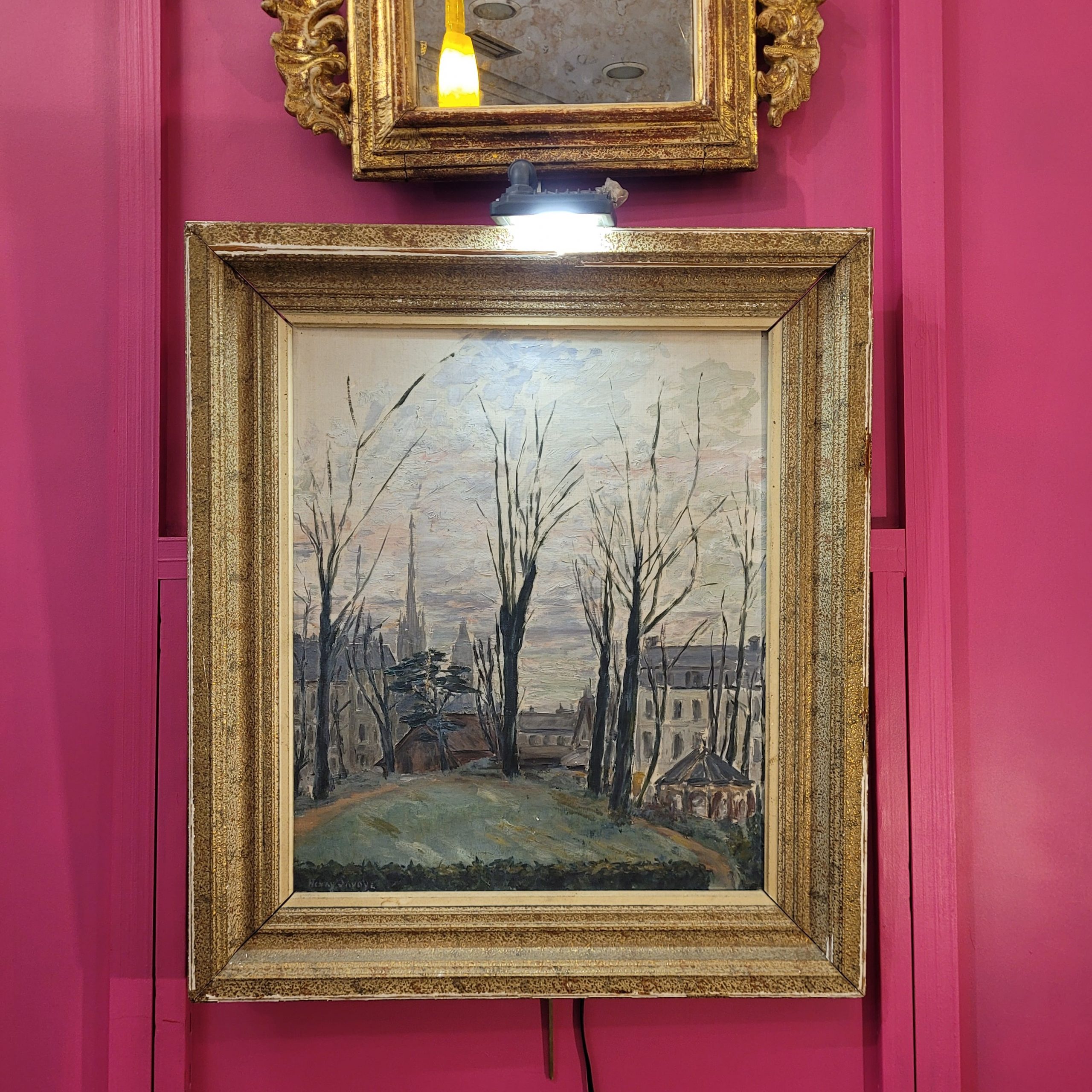 Extraordinaria vista invernal de un paisaje urbano, firmado en la zona inferior izquierda, realizado en el siglo XX, en Francia. Este paisaje, con tonos apagados y grisáceos y de una pincelada notoria busca transmitir calma y reflexión. Los árboles deshojados ya por el paso del tiempo, el ambiente gris del cielo nublado y las arquitecturas desdibujadas que se pierden en el horizonte, invitan a la introspección del espectador. Influida por la estampa japonesa de gran popularidad en el momento, se aprecia cómo la mirada se ve obstaculizada por las ramas de los árboles apenas detalladas, creando profundidad y dando sentido a la composición. La armonía lograda mediante el uso de la paleta en tonos azulados y grisáceos y el aspecto inacabado de la pincelada invitan a pensar en distintas motivaciones para esta pieza, convirtiéndola en la decoración perfecta para otorgar dignidad a cualquier estancia de tu hogar.