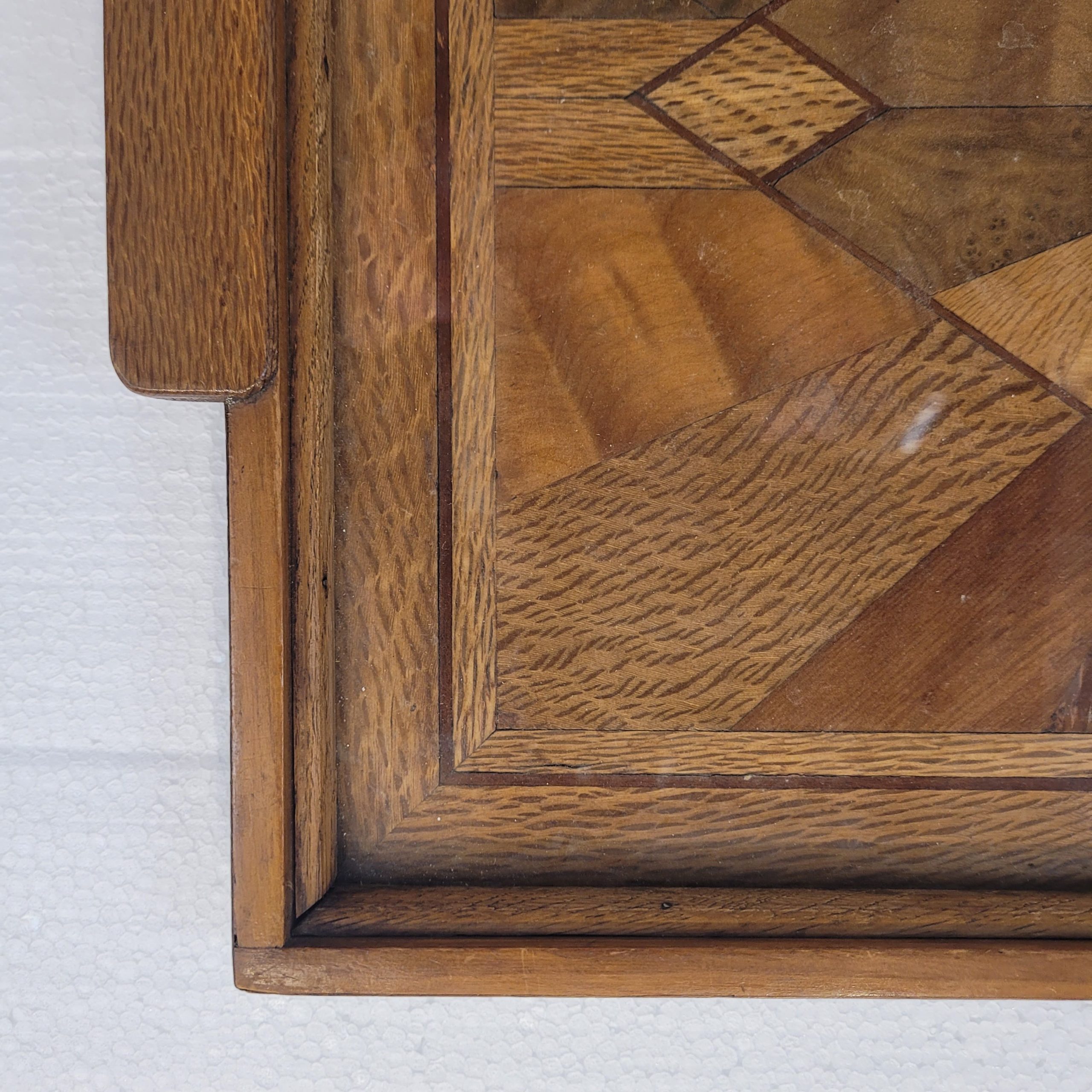 Extraordinaria bandeja realizada en madera con marquetería de maderas frutales, lupia y cristal, realizada hacia 1950 en Francia. Presenta unos bellos patrones geométricos intrincados que remiten directamente al más puro Art Déco. Este estilo, que floreció en las décadas de 1920 y 1930, además de caracterizarse por sus formas geométricas, lo hace por su simetría y el uso de materiales lujosos, así como la puesta en valor del contraste de colores y texturas.