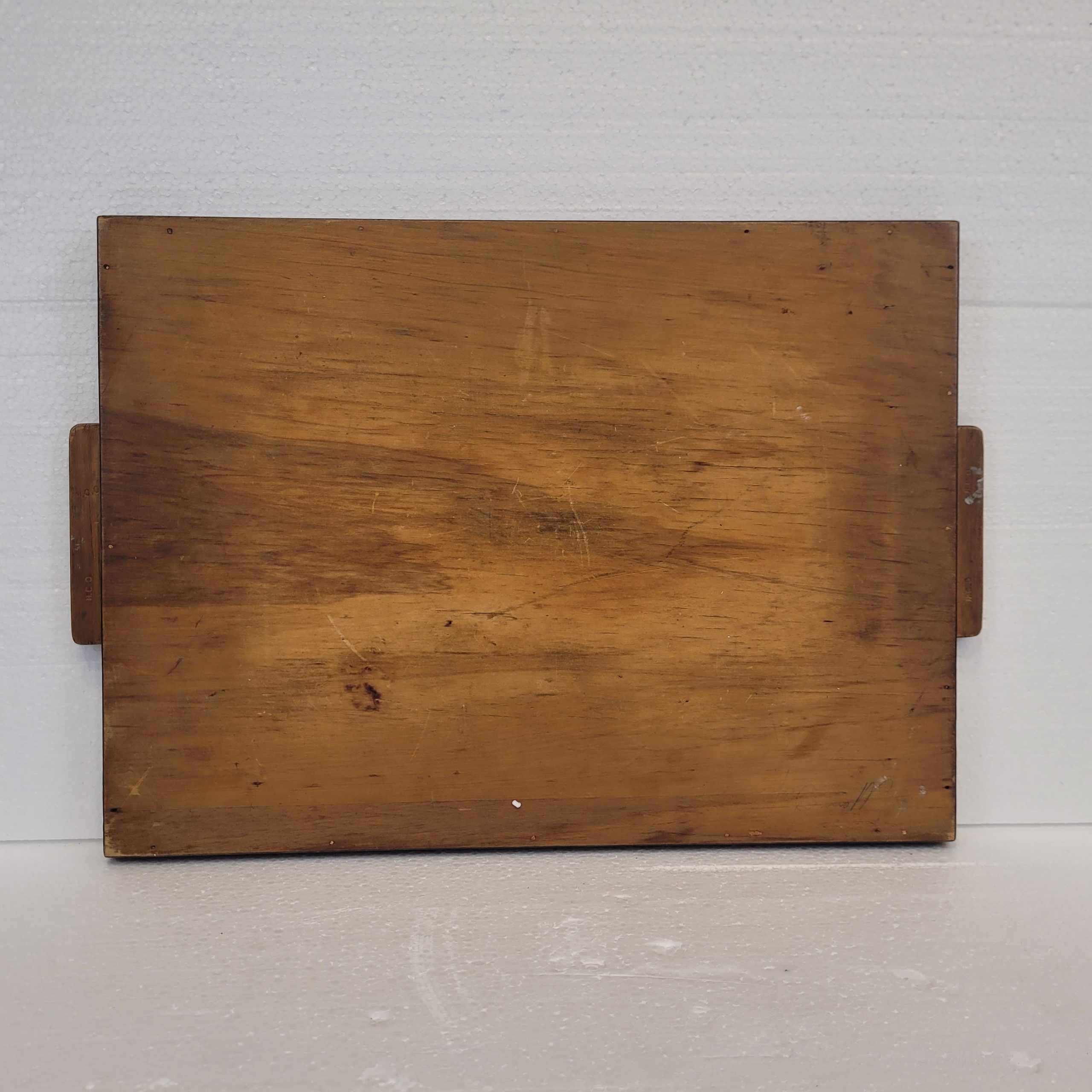 Llama poderosamente la atención el diseño, basado en una forma rectangular y en un rombo, potenciado por un perímetro. Entre estas formas, multitud de maderas de diferentes vetas y colores crean el fondo. La estructura se termina de completar con las asas rectas. Ideal como elemento decorativo además de ser una bandeja funcional.