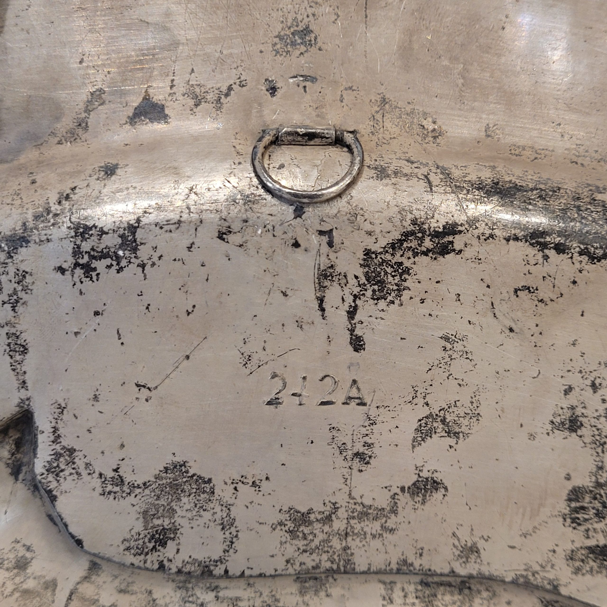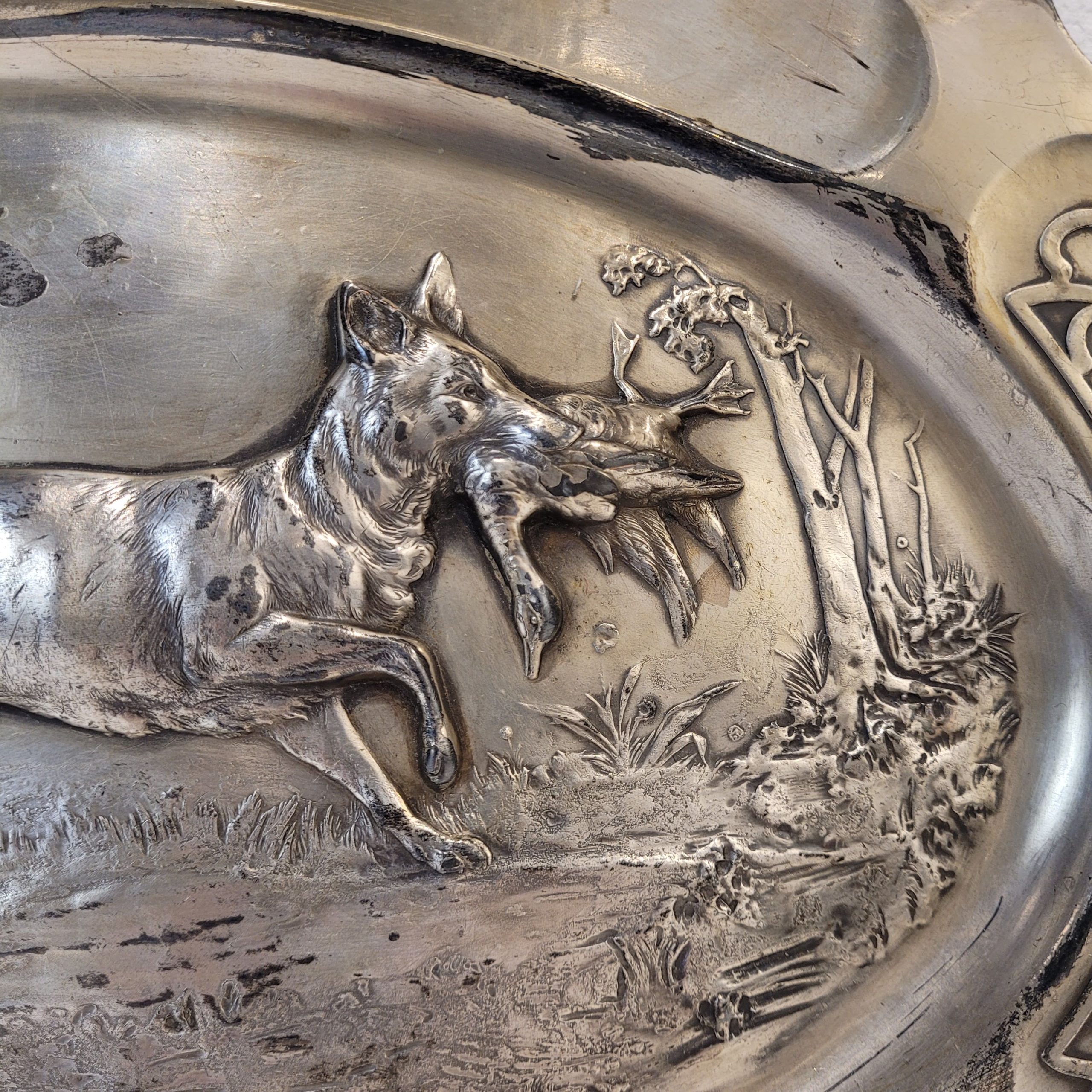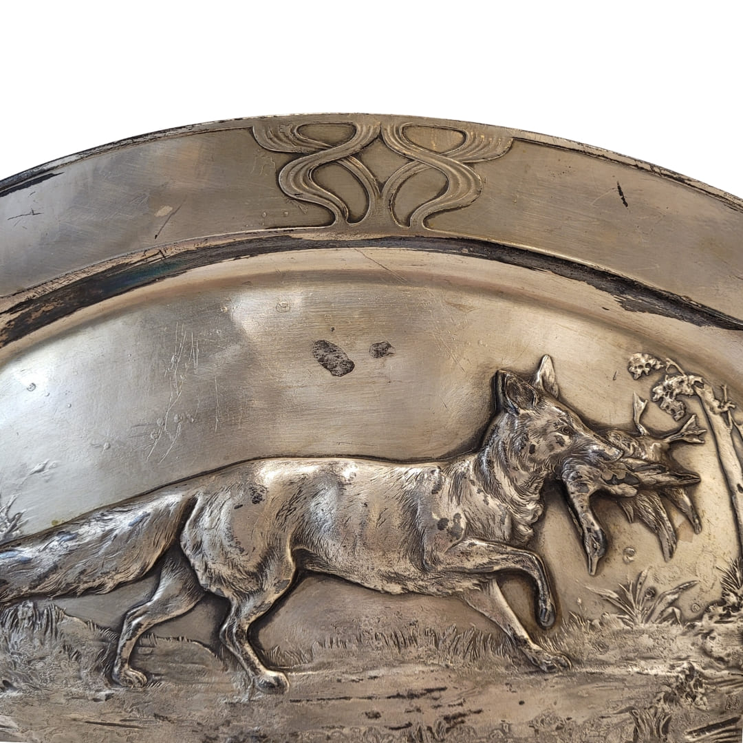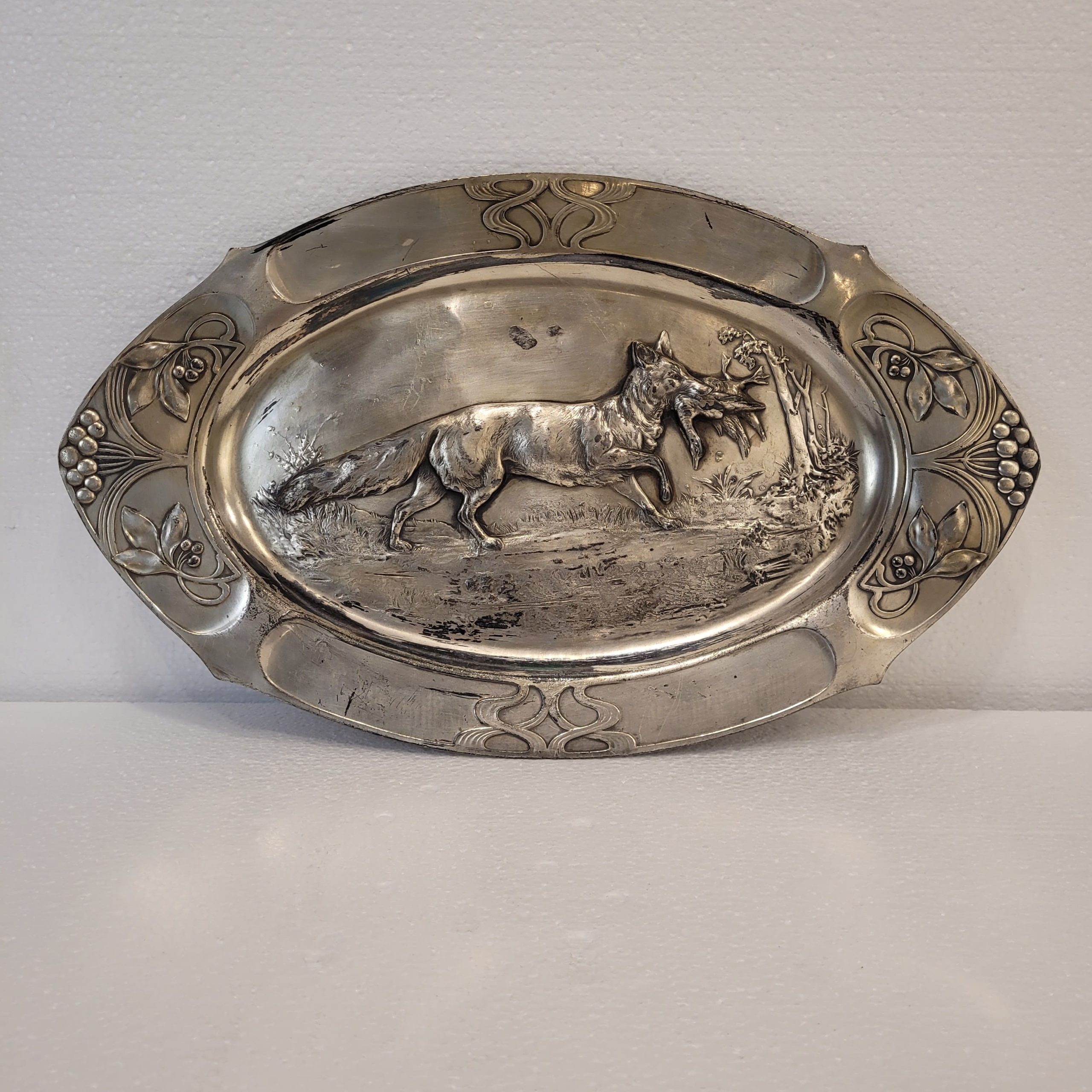 Elegante bandeja francesa ovalada elaborada en peltre, realizada a comienzos del siglo XX. Presenta un relieve central con un zorro con su víctima en la boca, una escena de caza en la cual el cazador es el zorro en vez de ser la presa como es usual. El modelado ha sido tratado con un naturalismo y gran sentido de la volumetría. El ala de la bandeja está decorada con motivos vegetales de líneas fluidas, propios del Art Nouveau de principios del siglo pasado. Presenta una pátina propia de su antigüedad, que realza el modelado. Ideal como objeto decorativo o de colección.