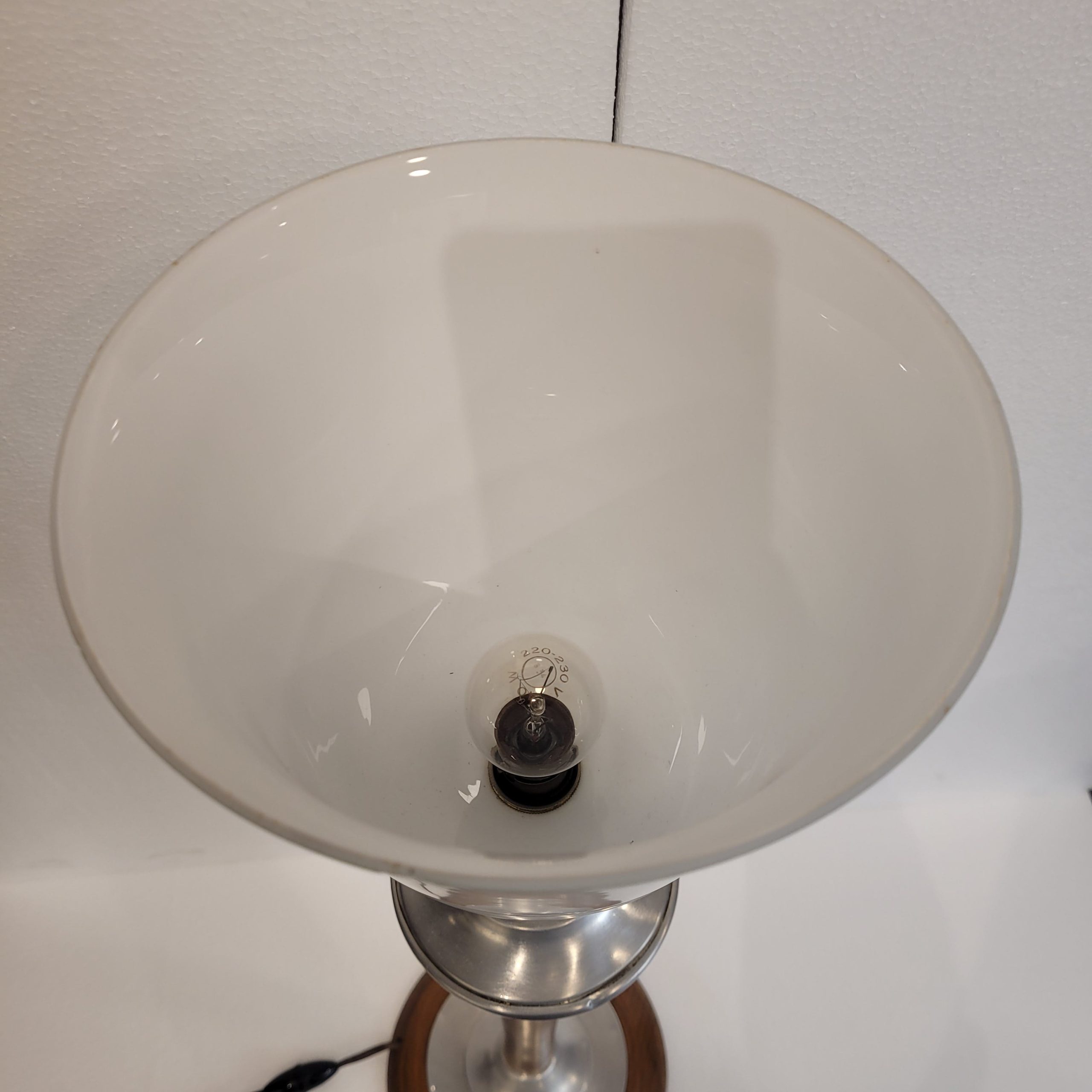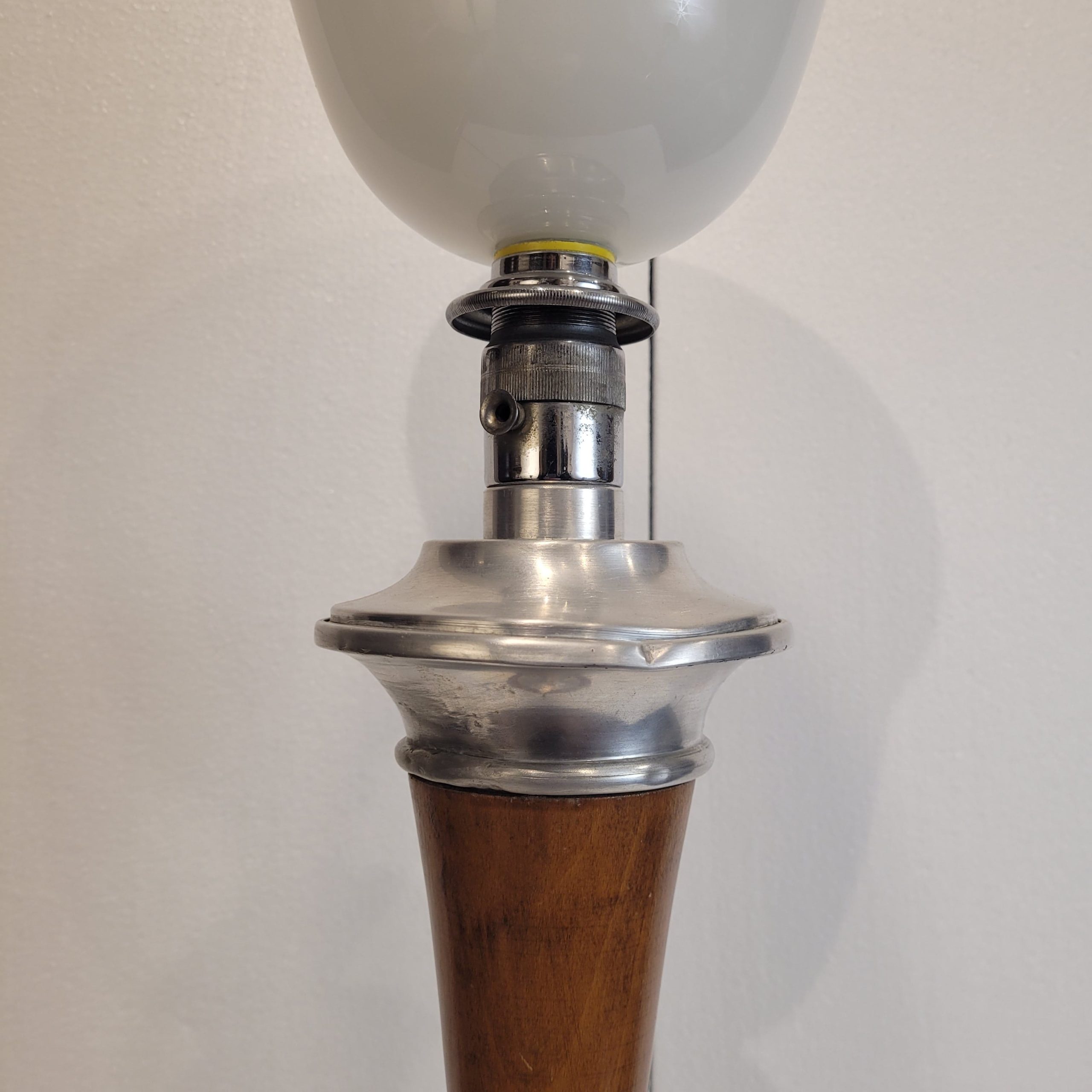 Espléndida lámpara de mesa o trabajo Art Déco realizada en la Francia de principios del siglo XX, diseño registrado por la firma de iluminación MAZDA. Elegante y delicada, se configura a partir de un esbelto pie de madera del que parece florecer una tulipa de cristal opalino.