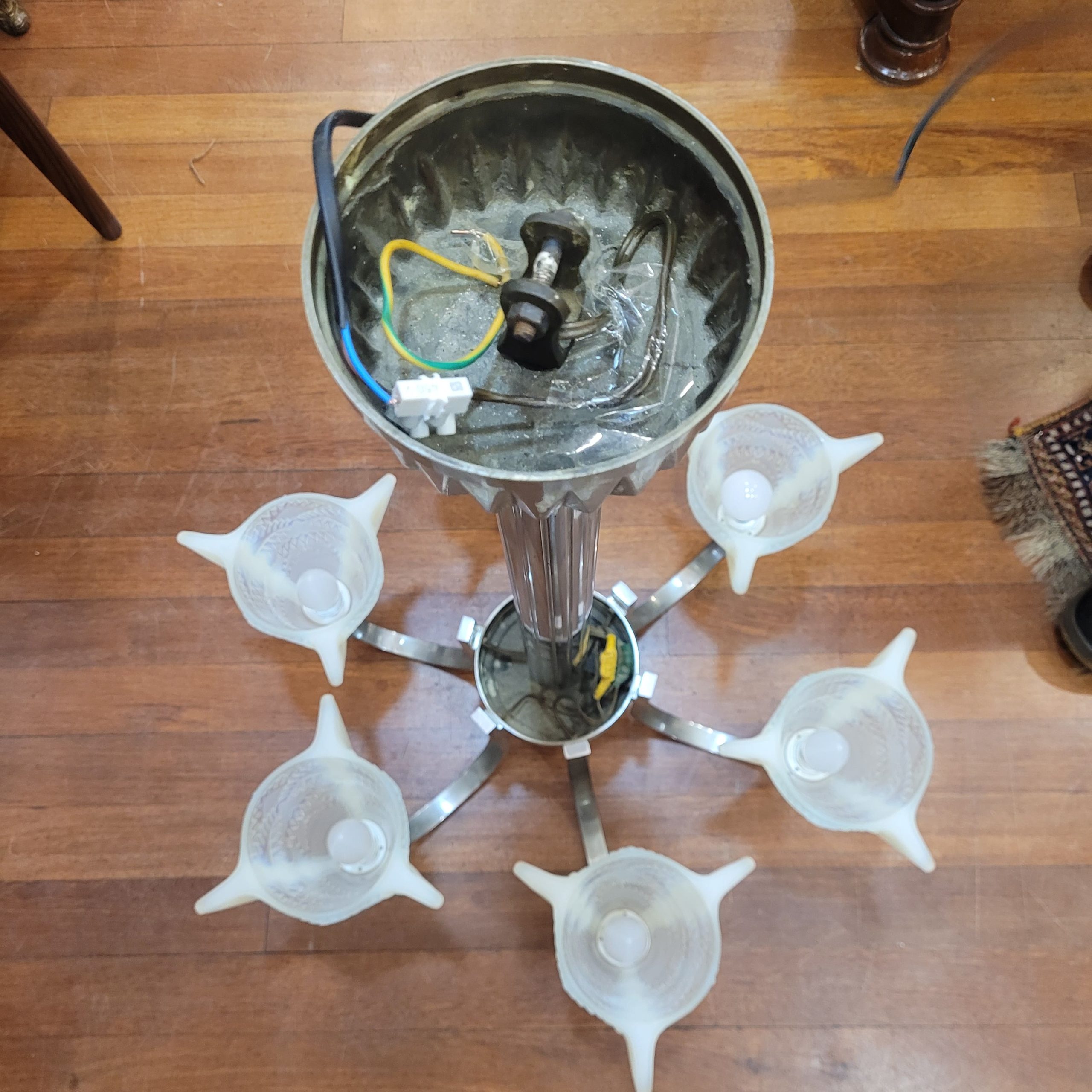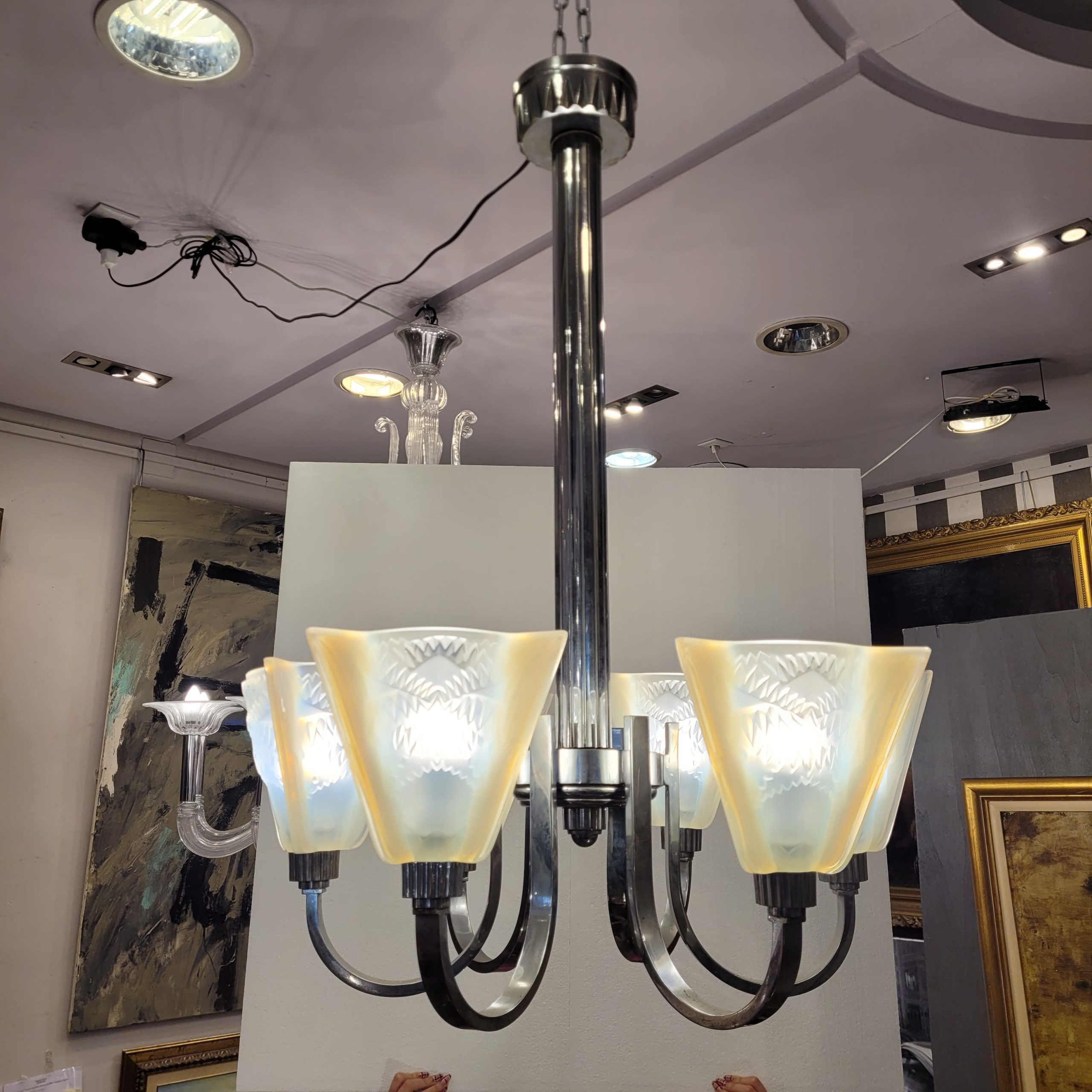 Excepcional lámpara de techo o chandelier de seis luces Art Déco, Atelier Petitot, París, circa 1930, en metal niquelado. Proyecta una agradable luz cálida y difusa a través de sus pantallas o tulipas de vidrio opalino esmerilado y tallado. La estructura es de latón niquelado, con un vástago central que se ramifica en seis brazos, cada uno rematado con una pantalla de vidrio opalino orientada hacia arriba.