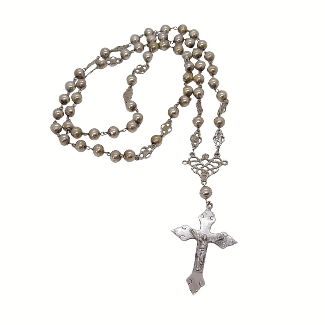Espléndido rosario realizado en plata 750, a principios del siglo XX. Se trata de un rosario de líneas sencillas, elegante y sobrio, es el crucifijo el que acapara toda la atención gracias a su minuciosa técnica. Es un Cristo de cuatro clavos, de anatomía delicada, que sufre en la cruz.