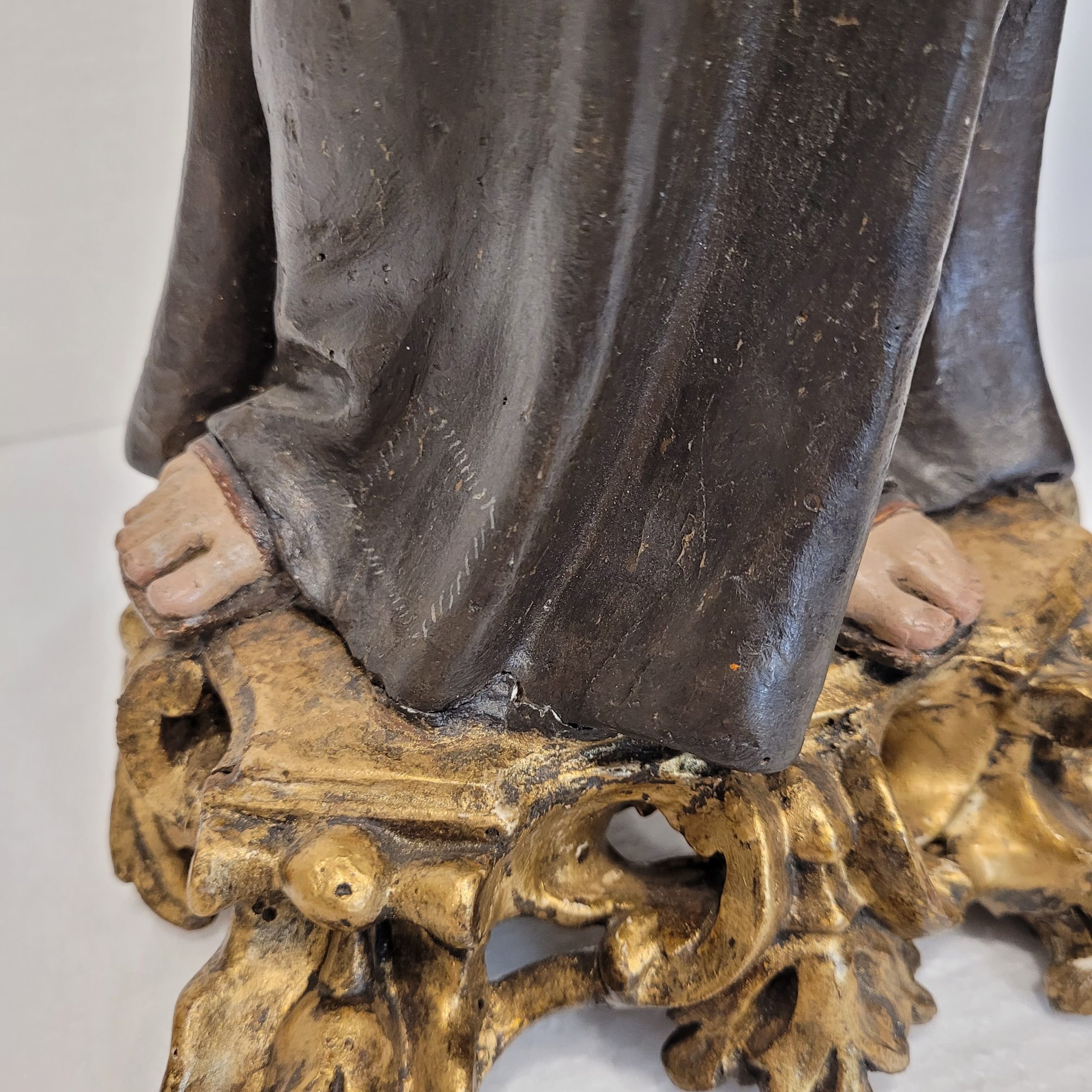 Exquisita talla de san Antonio de Padua, siglo XVIII. De extraordinaria factura, la iconografía corresponde a la habitual en este santo. Se le representa como un fraile joven que tiene en brazos al Niño Jesús, a menudo con un lirio en la otra mano. En este caso, dedica las dos manos a sostener al Niño que, a su vez, le toca delicadamente la cara al santo. El lirio representa su pureza y la lucha contra el mal. El Niño Jesús recuerda la visión que tuvo en Camposampiero, en la que fue testigo de una aparición del Niño, a quien sostuvo en sus brazos. Expresa además su apego a la humanidad de Cristo y su intimidad con Dios. La juventud del santo hace referencia al personaje ideal, puro, bueno, que acoge a todos. El hábito franciscano recuerda su pertenencia a la Orden Franciscana.