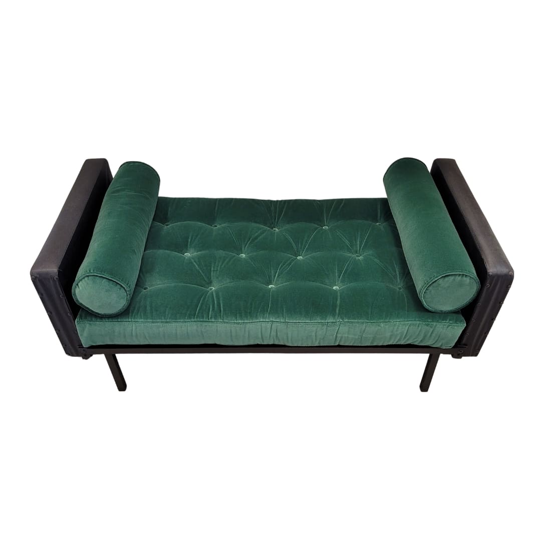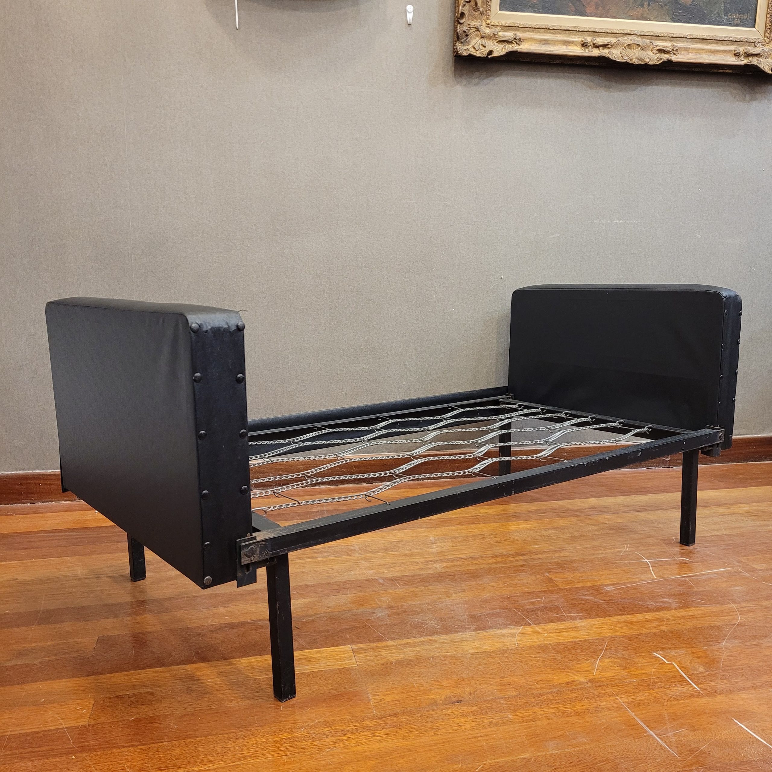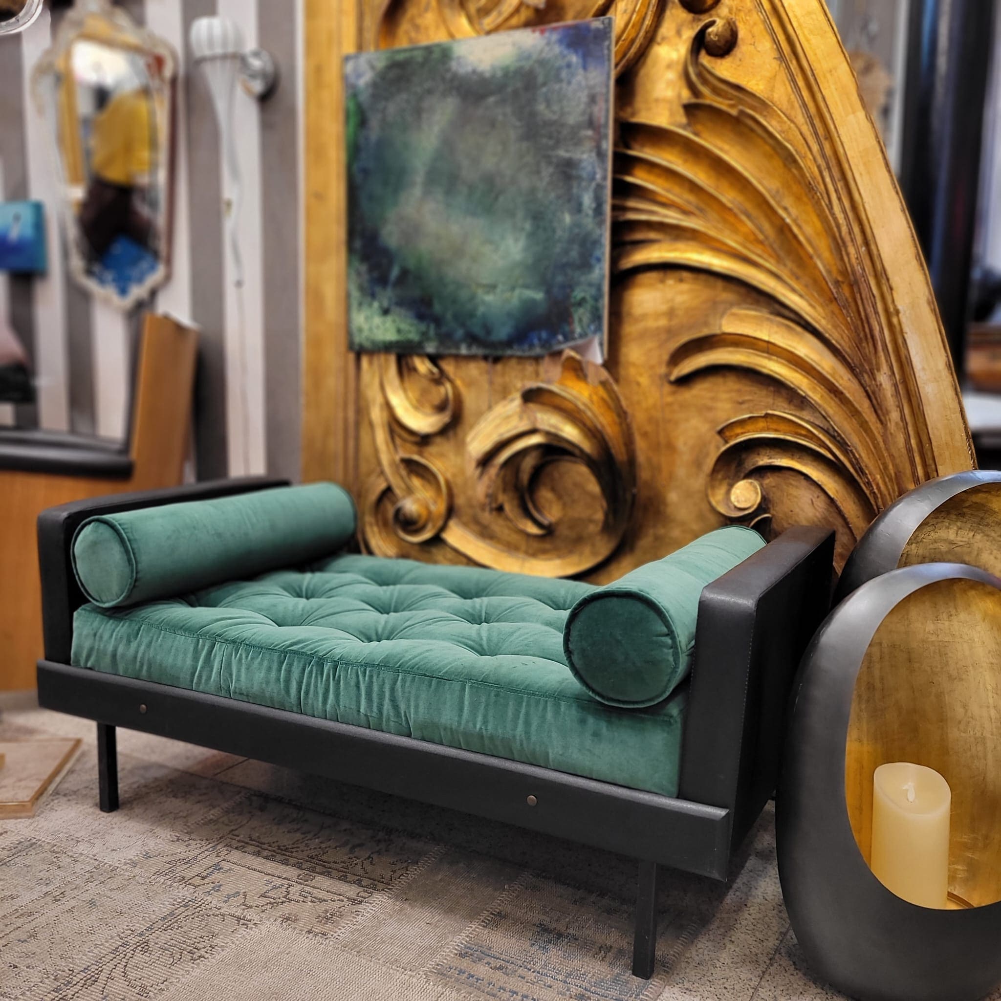 Extraordinaria cama de día o daybed siguiendo las líneas propias del Movimiento Moderno de mediados del siglo XX. Presenta una estructura metálica muy ligera, apoyada sobre 4 esbeltas patas cuadradas. Los reposabrazos se abren hacia el exterior y están tapizados en símil de cuero y rematados con tachuelas. El cojín o colchón de forma rectangular se apoya sobre un somier enrejado y está recién tapizado en terciopelo verde botella capitoné, con dos rulos que completan el conjunto. El diseño adopta una estética decididamente moderna, cuya prioridad es la elegancia, el confort y la sencillez, características que lo hacen fácilmente combinable tanto en un ambiente que siga la línea estética moderna como más clásica.