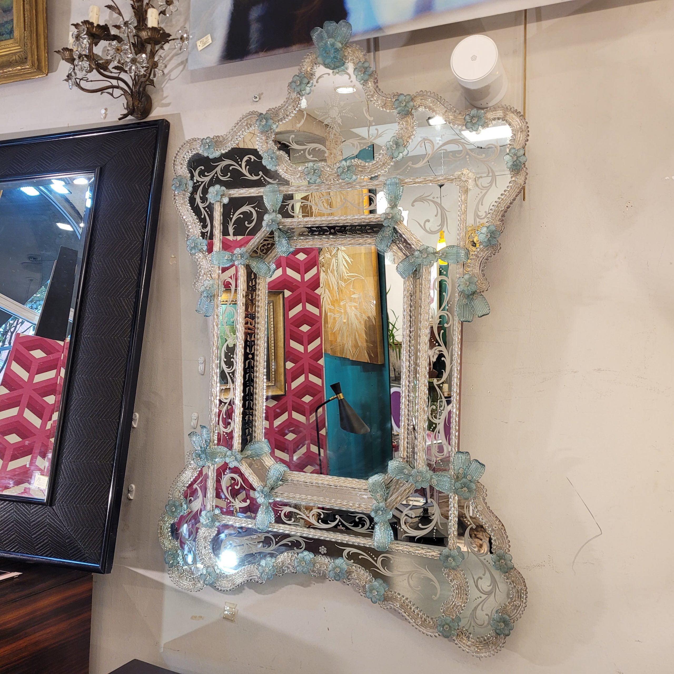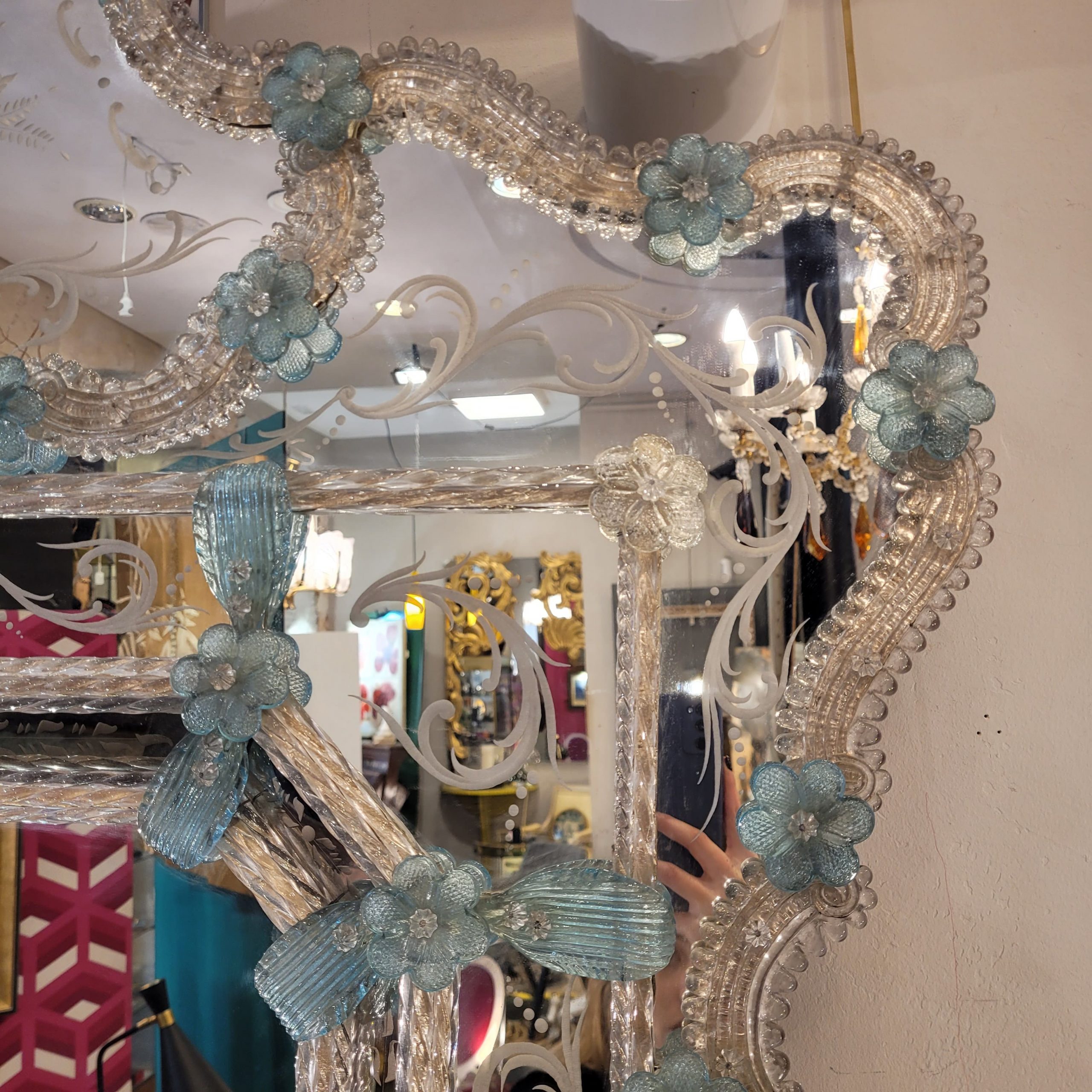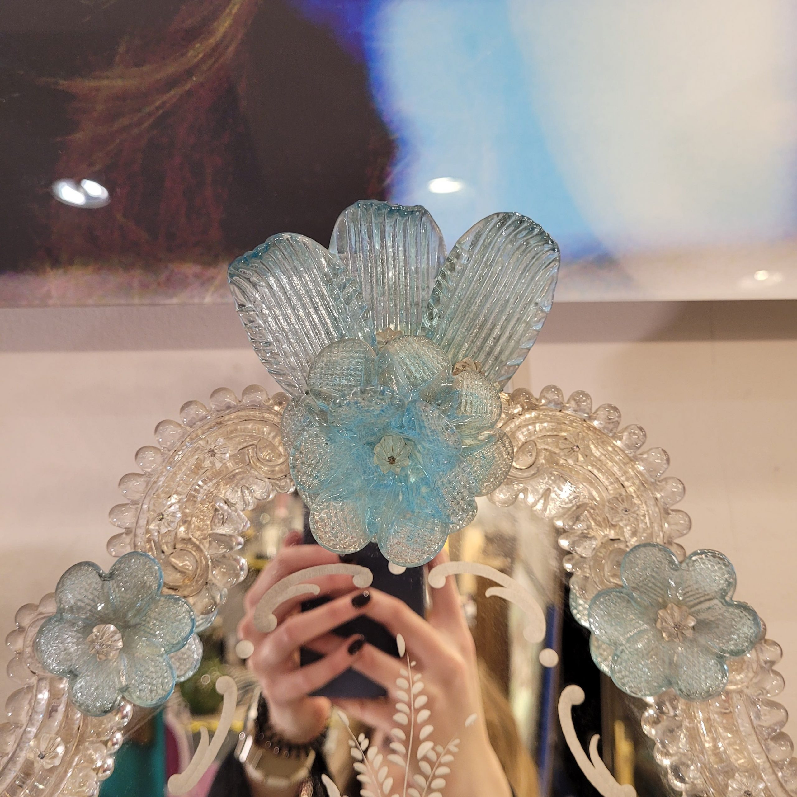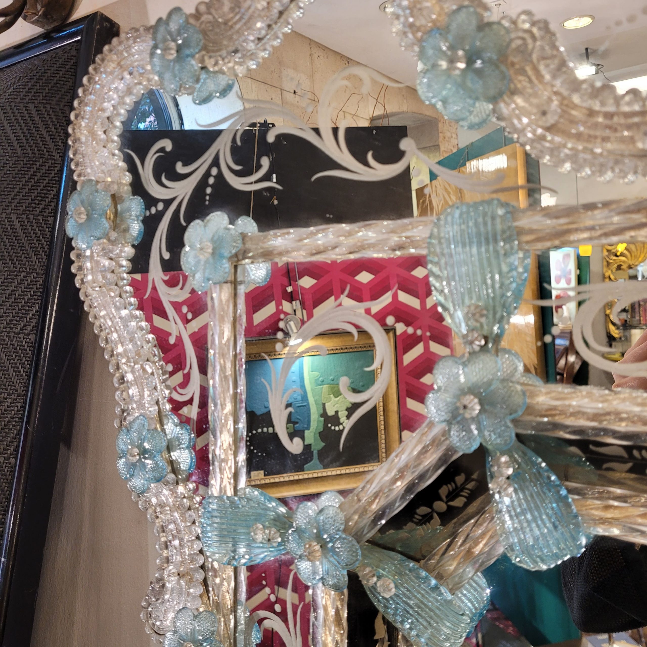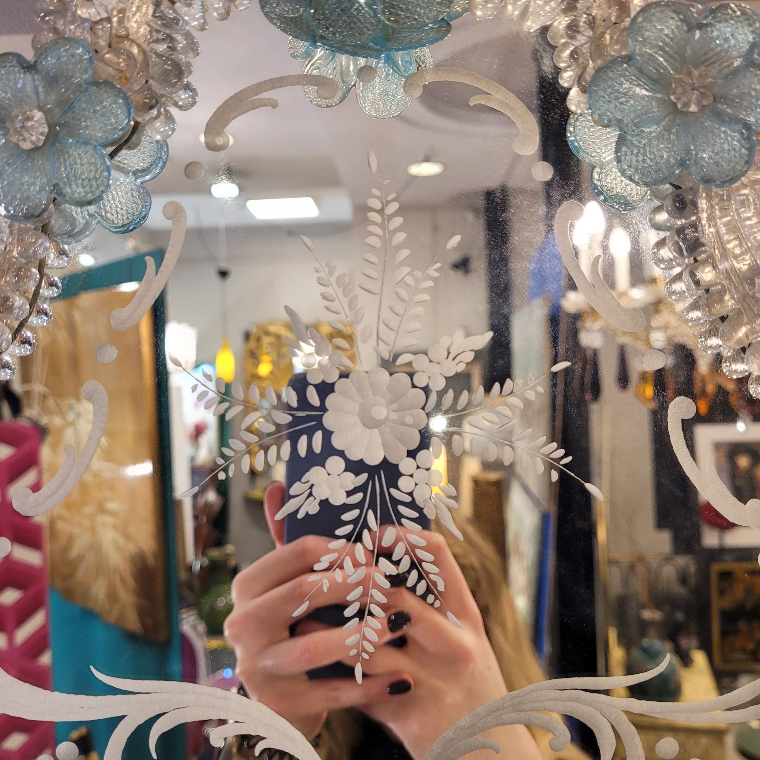 Excepcional espejo de gran tamaño de la prestigiosa firma italiana Ongaro e Fuga. La estructura se compone de una superposición de formas geométricas: primero un rectángulo con los ángulos en chaflán, un rectángulo y, sobre él, un marco de formas curvas (o mixtilíneas) tanto en la parte inferior como en la superior, que remata con un exquisito copete. Todos los perfiles se encuentran ornamentados con aplicaciones de cristal azul en forma de flor de seis pétalos en una sola pieza, piezas rectas sogueadas y otros motivos decorativos. Las entrecalles están grabadas al ácido siguiendo igualmente formas vegetales estilizadas. Mayor exuberancia en la flor del copete, con diversos cuerpos y hojas que la enmarcan. Parte posterior de madera maciza.