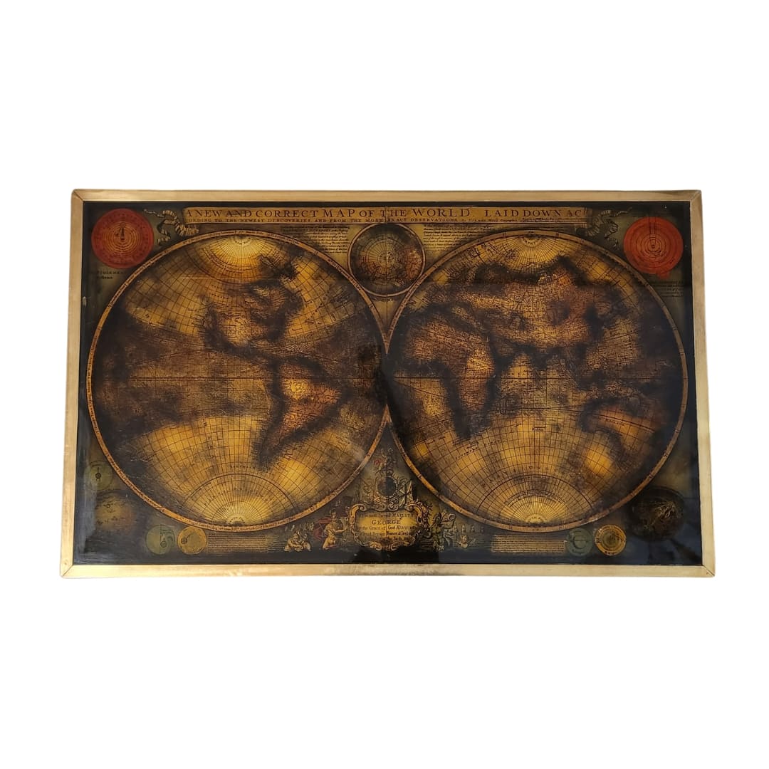 Magnifica mesa de centro o mesa auxiliar realizada por Maison Jansen hacia la década de 1970, ornamentada con un mapa que llama poderosamente la atención. Esta coffee table presenta una estructura sencilla realizada en madera, de líneas rectas y perfil cuadrangular. El sobre, en cristal, tiene un marco de latón dorado envejecido que lo protege y lo une a la estructura. Se trata de un coffee table que sigue el estilo de campaña, tan característico en el arte británico colonial y adoptado en muchas ocasiones por la casa Maison Jansen.