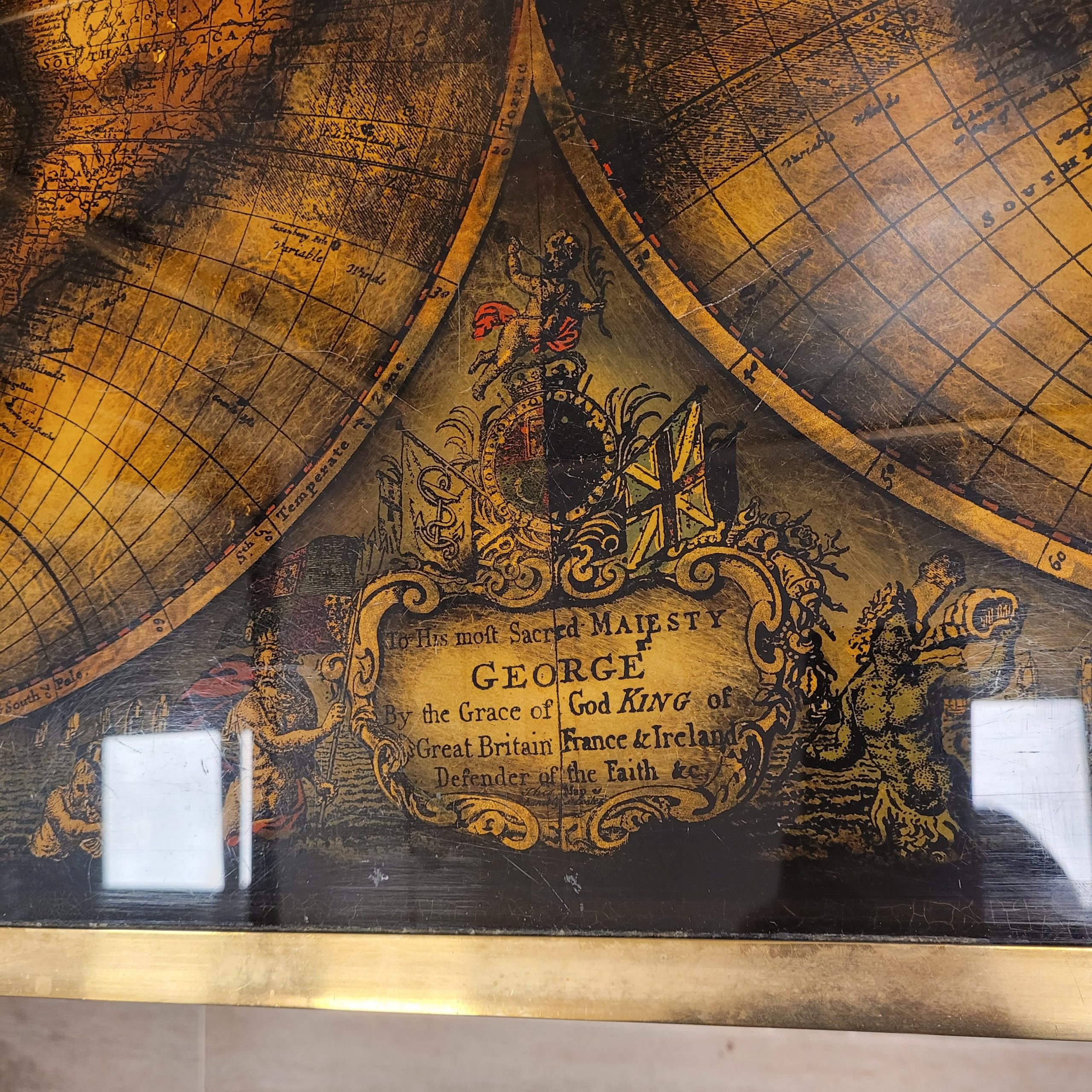 El mapa se titula “A new and correct map of the world down AC. Cording to the newest discoveries and form the most exact observations, by Herman Moll geographer.” Se trata de un mapa realizado por Herman Moll en el siglo XVIII, perteneciente a una colección de una treintena de mapas. Estos mapas se distinguen por su elaborada cartela e imágenes. Al igual que con muchas de sus obras, Moll utilizó estos mapas para poder dar a conocer y apoyar la política británica y sus derechos regionales en todo el mundo: calificó el océano Atlántico como el «Mar del Imperio Británico». En una cartela en la zona inferior aparece el texto: “To is most sacred majesty George, by the Grace of God king of Great Britain France & Ireland defender of the faith”.