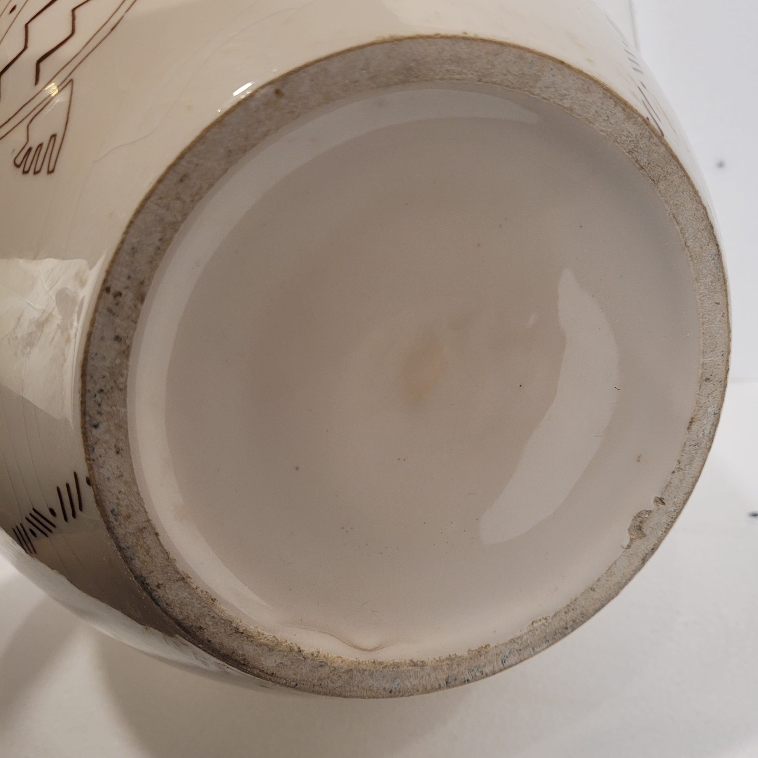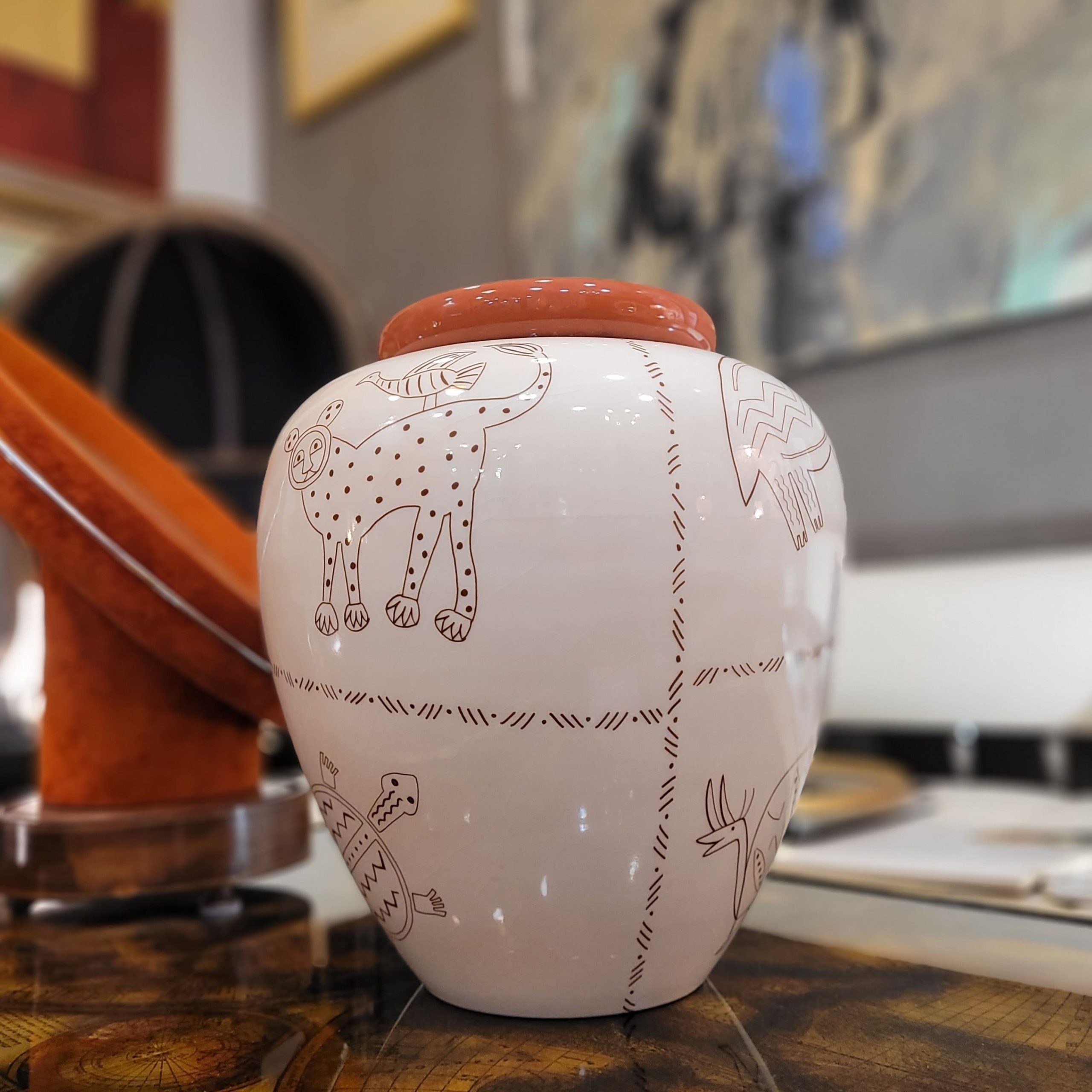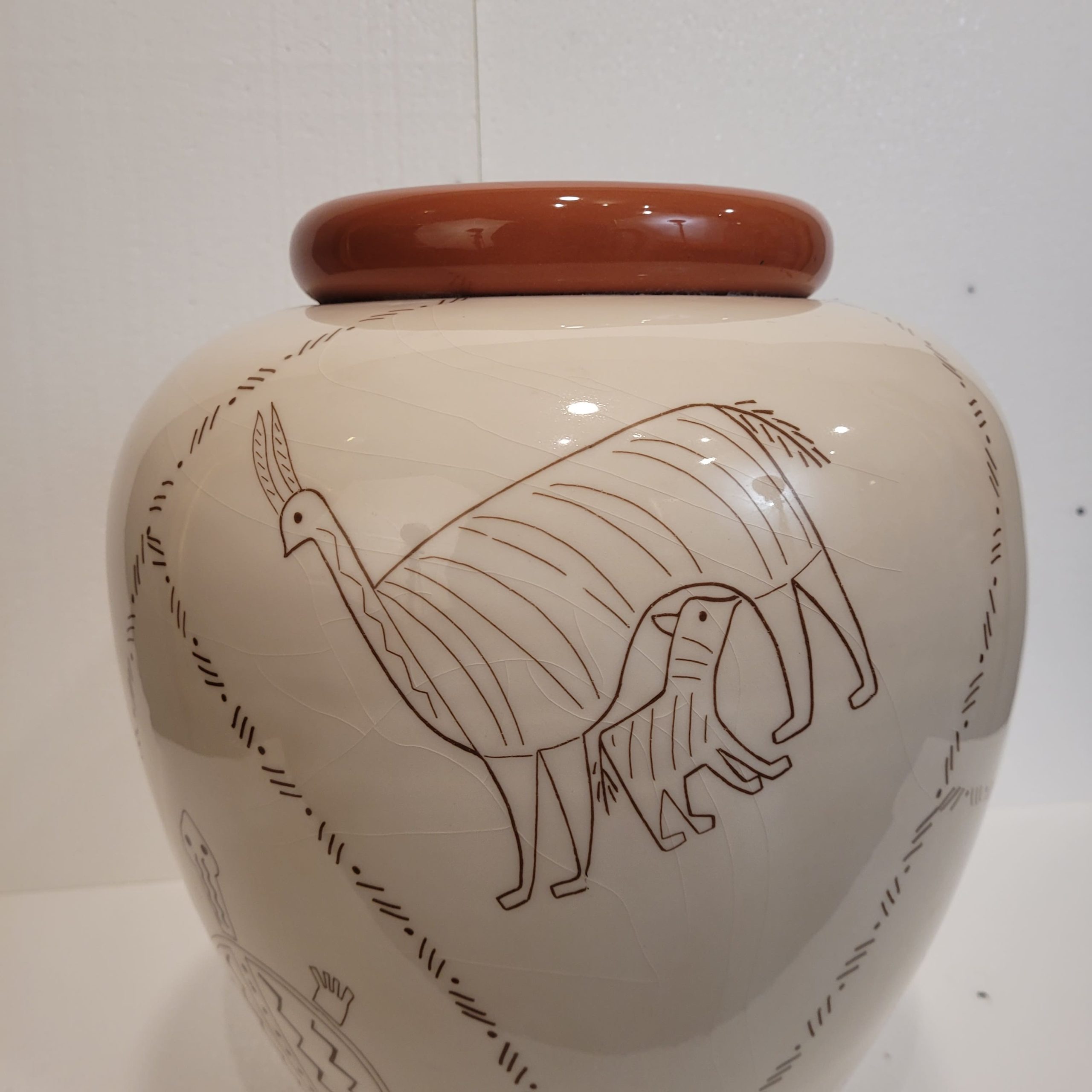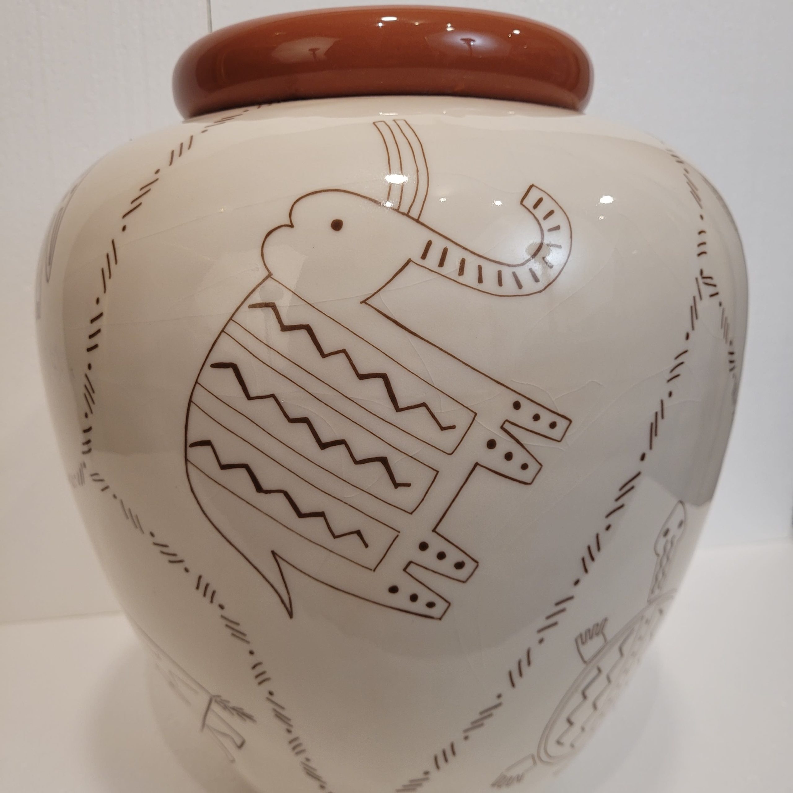 Exótico jarrón cerámico francés de la década de 1980 con diseño de animales inspirado en diversas culturas precolombinas. El diseño recuerda a representaciones artísticas propias de culturas precolombinas, como la Nazca, debido al uso del trazo lineal y la forma estilizada y minimalista de representar las figuras. El jarrón presenta un dibujo de lo que parecen ser camélidos sudamericanos (posiblemente llamas o alpacas), jaguares, tortugas, elefantes y armadillos, que son animales emblemáticos y recurrentes en el arte y la iconografía de diversas culturas precolombinas de la región andina, a excepción del elefante. Exhibe una silueta globular con un cuello prominente curvado y una boca ancha, con un cuerpo ancho en la parte superior y estrecho en la base. El cuello y el diseño animal están coloreados de un intenso tono teja, y el resto del cuerpo es de un suave crema.