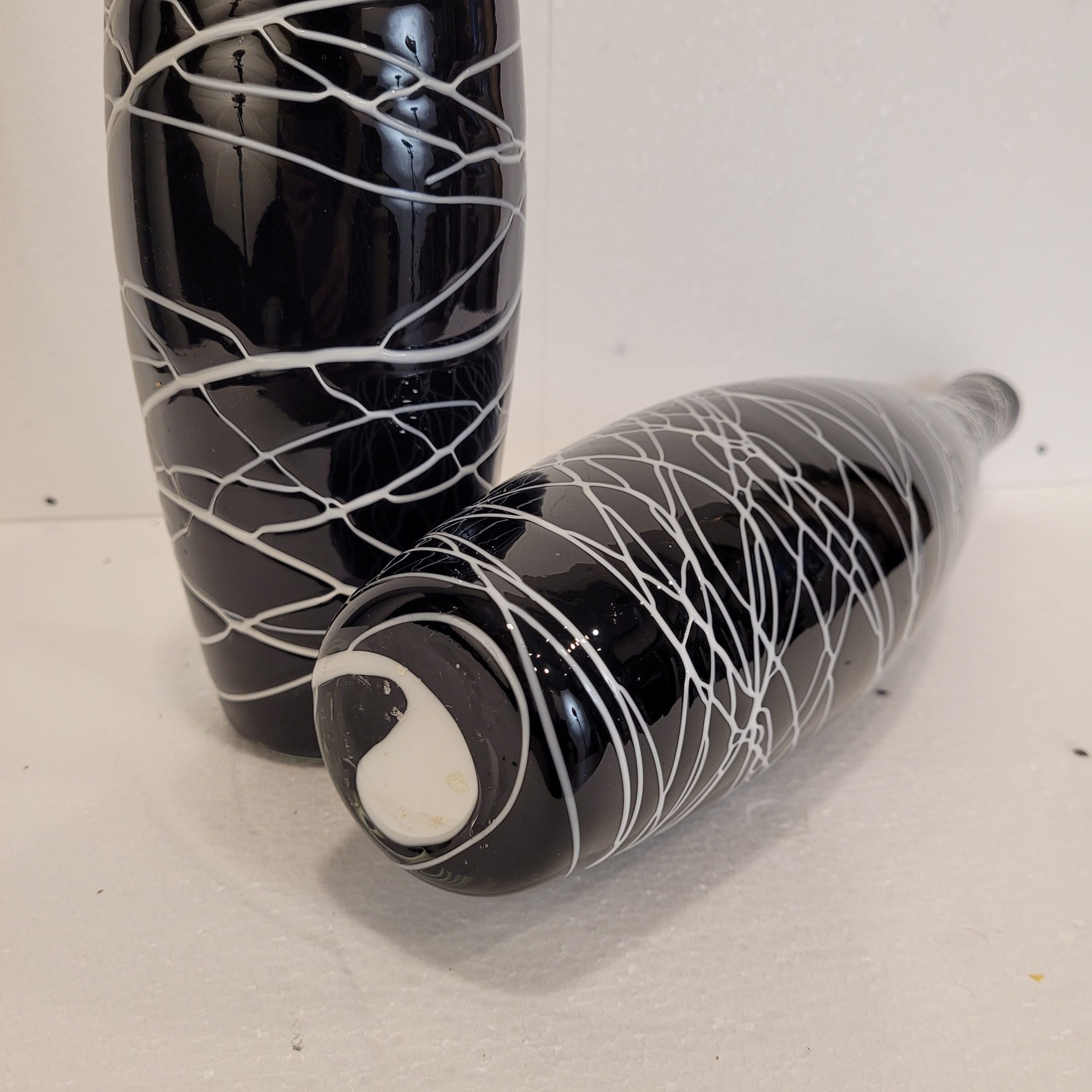 Elegante pareja de jarrones franceses de los años 70, elaborados artesanalmente en cristal negro con líneas blancas irregulares y orgánicas.