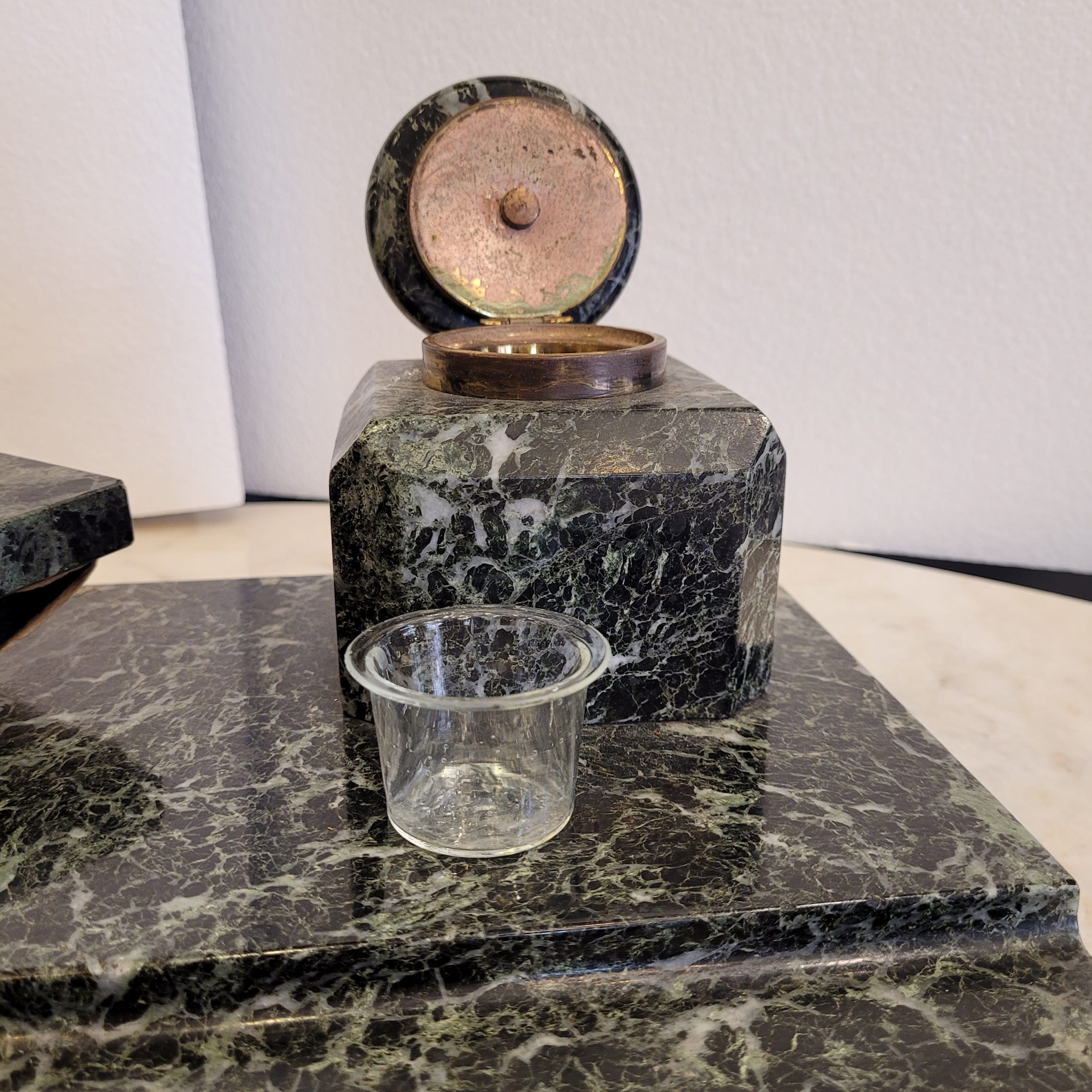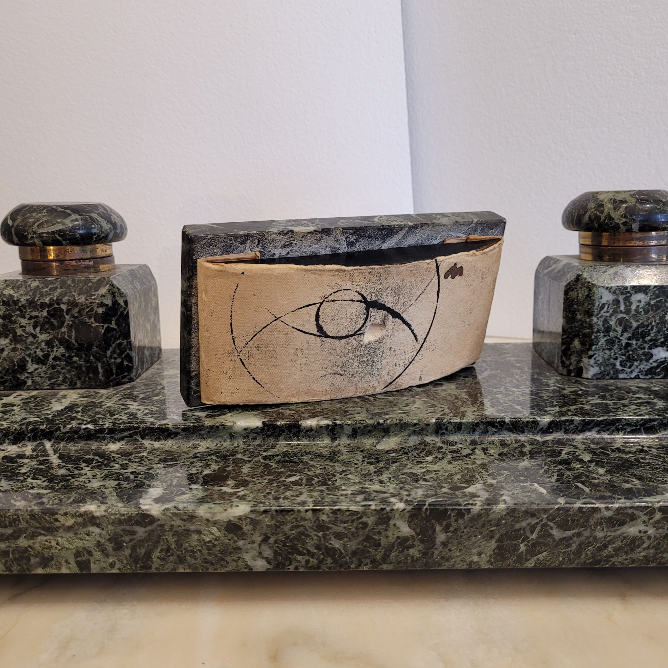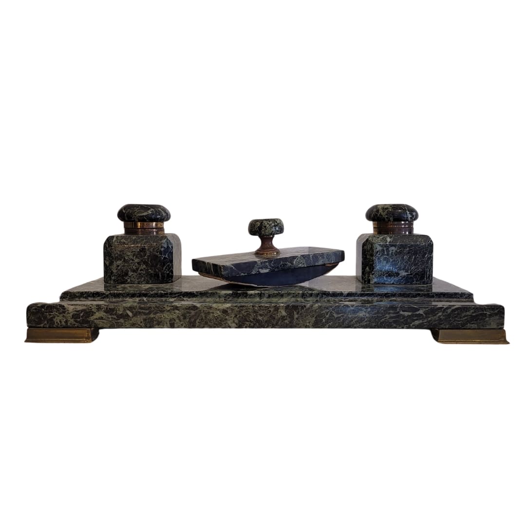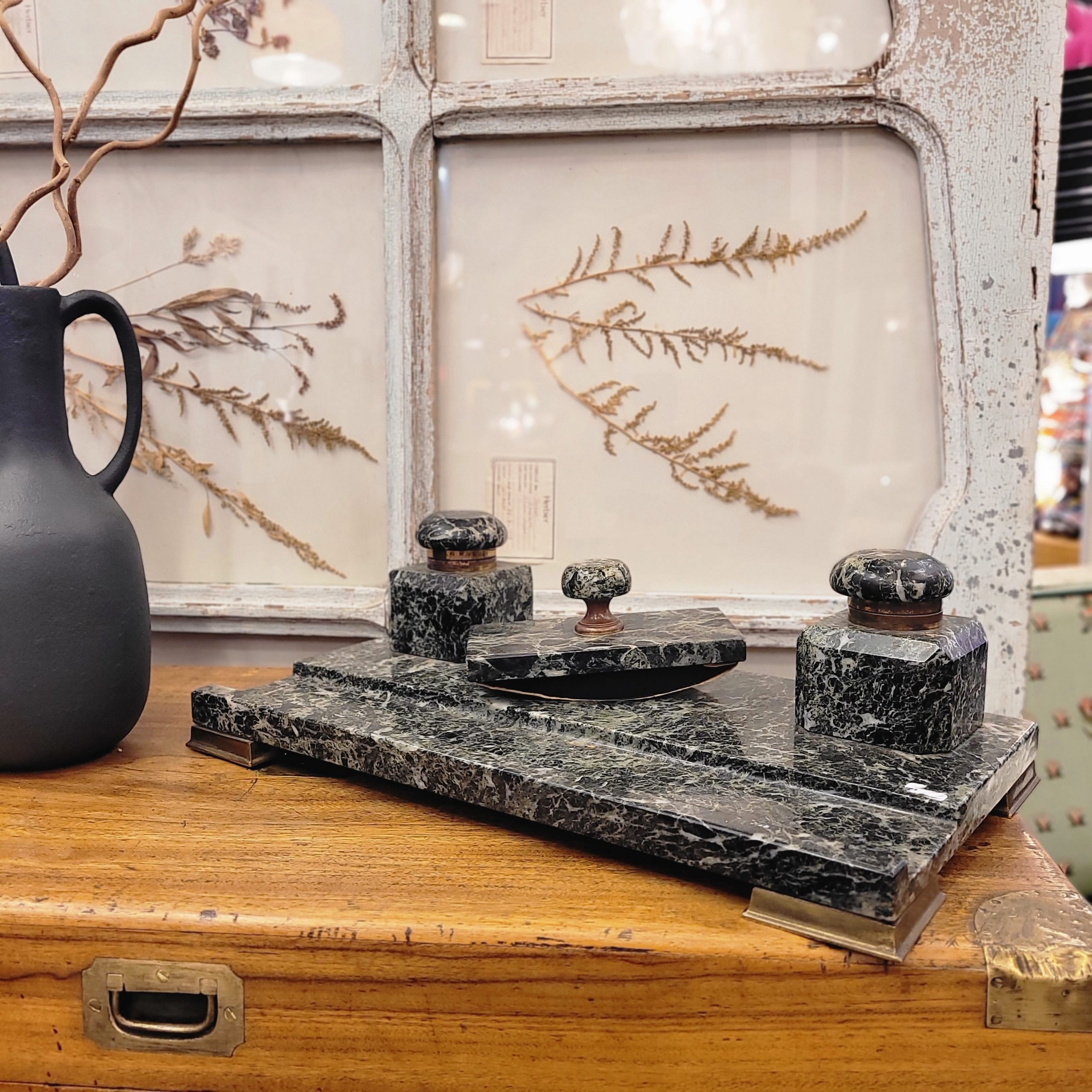 Elegante escribanía francesa, de estilo y época Napoleón III, en mármol negro y bronce dorado. Sobre el mármol negro, con vetas en gris y verde esmeralda se encuentran los tinteros, uno de ellos con tapa, y un camino rebajado, el espacio destinado a apoyar la pluma. Todo ello se asienta sobre una base de bronce cincelado, con patas con motivos florales. Es una pieza ideal para regalar, como objeto de coleccionista o útil de escritura, clásico y elegante.