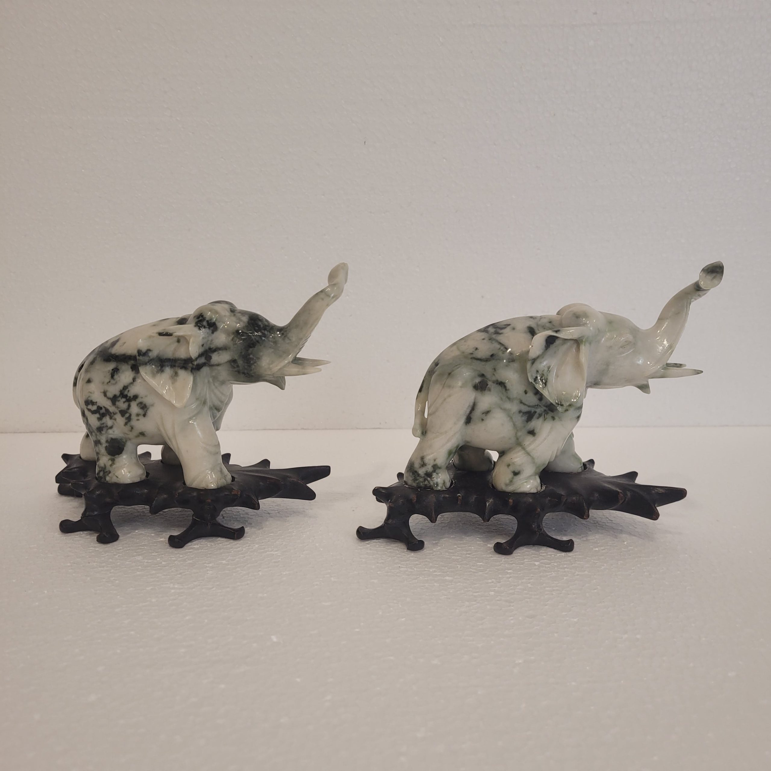 Curiosa pareja de elefantes pisapapeles de origen francés, realizados en la década de 1980. Las figuras están talladas en mármol veteado, reconocible por su cromatismo lechoso con vetas grises y negras. Ambos elefantes se presentan en actitud dinámica, con la trompa elevada y descansan sobre bases de madera oscura tallada, de perfil orgánico e irregular. Es una pieza muy cercana al gusto francés de finales del siglo pasado, muy interesado en la combinación de estilos exóticos, como es el caso de estos pisapapeles, que pueden recordarnos a movimientos estilísticos asiáticos.