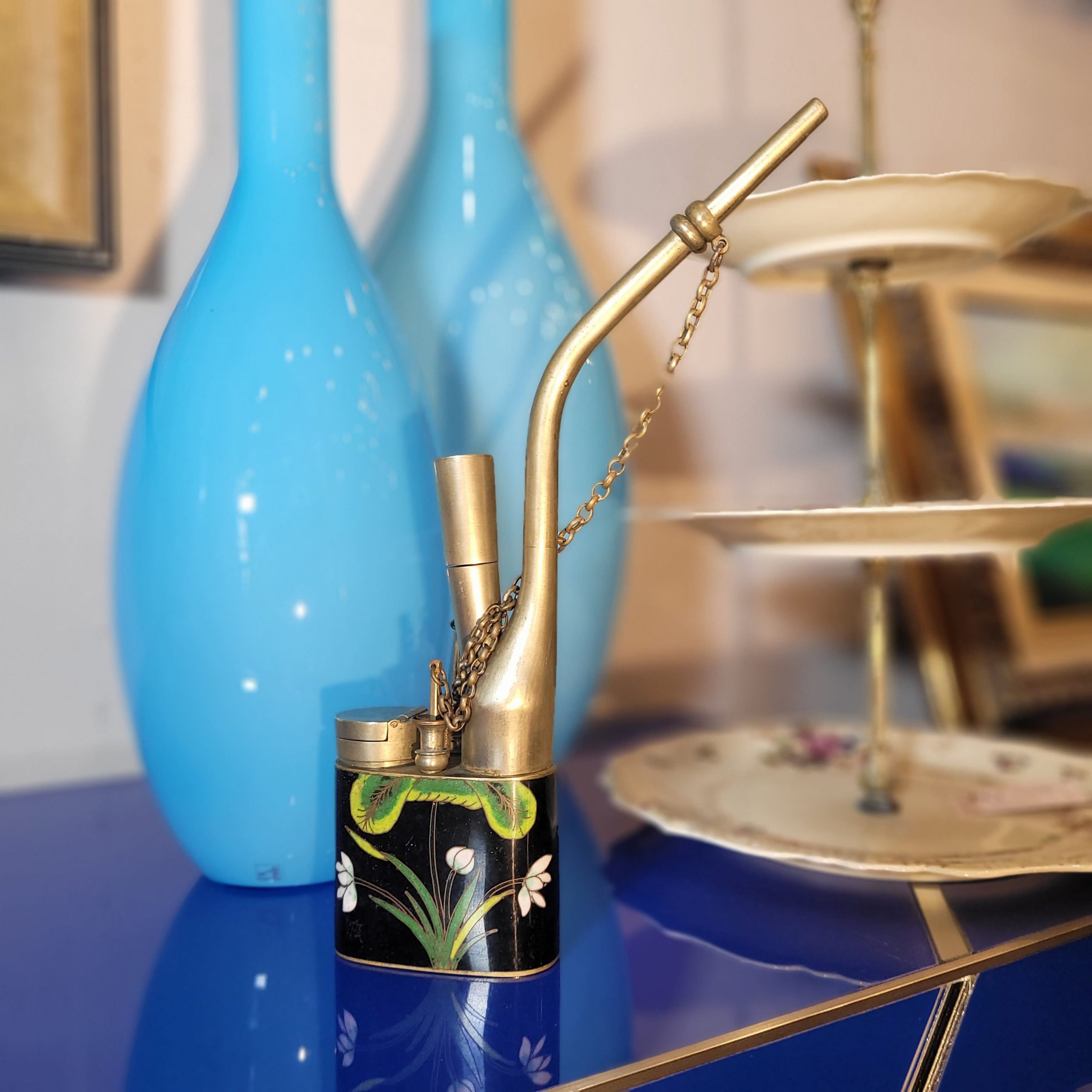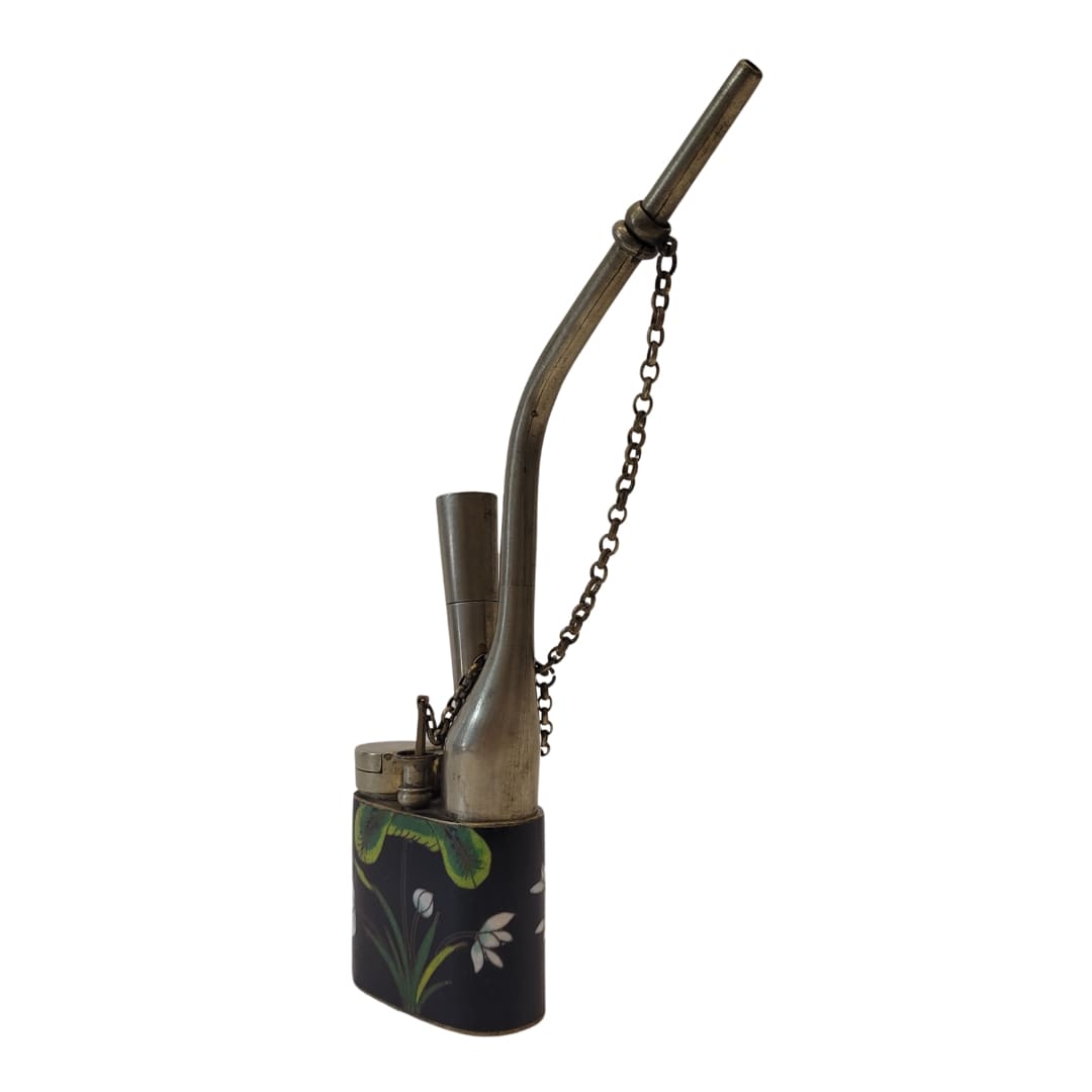 Exquisita pipa de agua realizada en metal con decoraciones en cloisionné, realizada a finales del siglo XIX en China. Presenta una refinada decoración de flores de loto que resaltan sobre el fondo oscuro. Estructura sencilla, en la parte principal y decorada se vierte el agua; tiene una tapa que presenta sello en caracteres chinos. Gran boquilla estilizada para fumar, además de dos punzones para el tabaco, unidos por una cadena. Comúnmente llamada pipa de opio, se usaba para fumar tabaco o tabaco húmedo (narguile). El uso de la pipa de agua para fumar se introdujo en China a finales de la dinastía Ming (syllabus XVI), junto con el tabaco, a través de Persia y la Ruta de la Seda. Durante la dinastía Qing, se convirtió en el método más popular de fumar tabaco, y se popularizó en la República.