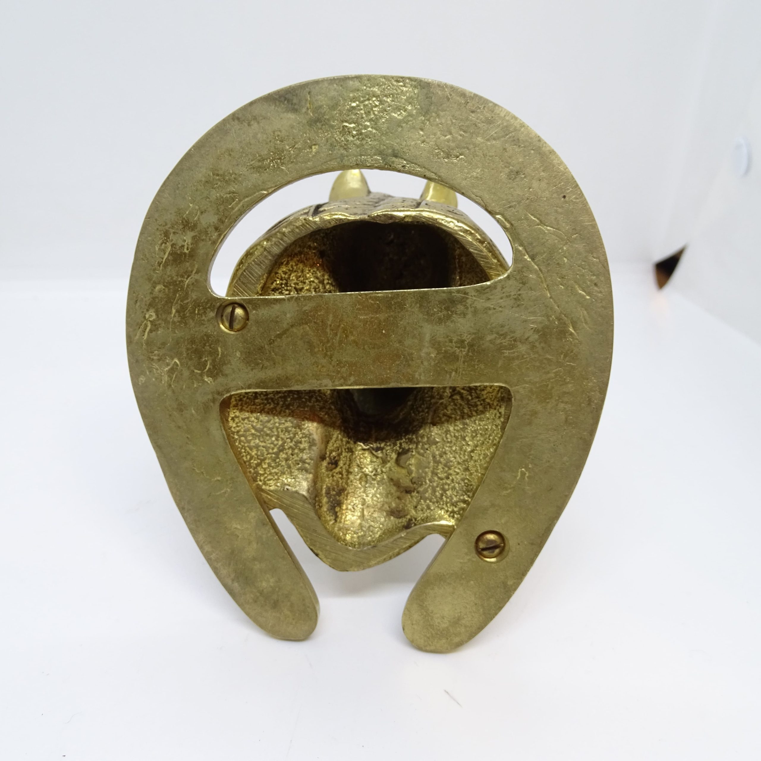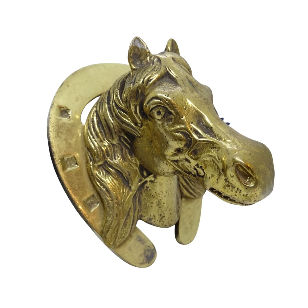 Exquisita placa decorativa de pared, que puede ser utilizada como colgador, con forma de cabeza de caballo y herradura, realizada a principios del siglo XX en bronce dorado.