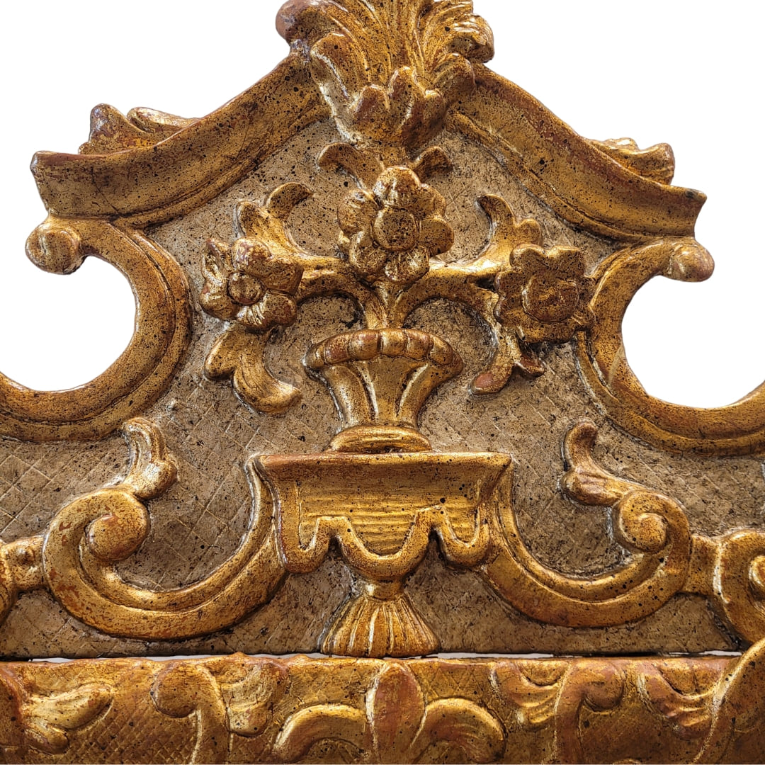Este exuberante espejo azogado presenta una forma rectangular rodeada por un marco exquisitamente dorado con oro fino y sumamente ornamentado. El marco no es uniforme en su anchura; se amplía y se decora de manera elaborada en las esquinas y particularmente en la parte superior, donde se desarrolla un copete o remate ornamentado de gran tamaño, que presenta en su zona central una copa de la abundancia con flores que resalta del fondo plateado; enmarcado por multitud de rocallas que crean una suerte de arquitectura efímera. Recuerda a los imponentes espejos de consola o de pared palaciegos del siglo XVIII.