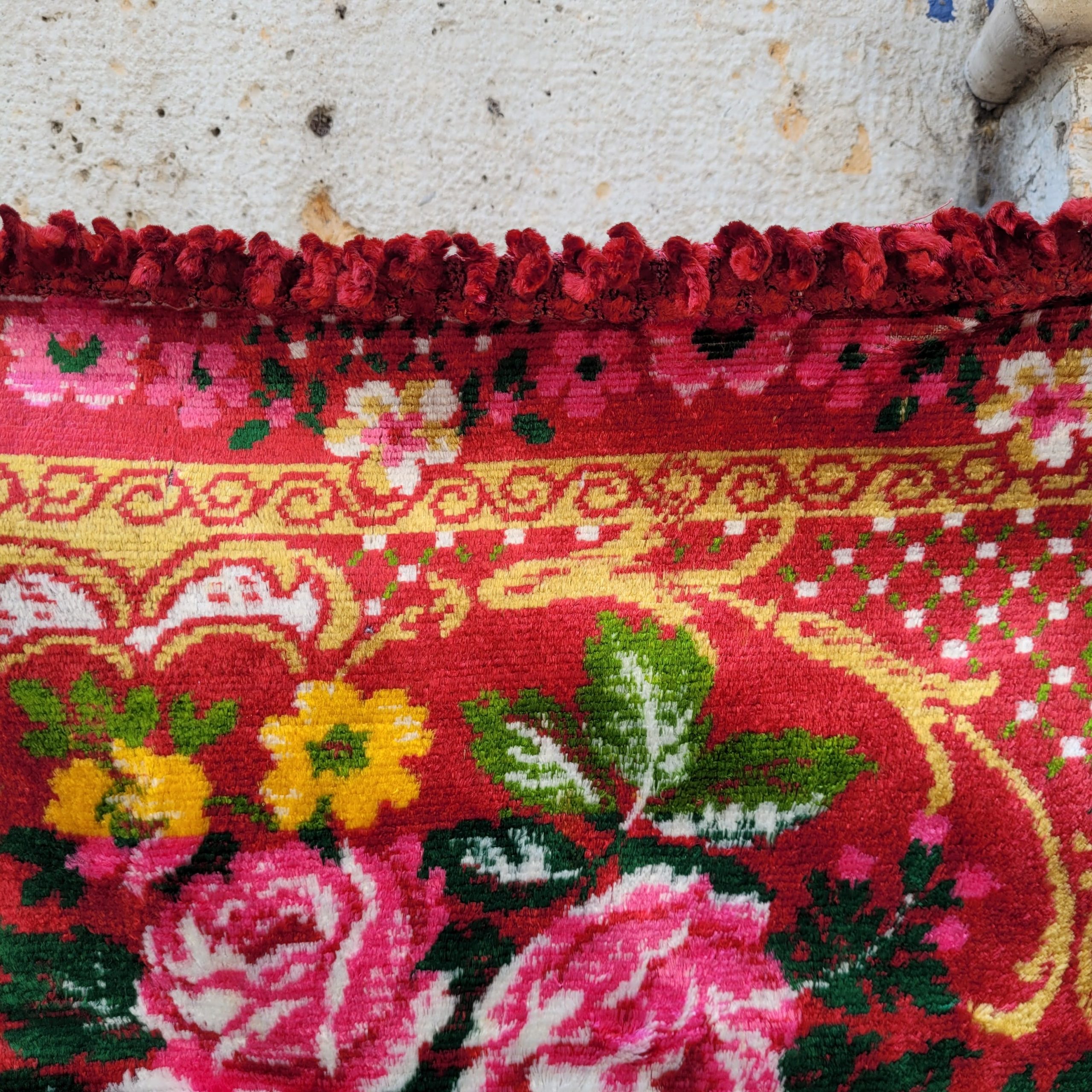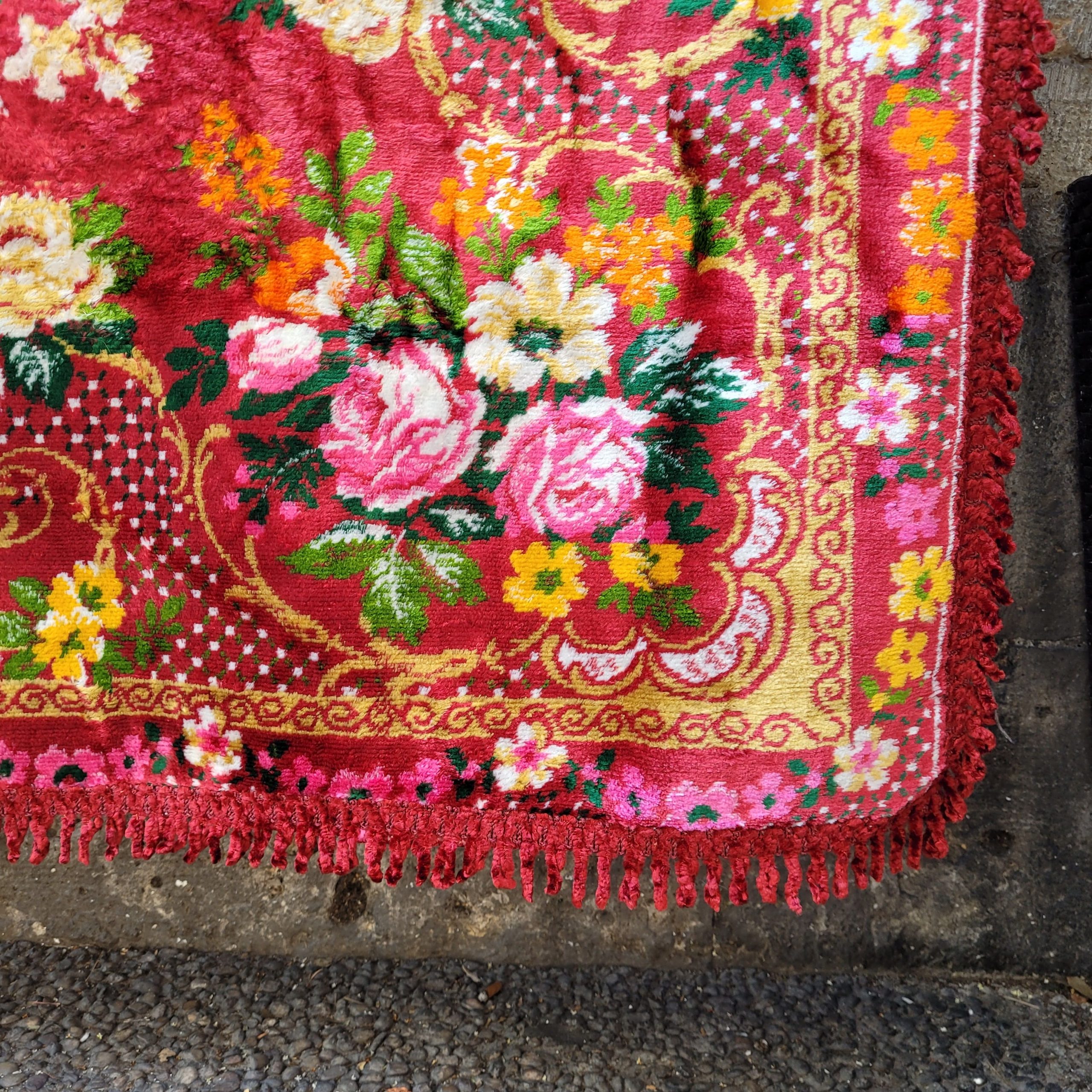 Excepcional colchas decorativa procedente de Europa del Este o de Turquía, fechada en torno a la década de 1940. Esta pieza destaca por su exquisita elaboración artesanal y su fuerte carga simbólica, herencia directa de la rica tradición textil de influencia oriental. Exhibe un complejo diseño floral elaborado en una lujosa tela de terciopelo de seda.