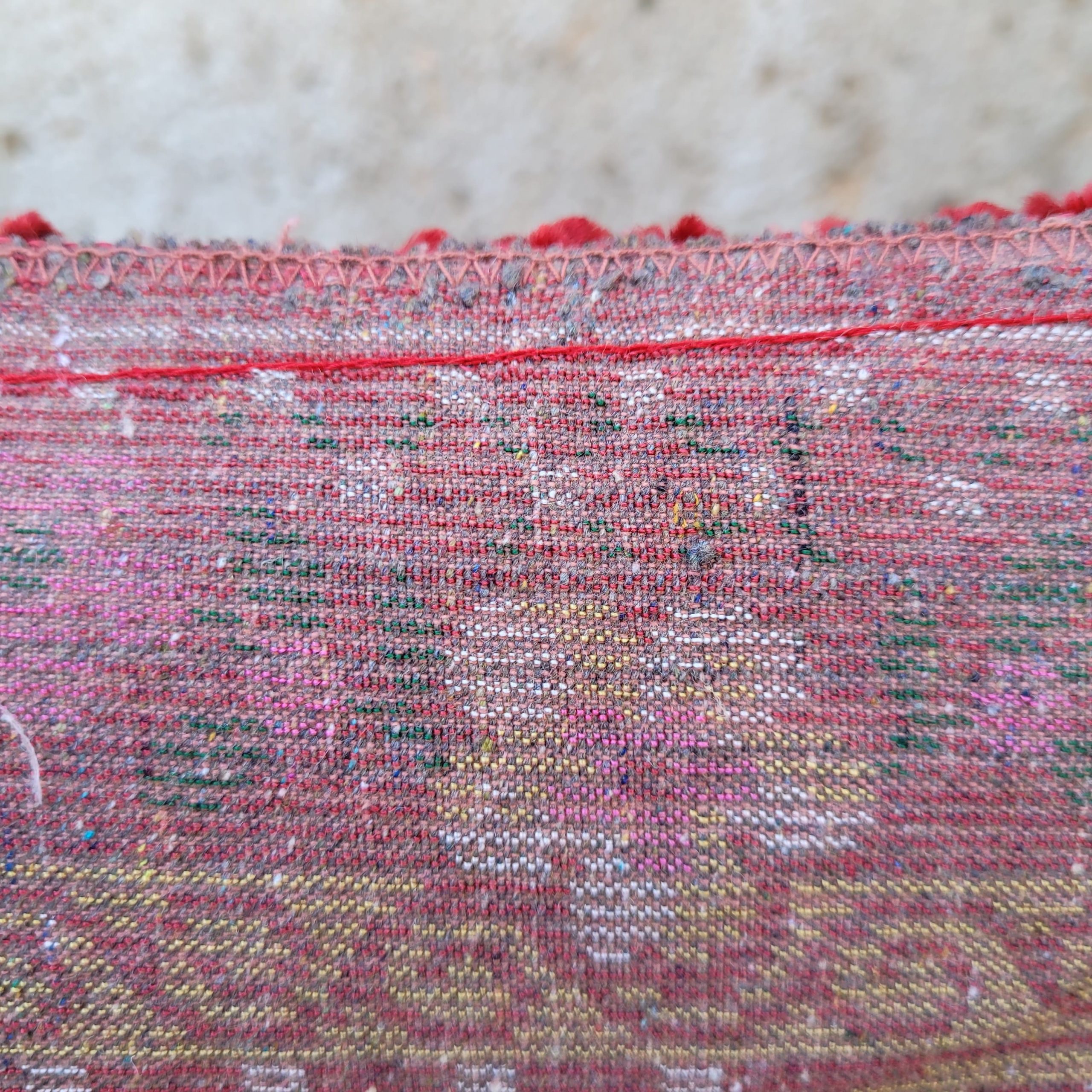 El diseño se completa con un marco vegetal y geométrico, una suerte de guirnaldas, y en el exterior de la colcha una orla de flecos que recuadra la pieza. Este detalle decorativo no solo aporta movimiento, sino también cierra la obra con sofisticación.