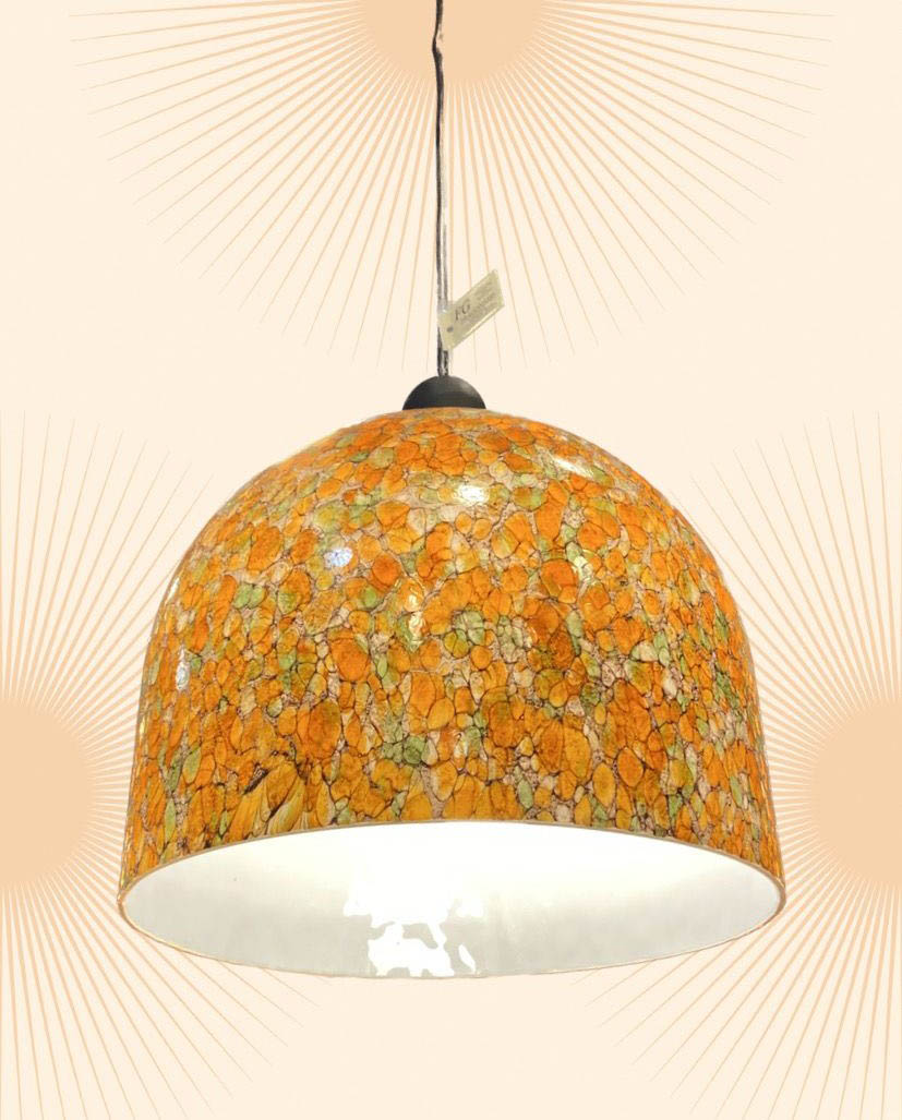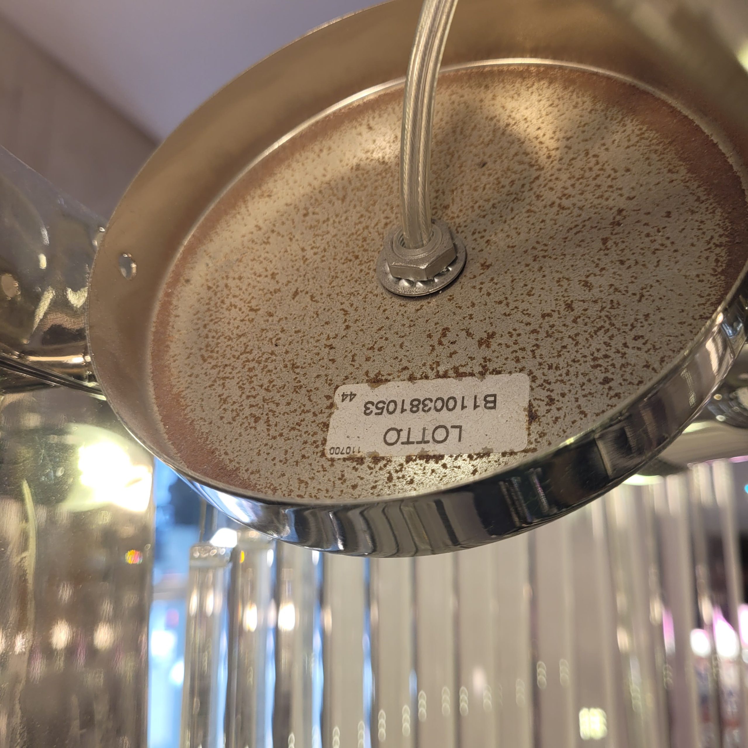 La luz proviene de cinco casquillos para bombillas en el interior de la estructura de metal. Incluye información técnica de potencia y electricidad en la base de la estructura. Se cuelga del techo mediante unos hilos metálicos regulables.