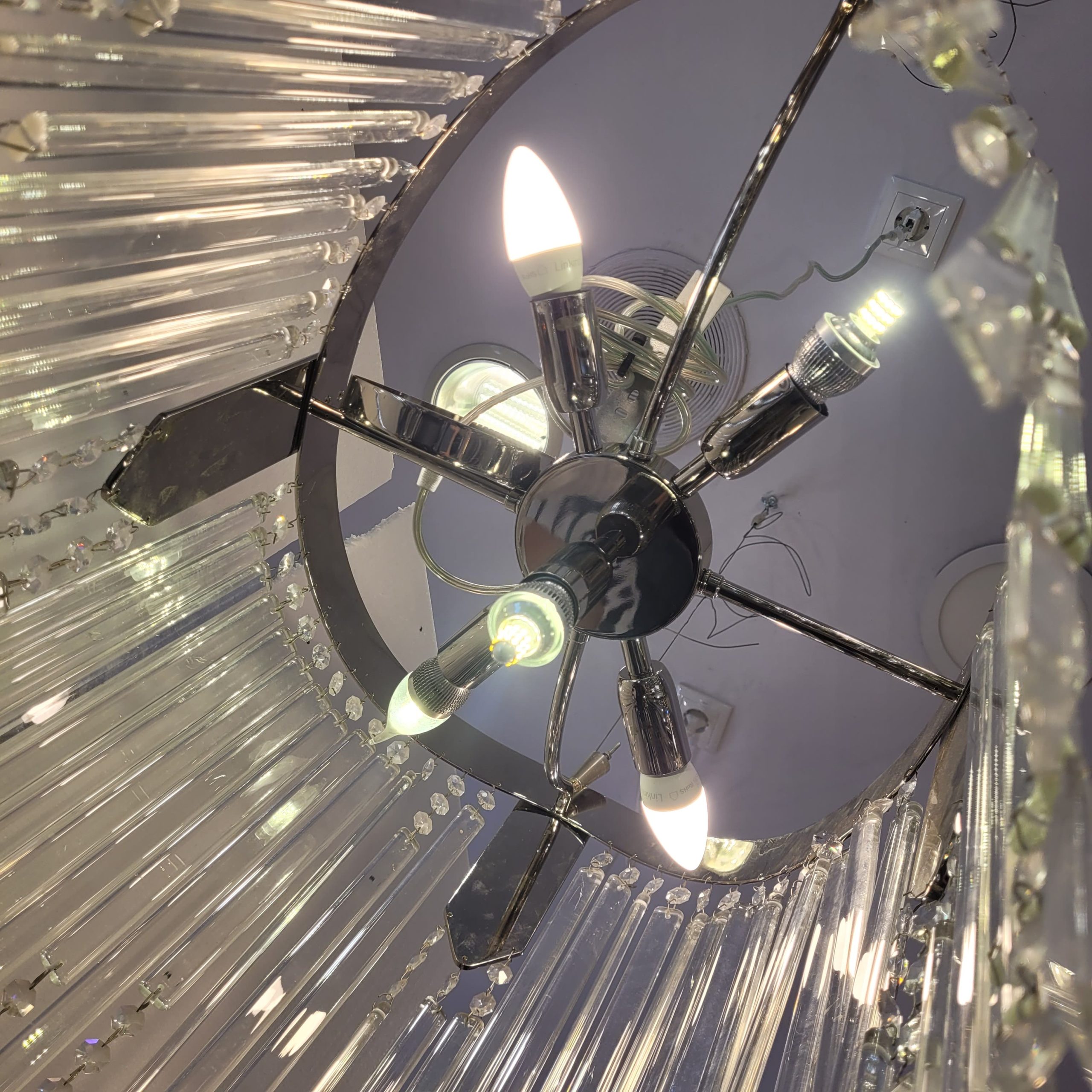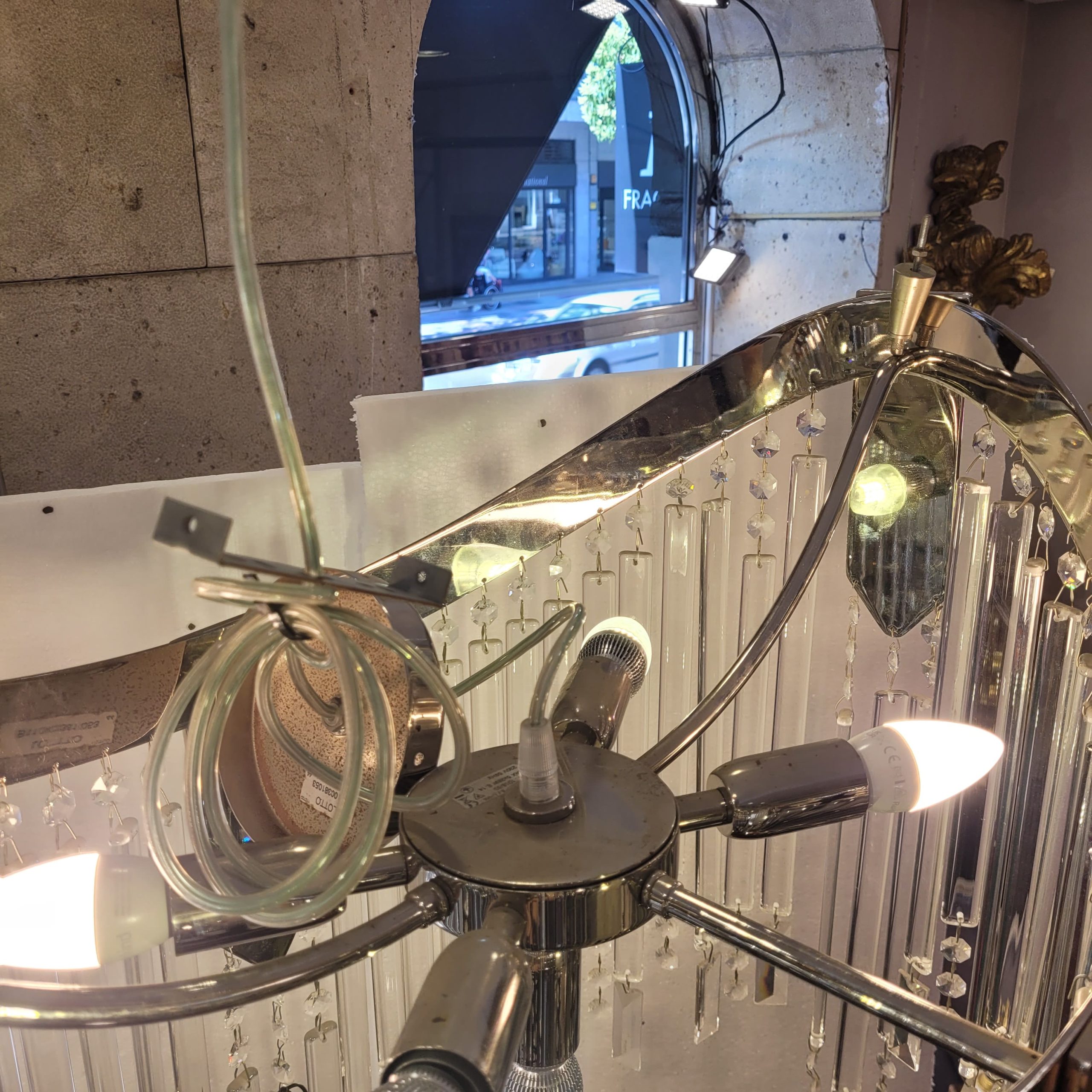 Elegante lámpara de techo o chandelier de cristales tallados geométricos y estructura metálica ovalada y cóncava.