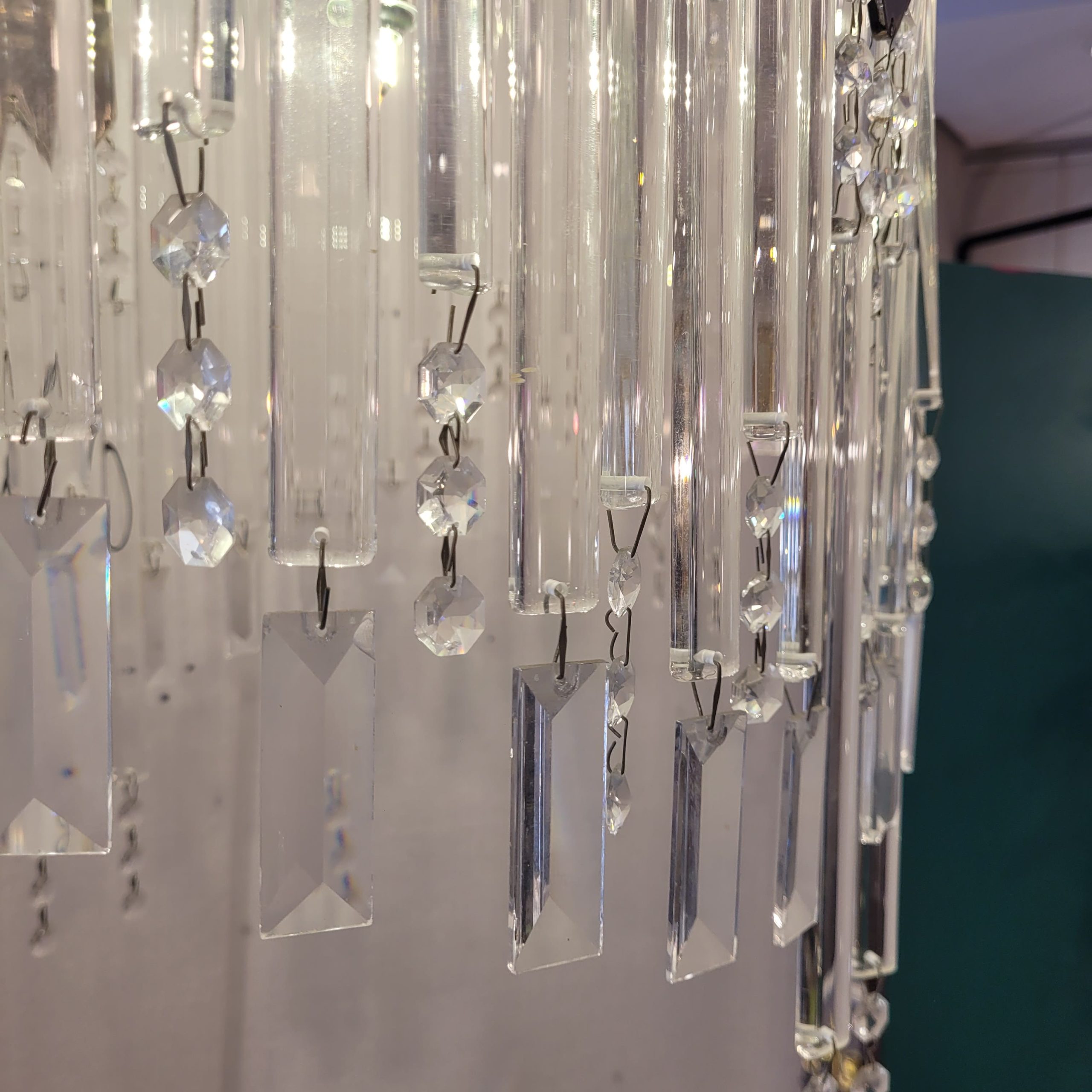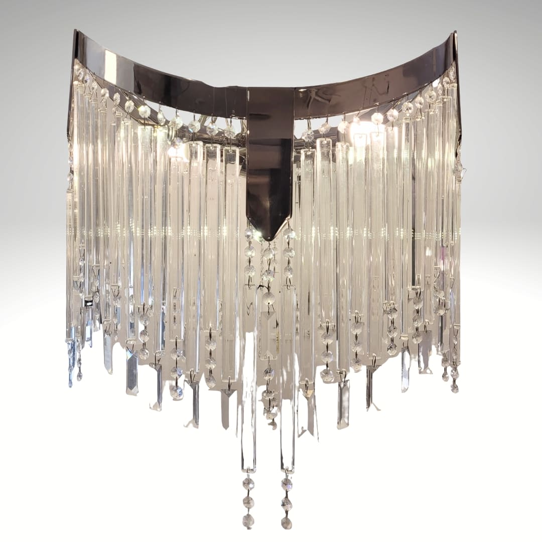 Presenta una estructura en aluminio de forma ovalada y curvada, cóncava, de la que penden alrededor de 60 cadenas de cristales (pandelocas) alargados y tallados. Estas cadenas están compuestas de un cristal con corte redondo, uno largo en corte baguette redondeado, otros tres redondos, y algunos de manera alterna presentan también otro cristal baguette más corto. En los extremos curvos de la estructura se encuentran cuatro apéndices equidistantes que cuelgan tres cadenas de cristales cada uno, con una secuencia formada por tres cristales redondos, uno largo y tres redondos, a excepción de la cadena central en la cual el cristal largo es de menor longitud que sus vecinos. El uso del cristal transparente y la composición escalonada generan gran impacto visual; además, los detalles en metal plateado contrastan con la ligereza del vidrio.