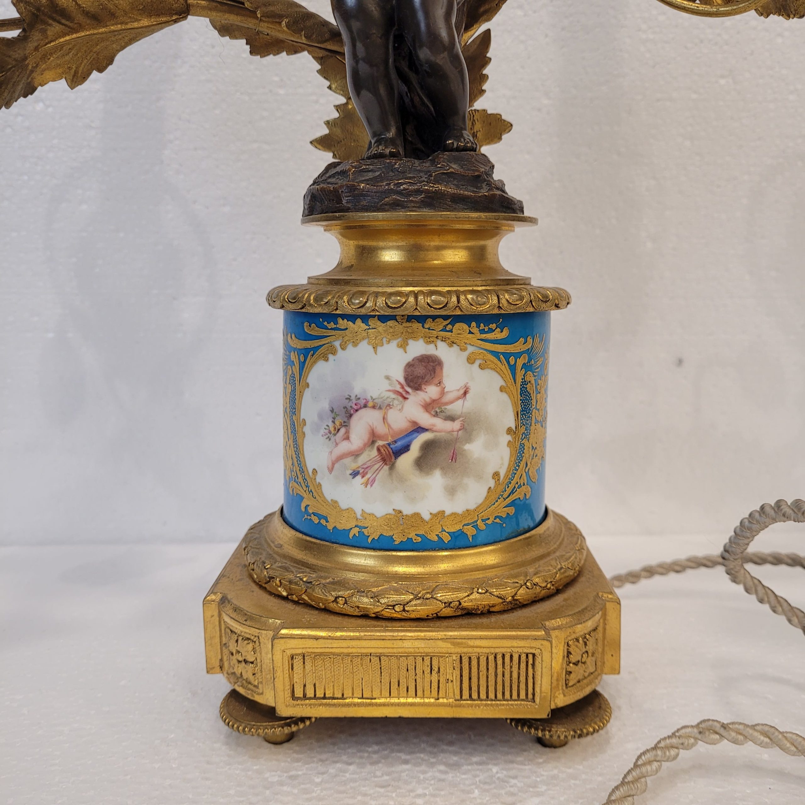 Deliciosa lámpara candelabro de dos luces, datado alrededor de la década de 1870 y con instalación eléctrica posterior, en estilo Napoleón III. Exquisitamente elaborado por el reconocido escultor y broncista Victor Paillard, el candelabro presenta dos brazos adornados con guirnaldas de flores y hojas, elaborados al igual que la base en ormolú. Sobre la base encontramos una pequeña pieza de porcelana azul al estilo de Sèvres pintada a mano que representa a Cupido tirando flechas. Esta figura infantil se repite en la escultura central que sostiene los dos brazos de guirnaldas, un querubín recogiendo flores con su capa. Los brazos de luz tienen bases de cristal sobre las que se ha montado una instalación eléctrica para colocar bombillas, con el portalámparas oculto por canutillos de vidrio azul opaco. La pieza descansa sobre cuatro pequeñas patas de bronce dorado. Una pieza exquisita y única de gran refinamiento estético y belleza atemporal.