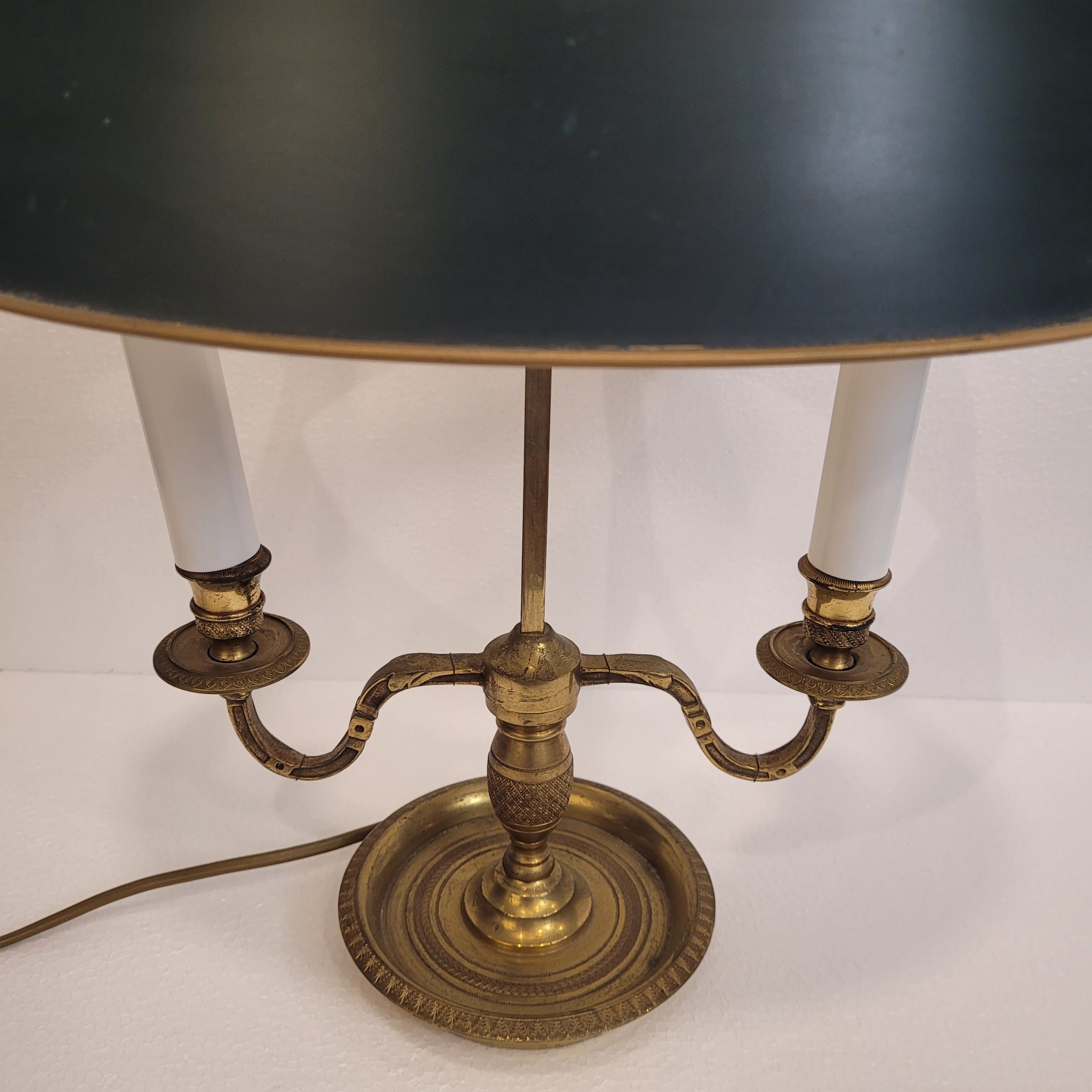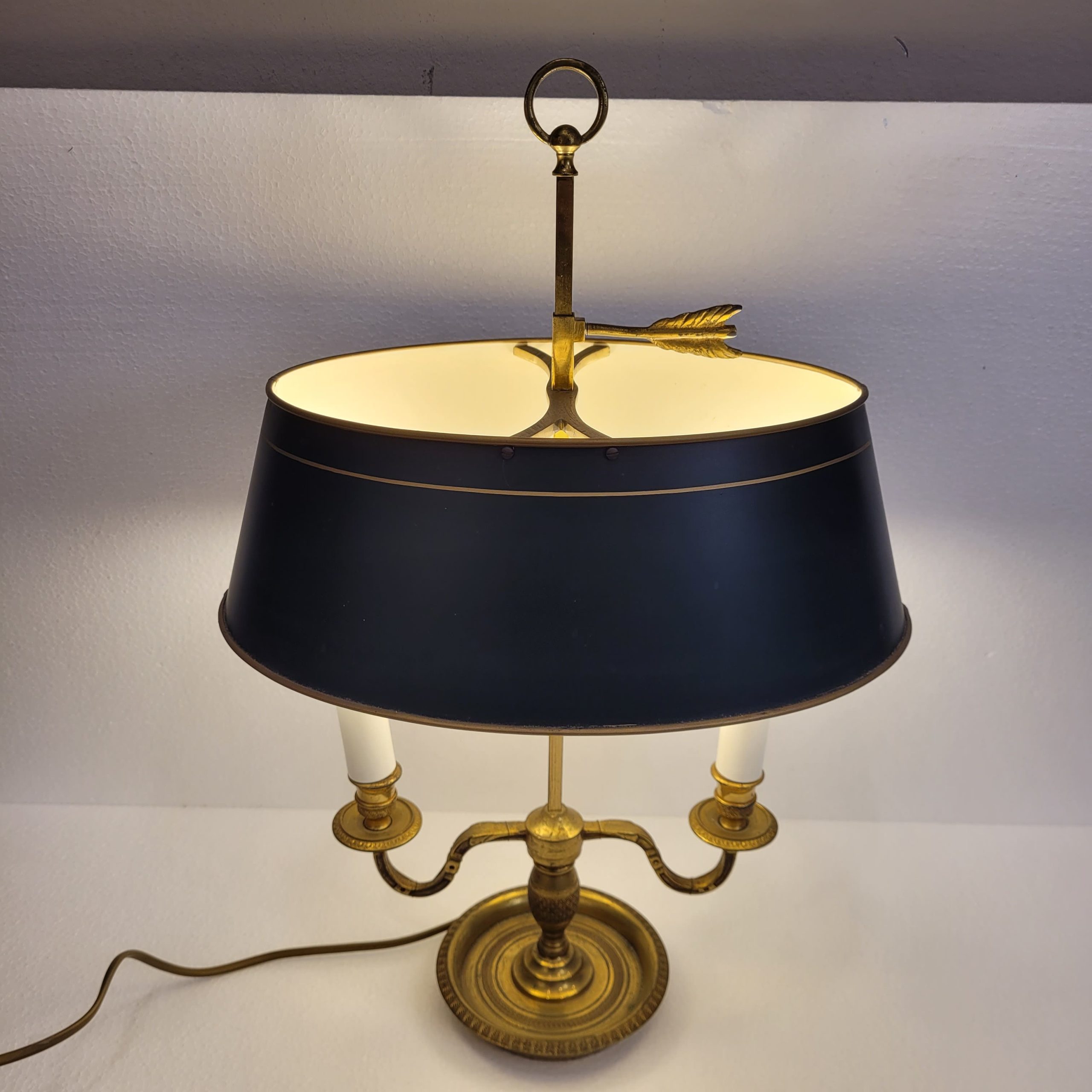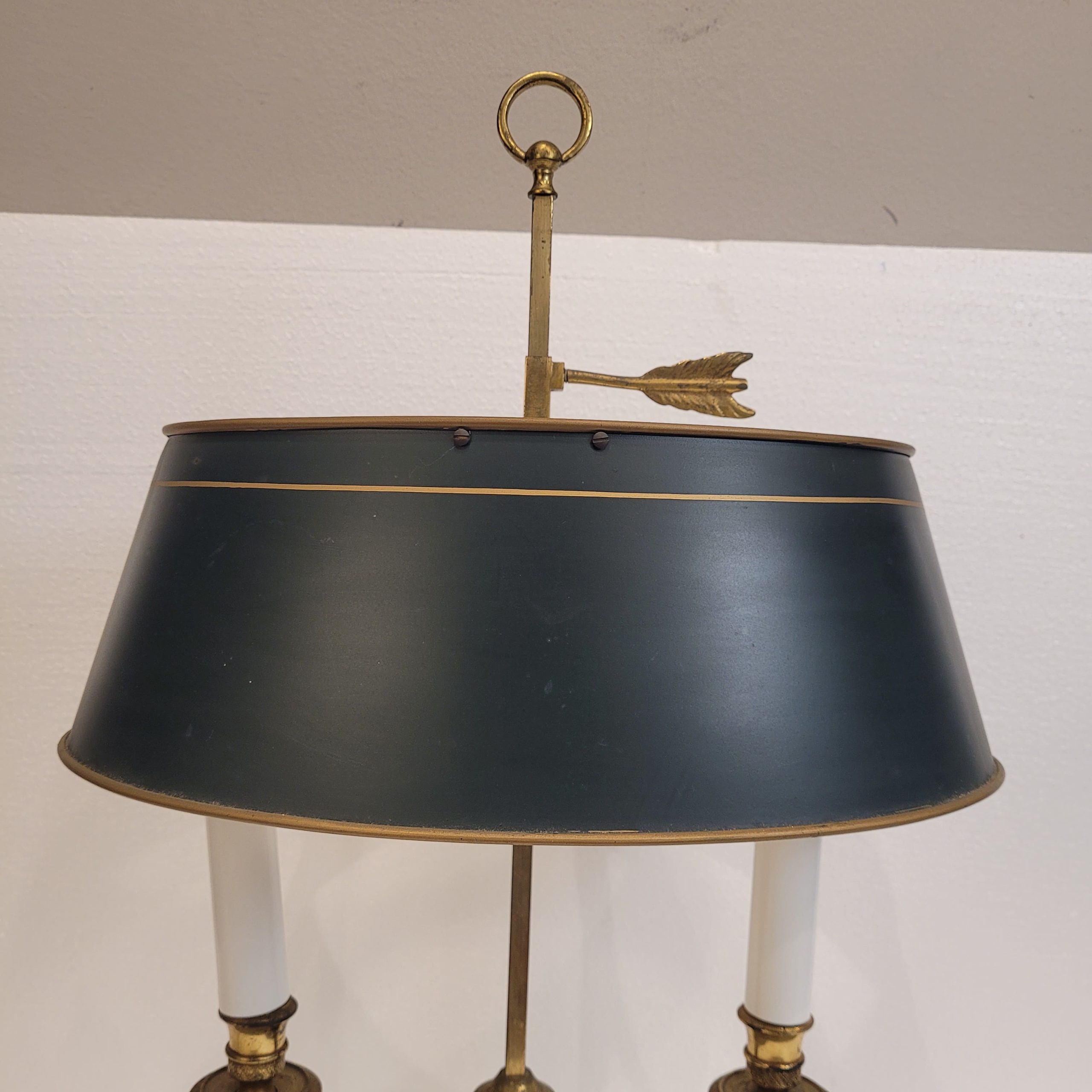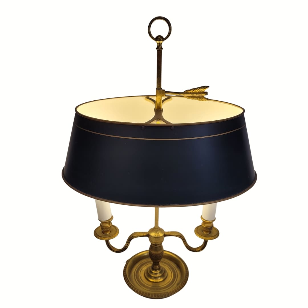 Elegante lámpara de mesa francesa, tipología conocida como lámpara bouillotte. Realizada en bronce dorado, con dos brazos en forma de voluta y una pantalla de tôle metálico en verde intenso con un fino ribete también dorado. El remate de flecha ajustable es una referencia clásica de la bouillotte.
