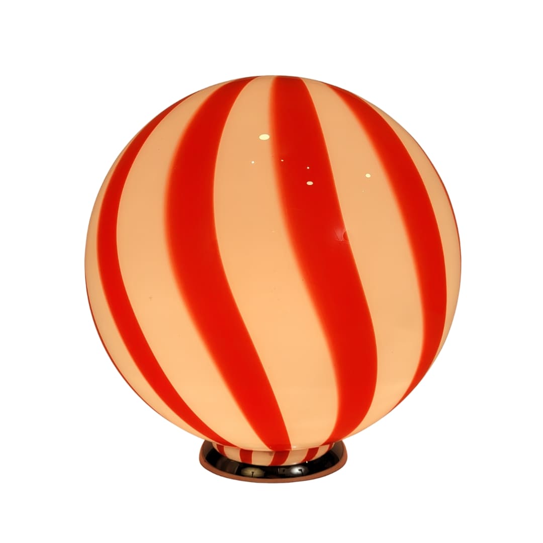 Divertida y original lámpara de mesa con globo de cristal de murano y pie de aluminio, años 80. El globo esférico, de cristal soplado, presenta un patrón de rayas rojas y blancas que simula la apariencia de un caramelo. Perfecta para añadir un toque de color a cualquier estancia.