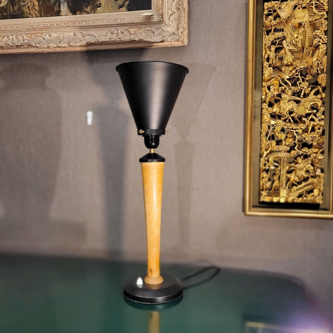 Excepcional lámpara de mesa o de escritorio de diseño nórdico. Lo original de esta lámpara es el juego geométrico, pues el pie de madera de teca presenta una forma cónica, mientras que la tulipa, de latón, presenta esa misma forma cónica pero inversa, enfocando la luz hacia arriba. La luz es quizás uno de los factores más importantes de la sociedad actual, ya que puede crear espacios, modular el ambiente y construir nuevas dimensiones. El interruptor se encuentra en la base. Buen estado para su antigüedad y uso.