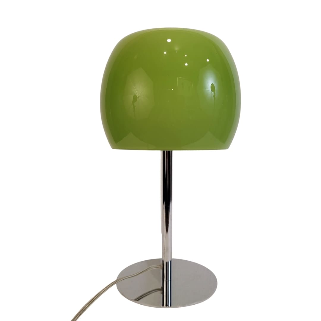 Espectacular lámpara de mesa o lámpara auxiliar, modelo 50-1170 de la reconocida firma española Schuller, empresa de origen valenciano dedicada a la iluminación. De diseño elegante y moderno, presenta un pie metálico de forma circular y plano desde el que nace un esbelto pie que sostiene la tulipa de cristal verde manzana que, además del color, parece emular la forma. Conserva la pegatina de la base con los detalles técnicos y el nombre de la firma.