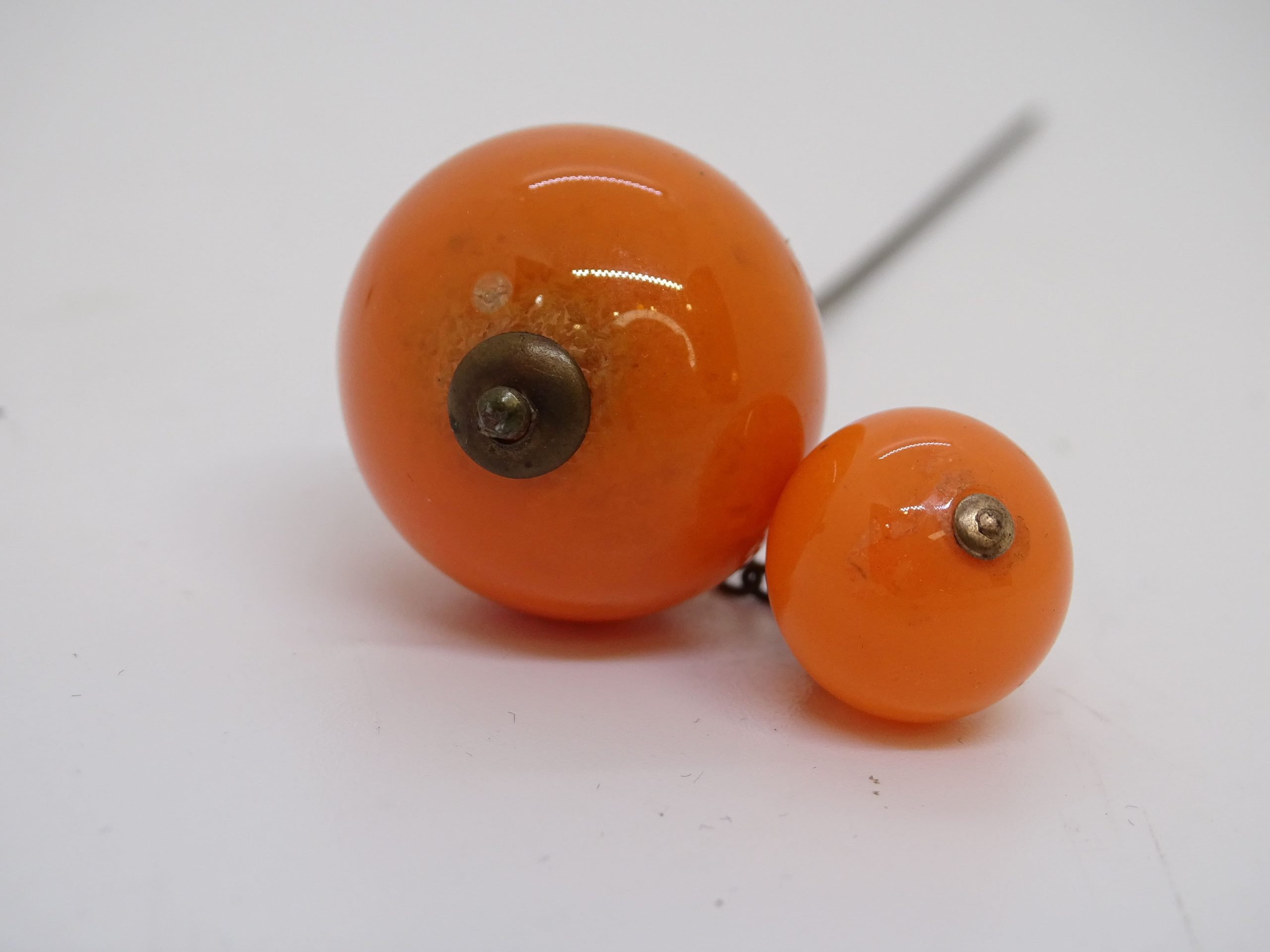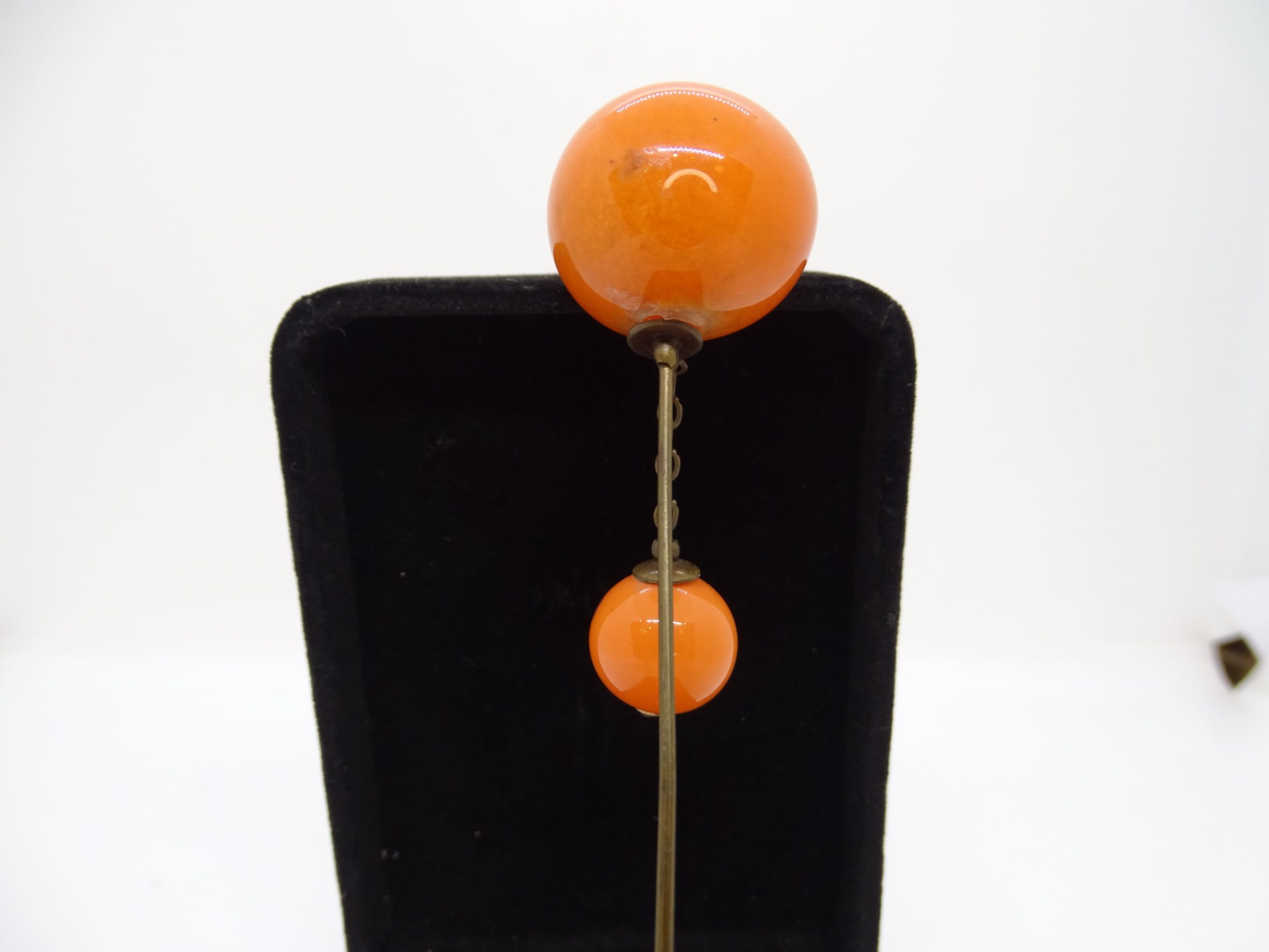 Exquisito alfiler de metal dorado envejecido con esfera de cornalina, datado a principios del siglo XX. Consta de una esfera de cornalina naranja de gran tamaño con una cadena que pende de la base con una bolita también de cornalina al final de la misma, a modo de remate ornamental. El conjunto se dispone sobre una aguja larga vertical de metal en tono dorado envejecido.