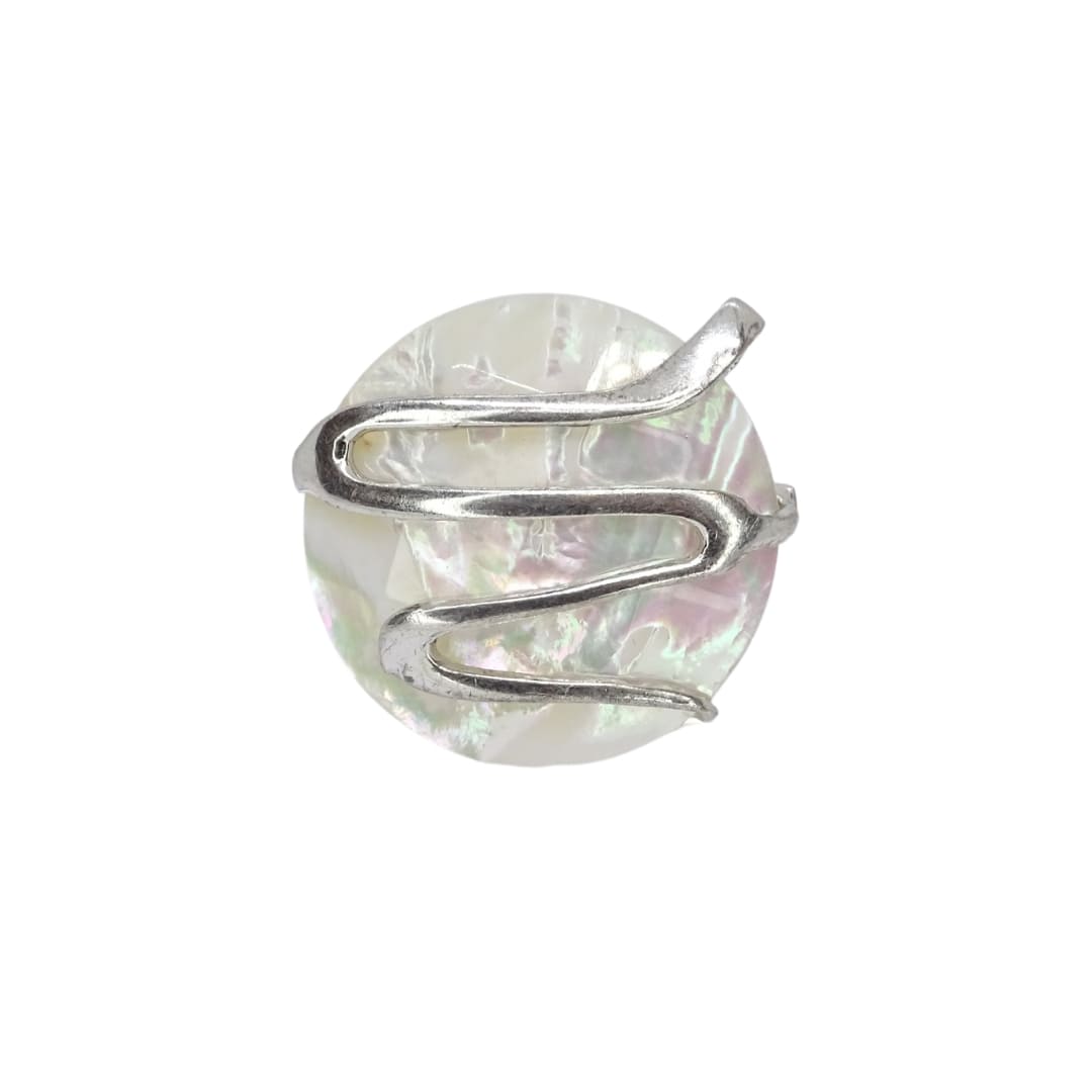 Exquisito y muy refinado anillo para mujer realizado en plata de ley 925 y con una pieza central de nácar. El nácar, de forma ovalada, está encajado de manera fluida con una estructura de plata que parece envolver suavemente la piedra, como una suerte de serpiente. El contraste entre el brillo metálico de la plata y la superficie nacarada crea un efecto visual elegante, resaltando la suavidad y los matices iridiscentes propios del nácar. En el interior, contraste y marca de la casa.