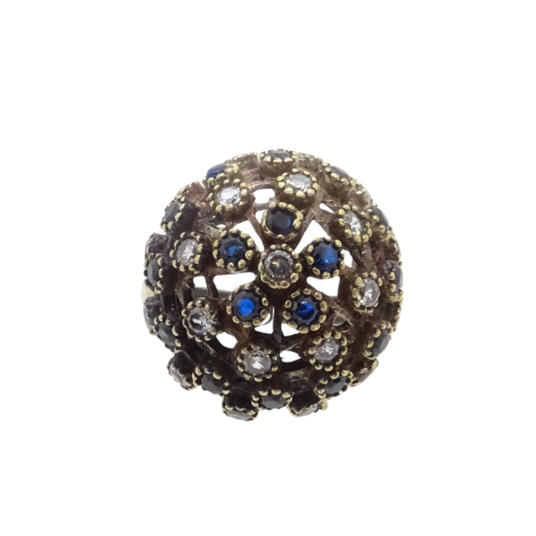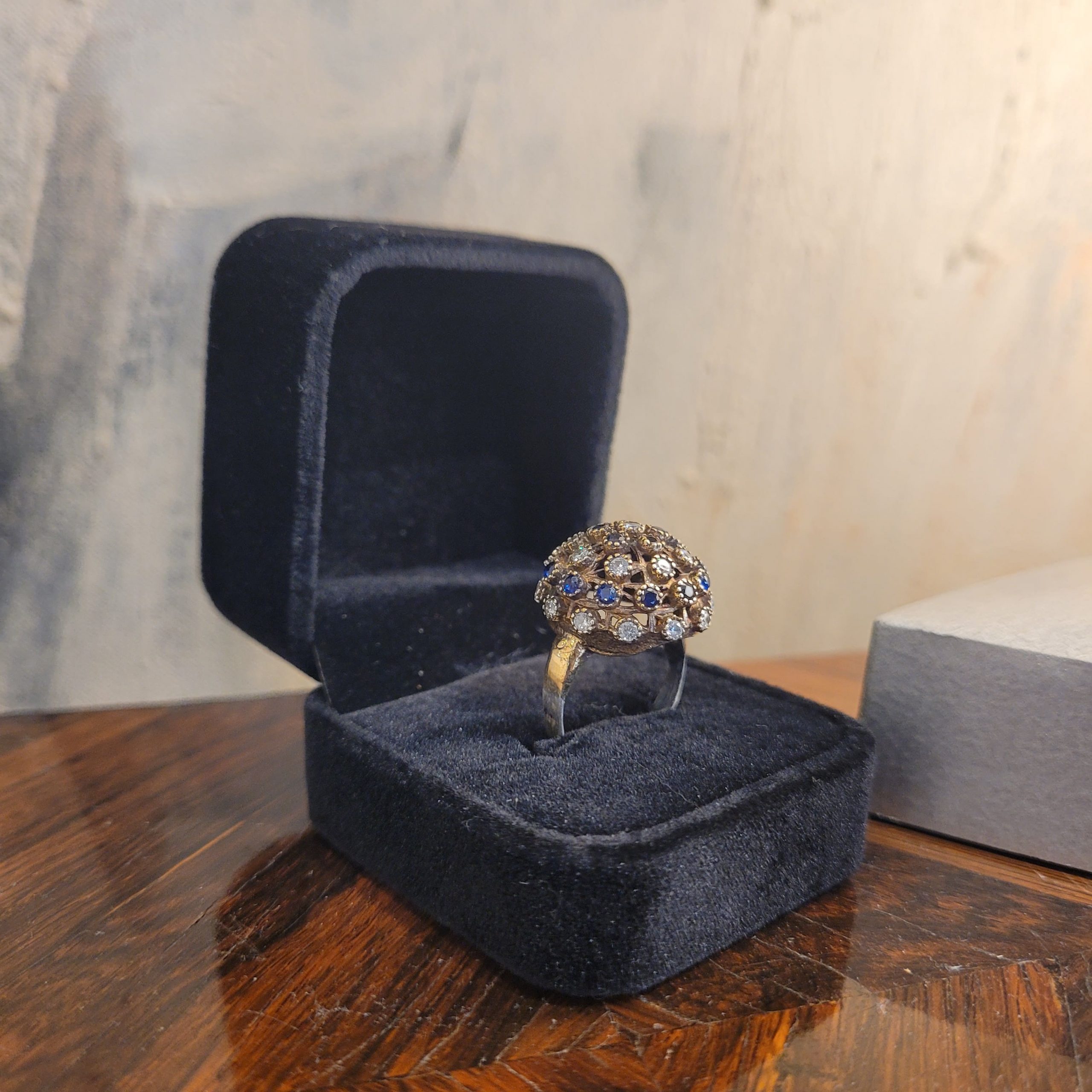 Extraordinario anillo vintage realizado en la Italia del siglo XX. Presenta un complejo diseño circular que evoca un estilo clásico, con un motivo basado en la concentricidad de las hileras de piedras. Destacan las gemas de color zafiro, que se combinan con el color blanco de la circonita. La artesanía italiana en joyería es famosa por su atención al detalle y su estética refinada. Este anillo refleja esos valores con su acabado meticuloso. Un hermoso anillo que aportará belleza y elegancia al llevarlo.