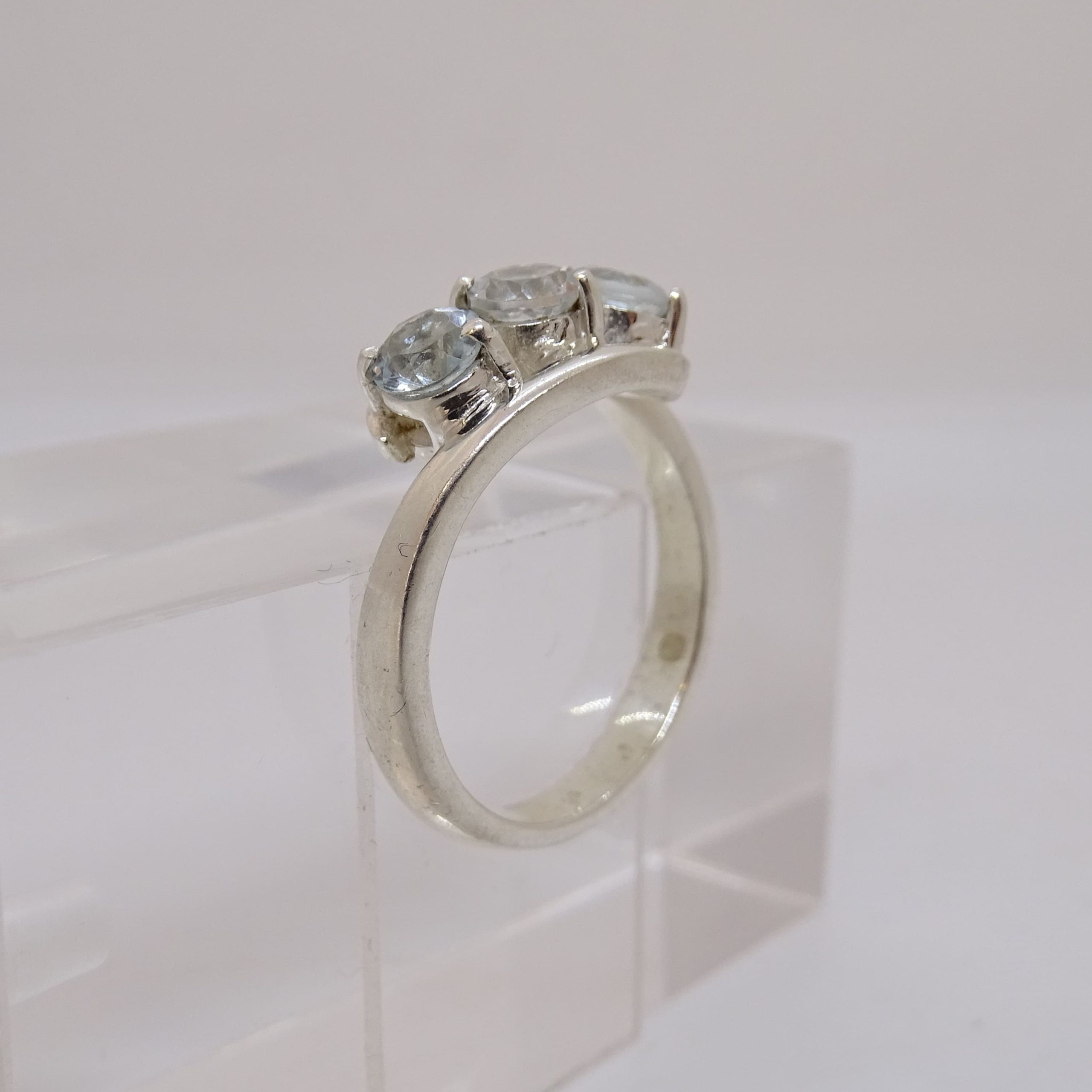 Excepcional anillo trilogía, refinada pieza de joyería italiana de plata. Al interior, contraste de plata 925. Presenta tres grandes gemas de aguamarina en talla brillante.