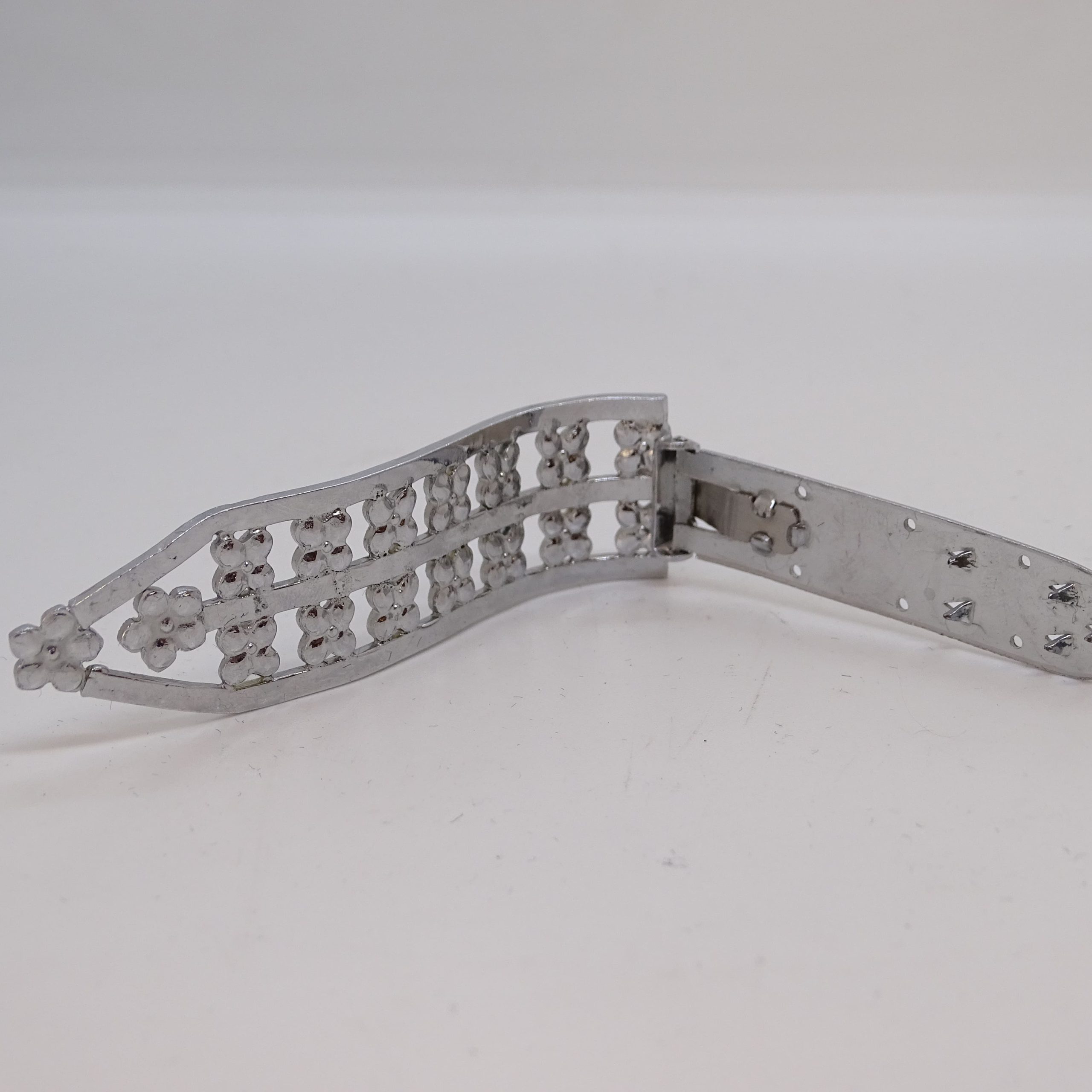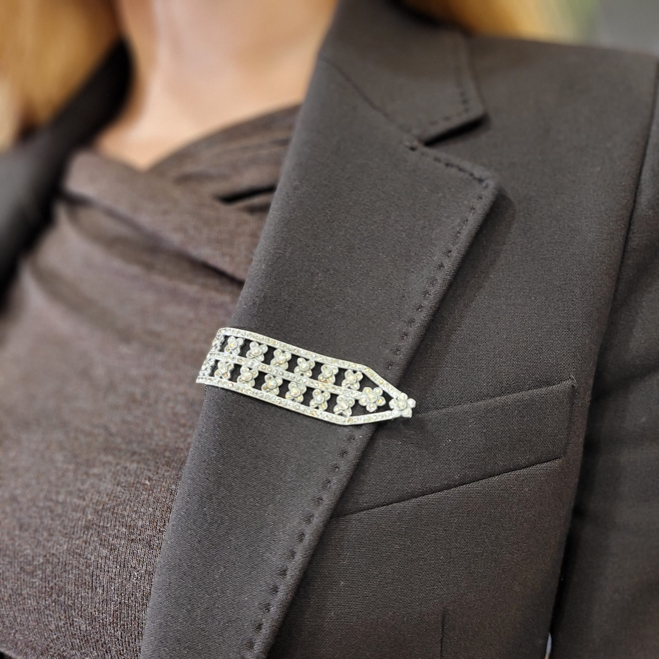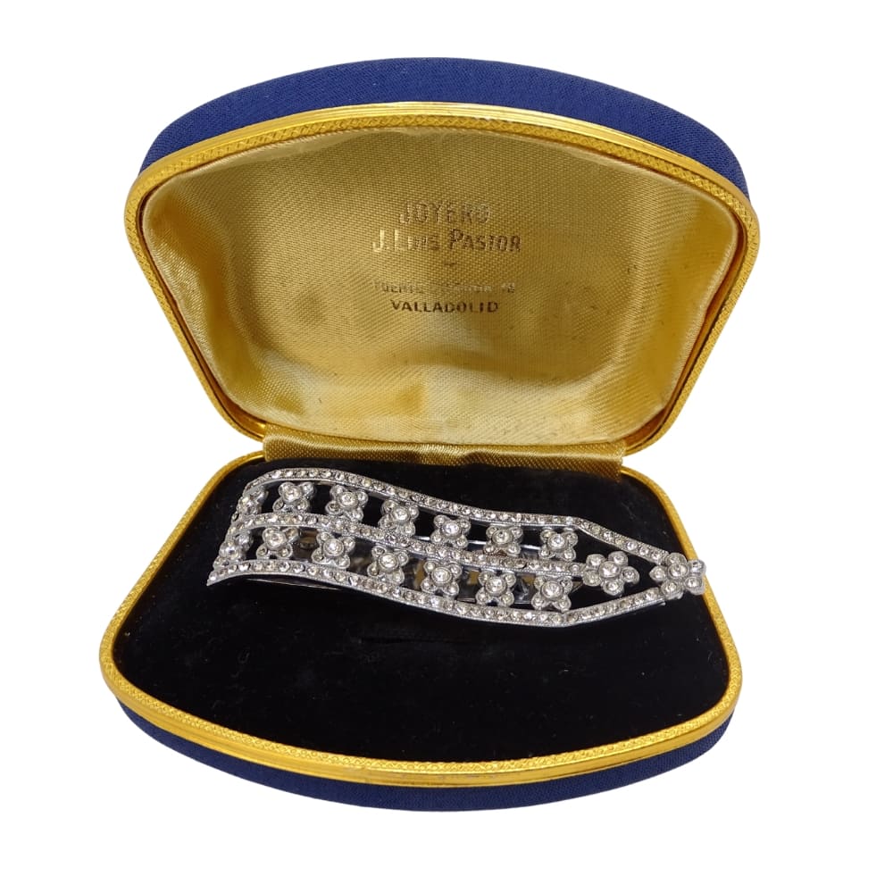De perfil rectangular y punta triangular, presenta una superficie decorada con un refinado pavé de circonitas cúbicas sobre metal plateado, que representa un motivo floral. El entramado destaca por su delicadeza y fina elaboración.