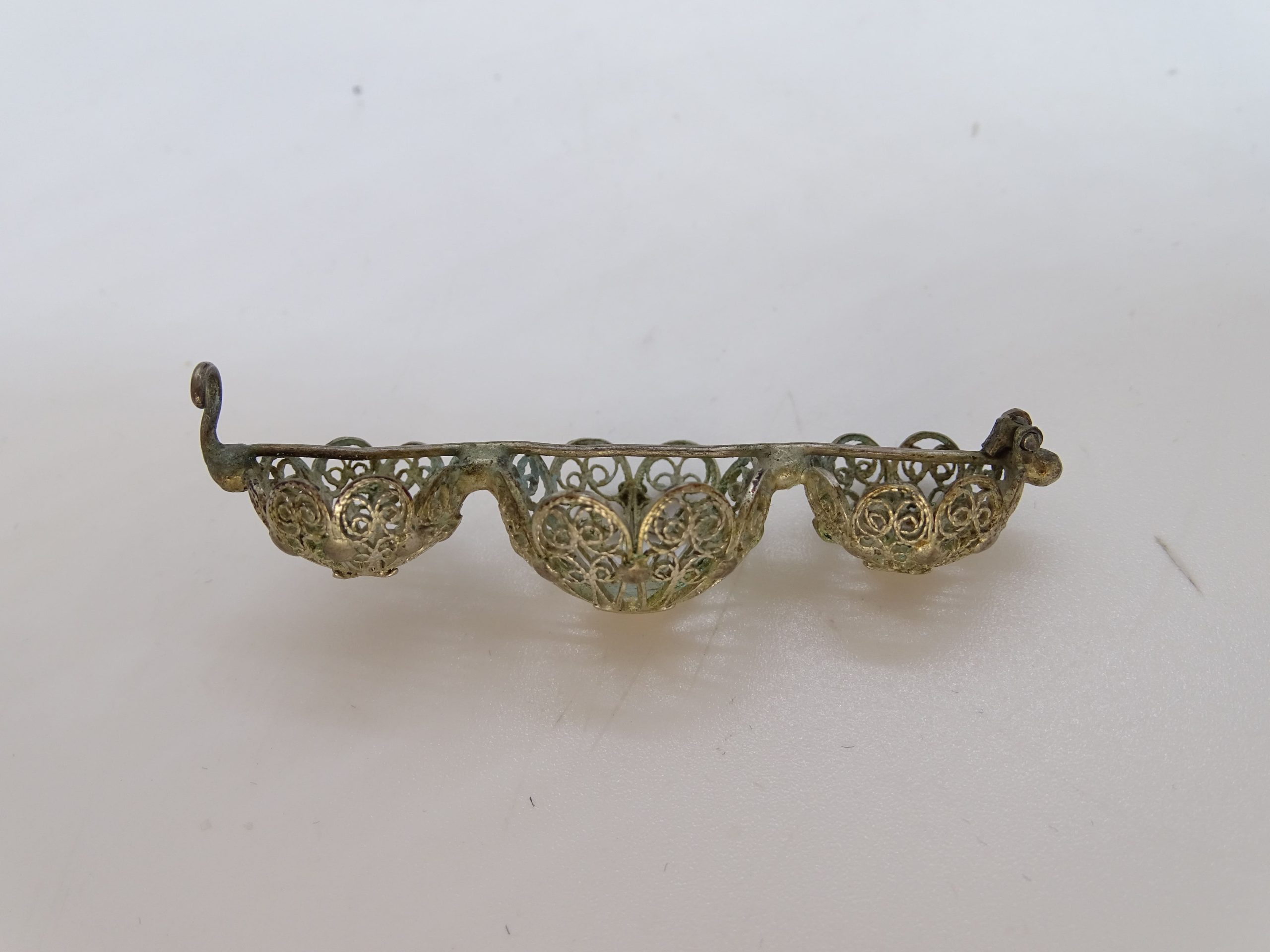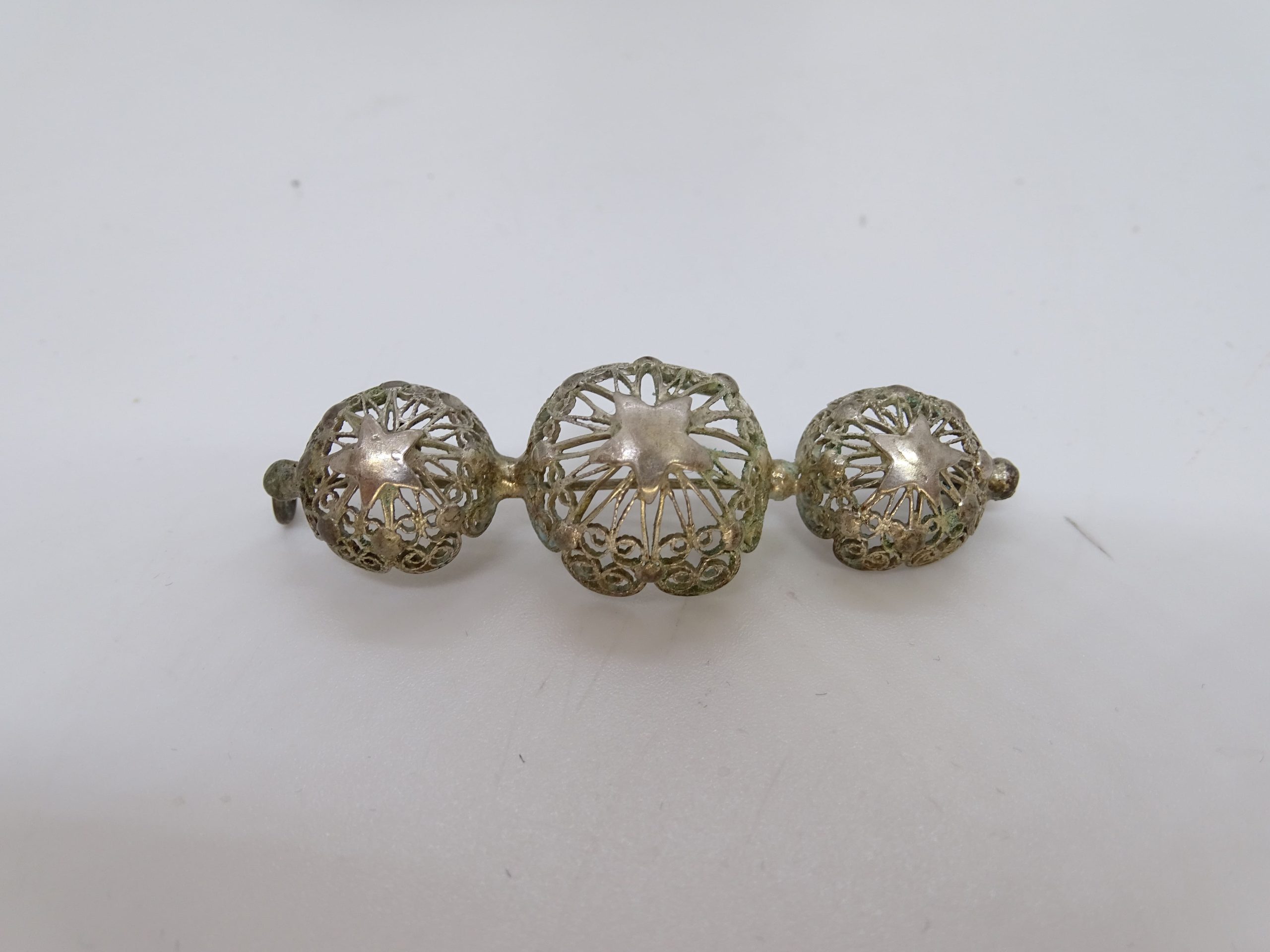 Exquisito broche de plata de ley 925, datado a principios del siglo XX. Consta de tres semiesferas de filigrana dispuestas en eje horizontal, articuladas mediante pequeños engarces. La pieza central, de mayor tamaño, queda flanqueada por dos volúmenes menores, generando un conjunto armónico.