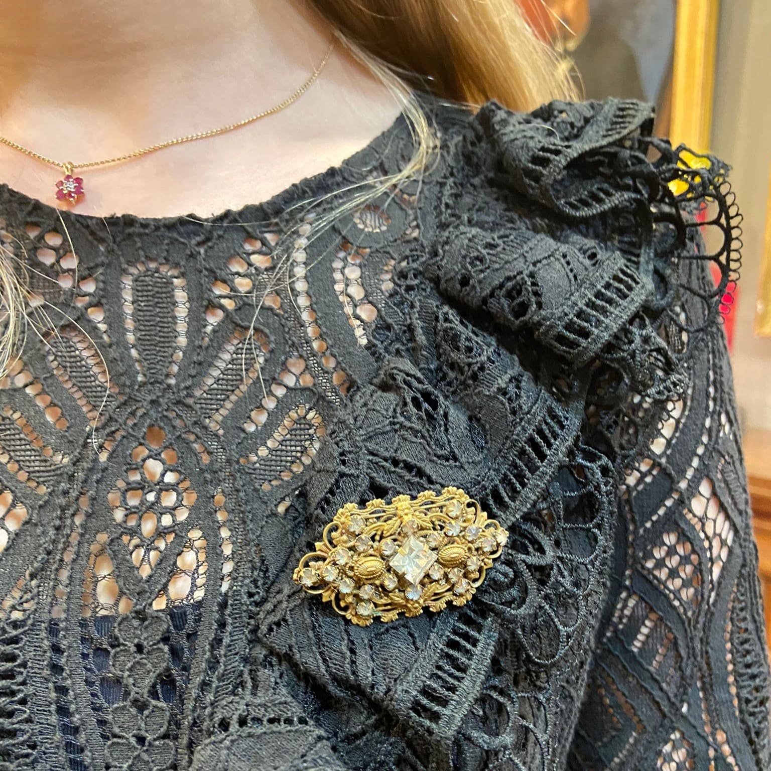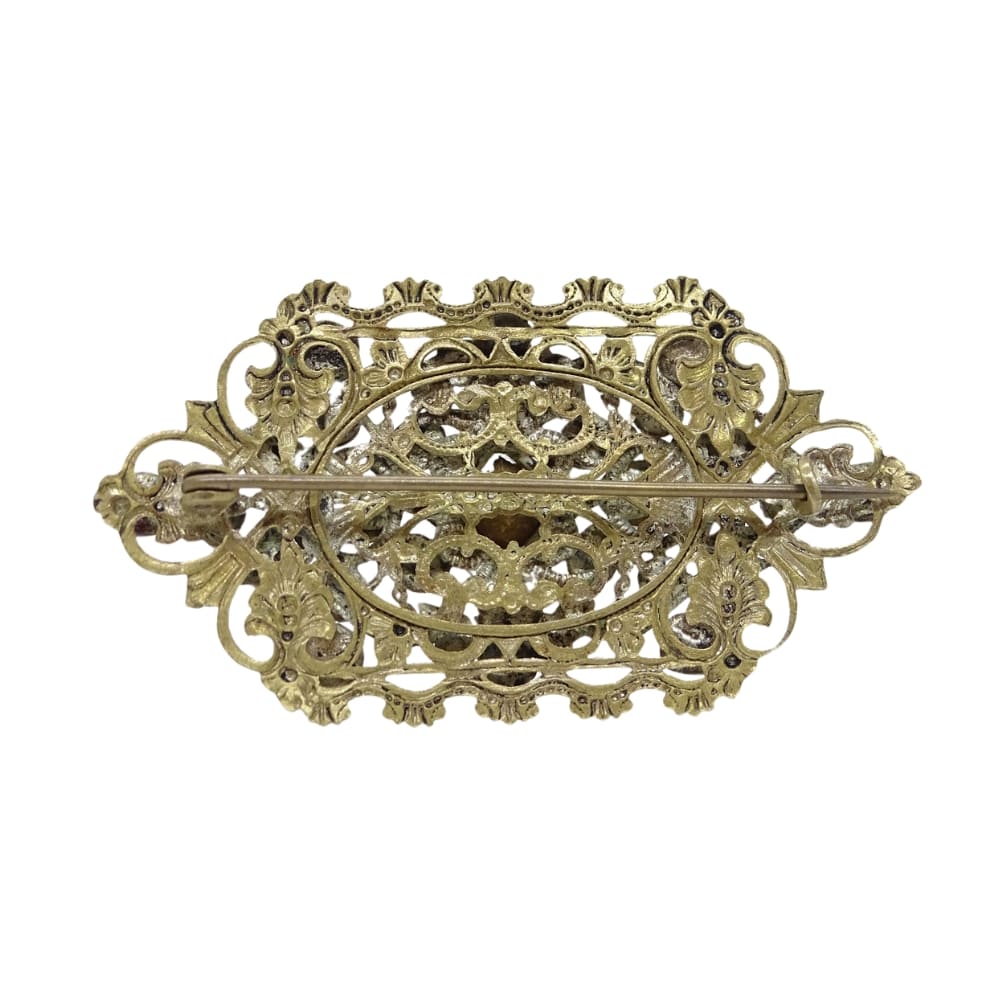 Magnífico y clásico broche de metal dorado con cristal de roca facetado. Presenta un diseño con motivos florales intrincados y 22 cristales redondos engastados. Destaca el gran cristal piramidal del centro. Factura francesa del siglo XIX.