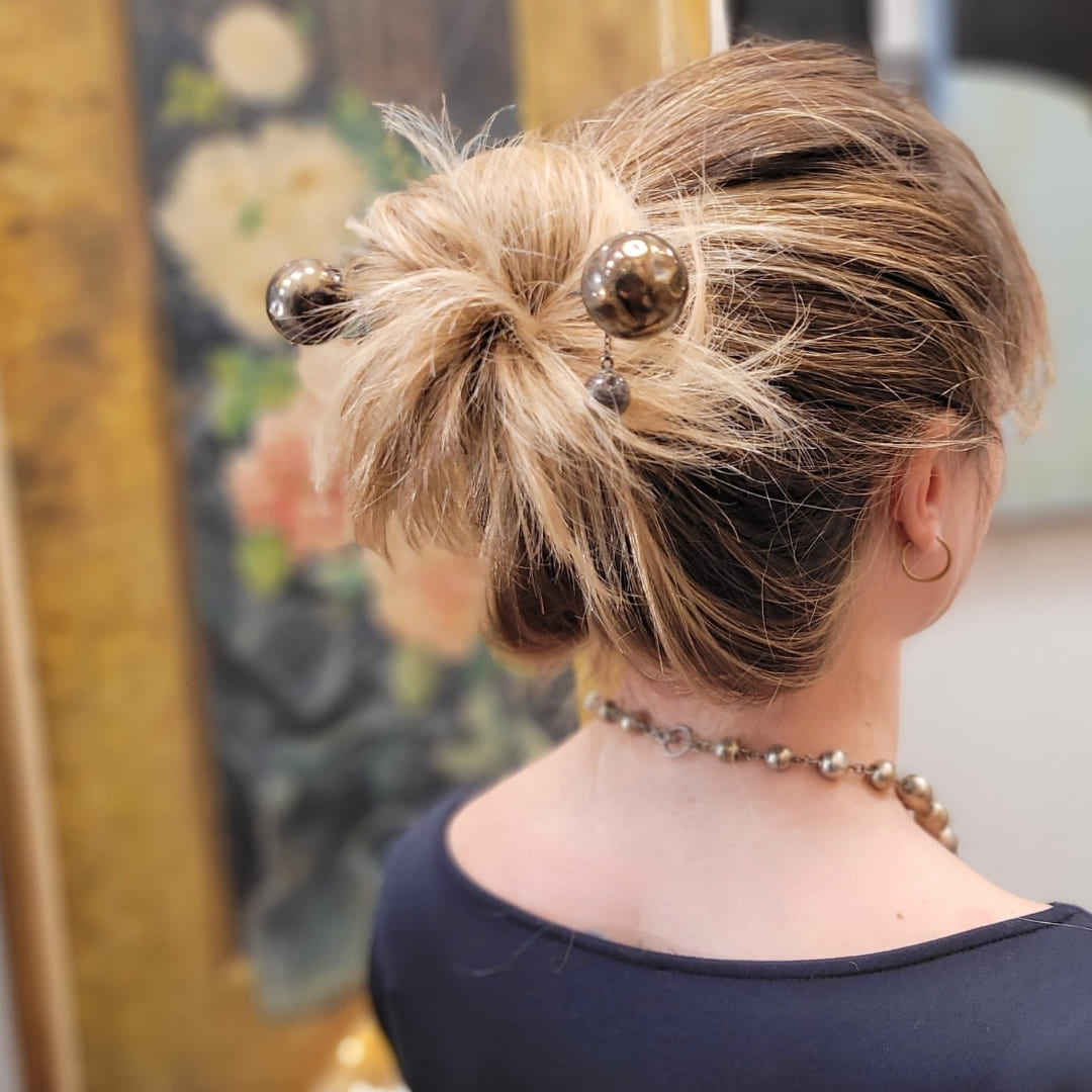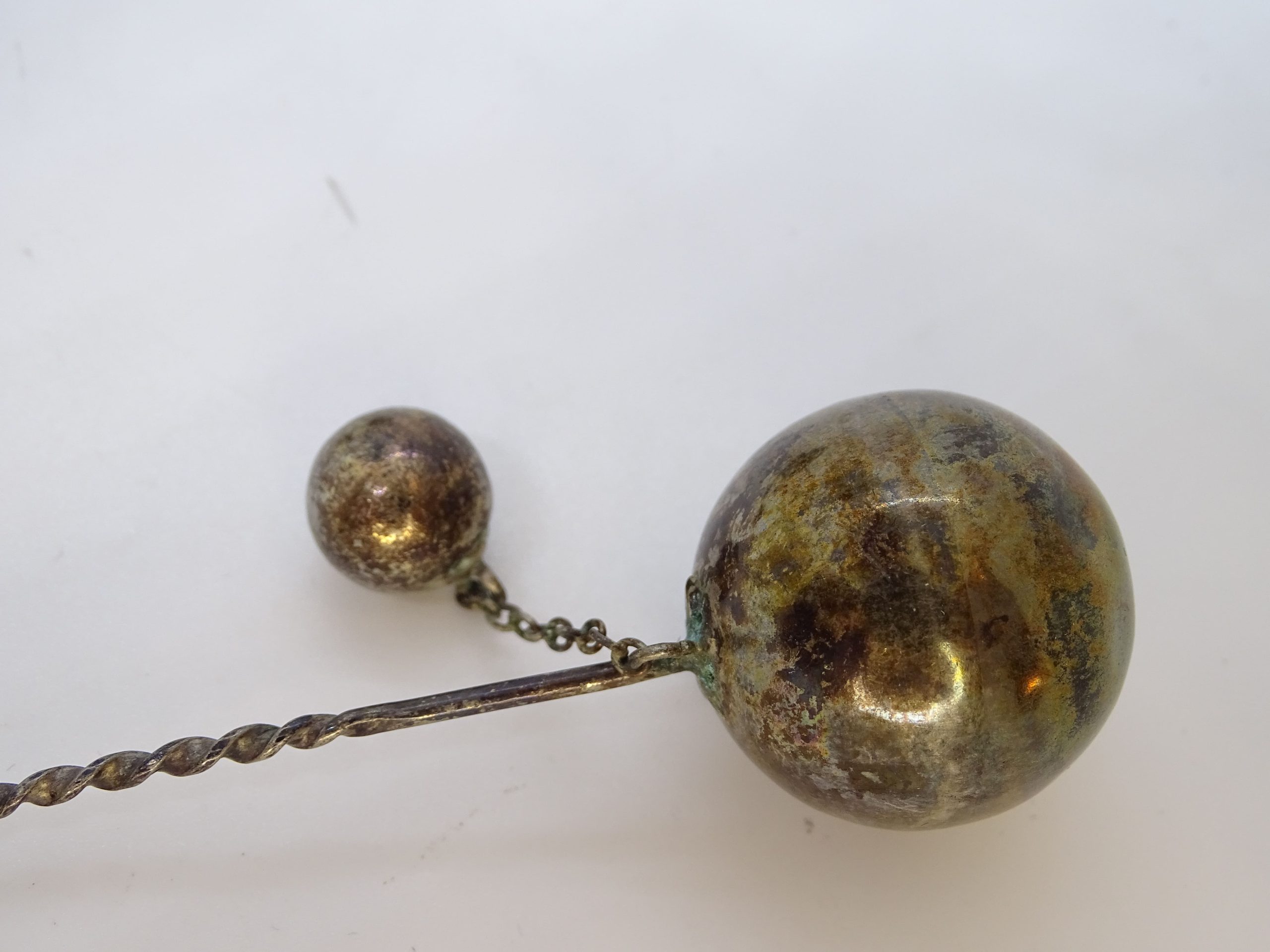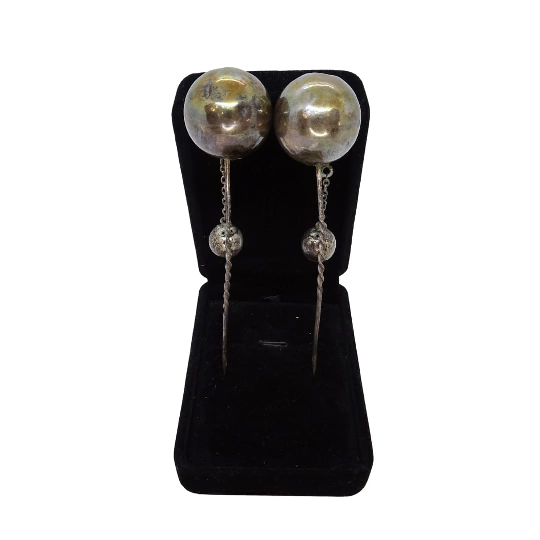 Exquisita pareja de alfileres de plata de ley 925 con esferas, datado a principios del siglo XX. Constan de una esfera de plata grande con una cadena que pende de la base con una bolita como remate de cada una. El conjunto se dispone sobre una aguja larga vertical con una franja que gira sobre sí misma a modo de decoración.